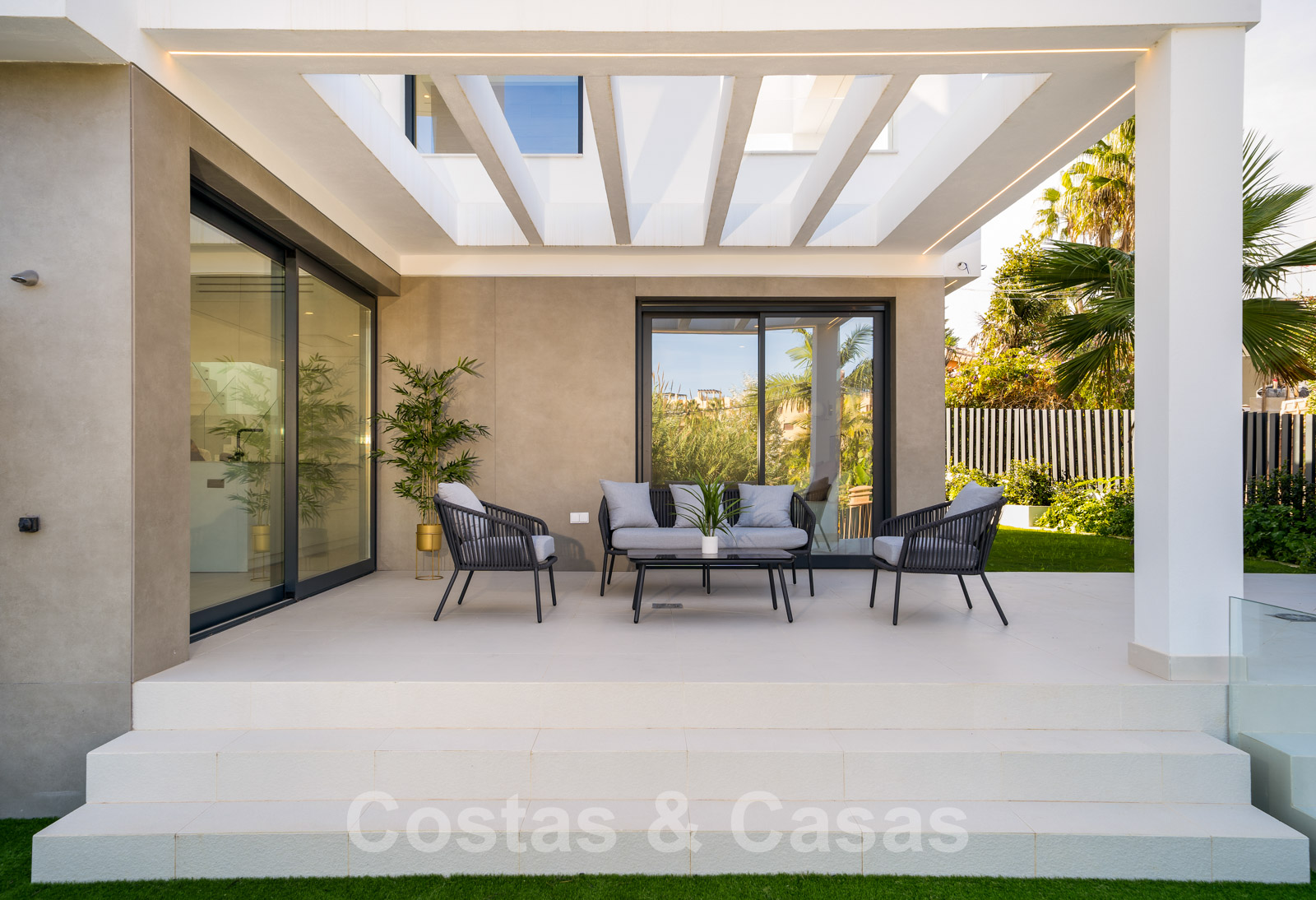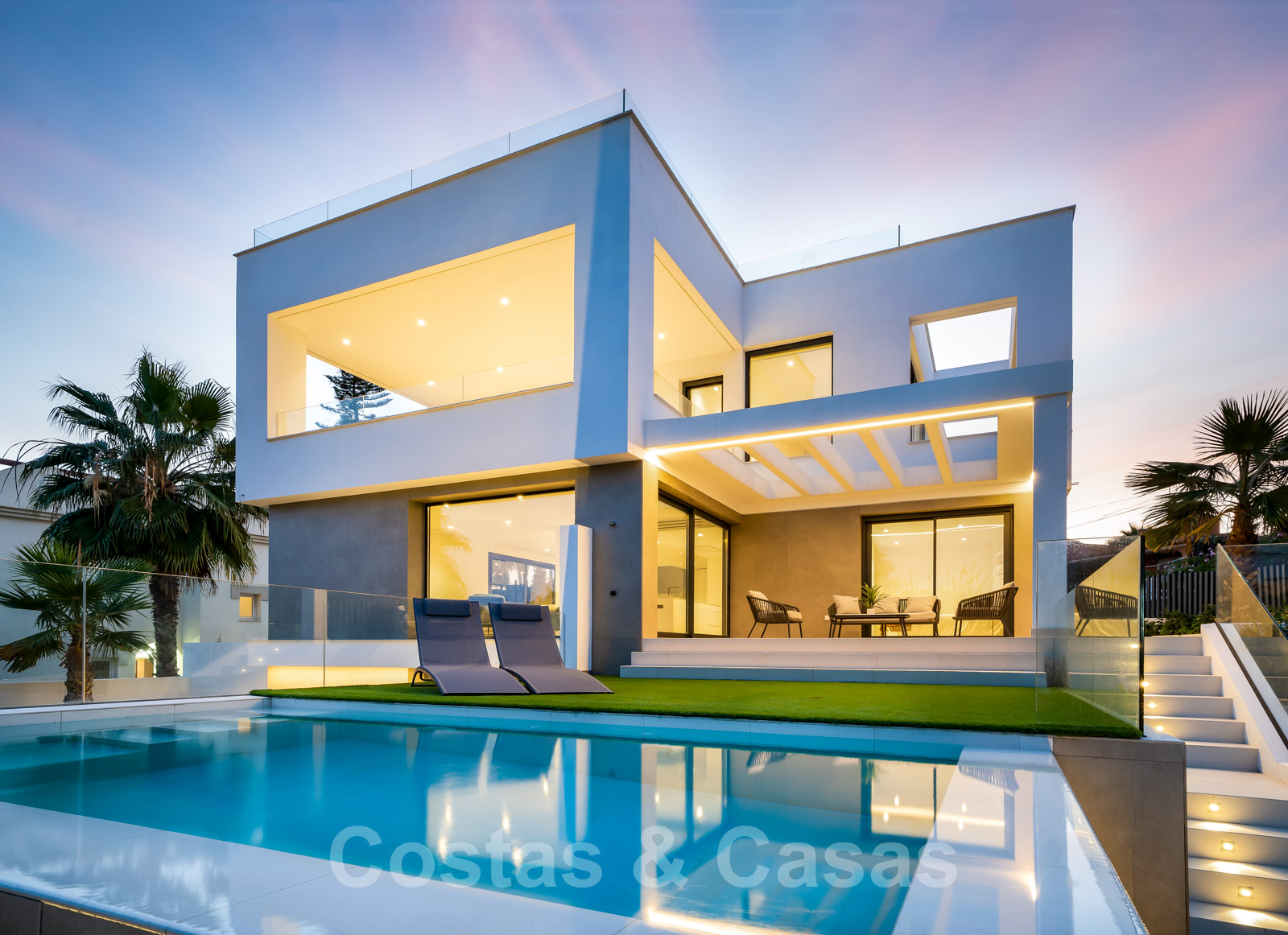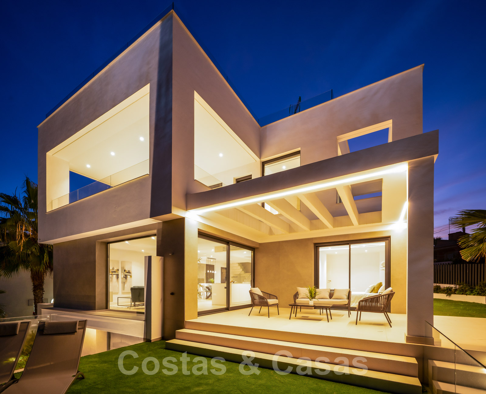 Zeer prijsgunstige, nieuwe, instapklare, moderne, beachside villa te koop op de New Golden Mile tussen Marbella en Estepona, op een steenworp van het strand