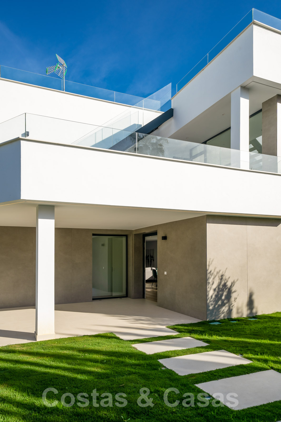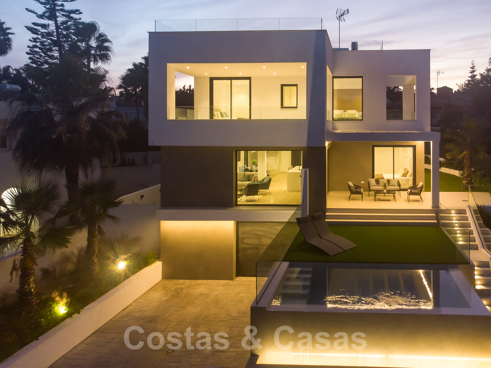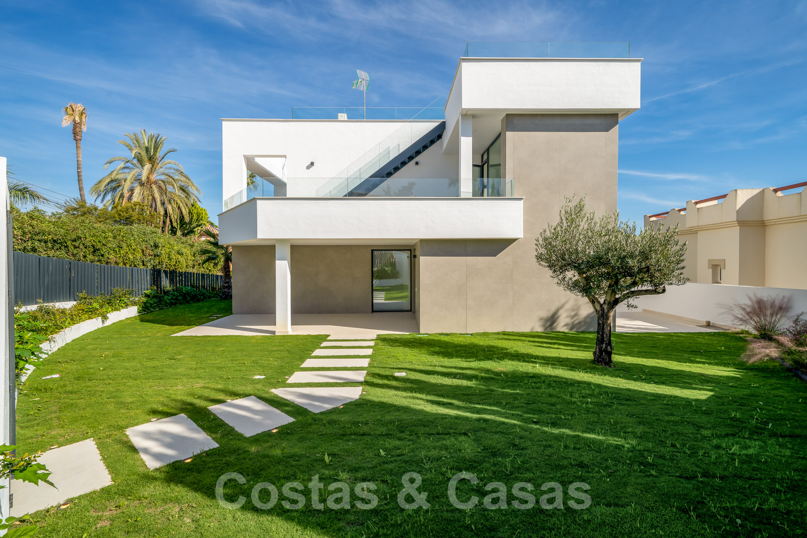 Zeer prijsgunstige, nieuwe, instapklare, moderne, beachside villa te koop op de New Golden Mile tussen Marbella en Estepona, op een steenworp van het strand