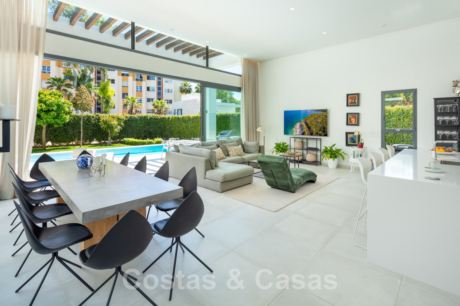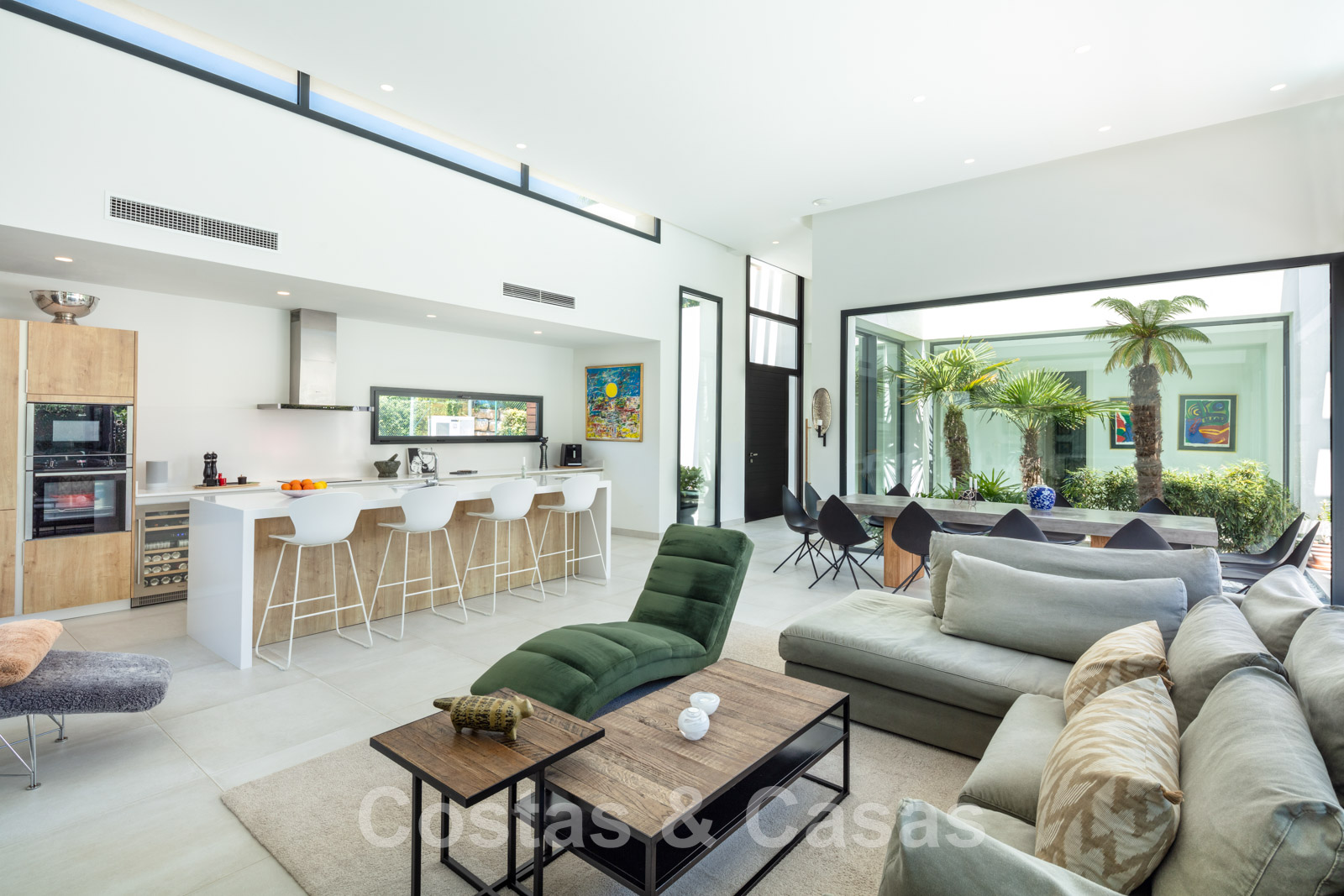 • Woonkamer met een plafondhoogte van 4.50m, een TV lounge en een geïntegreerde eetruimte.