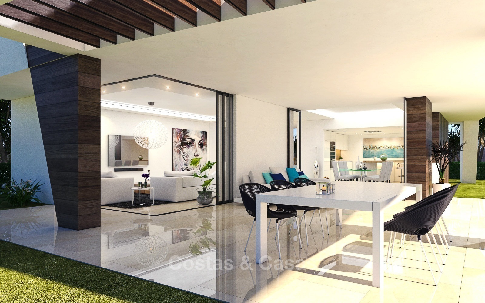 De villa's bieden een open lay-out met grote ramen met verborgen rails in de vloer in de woonkamer om de binnenruimte te combineren met het ruime terras om een ??grote open ruimte te creëren. De villa's liggen op het zuiden.
