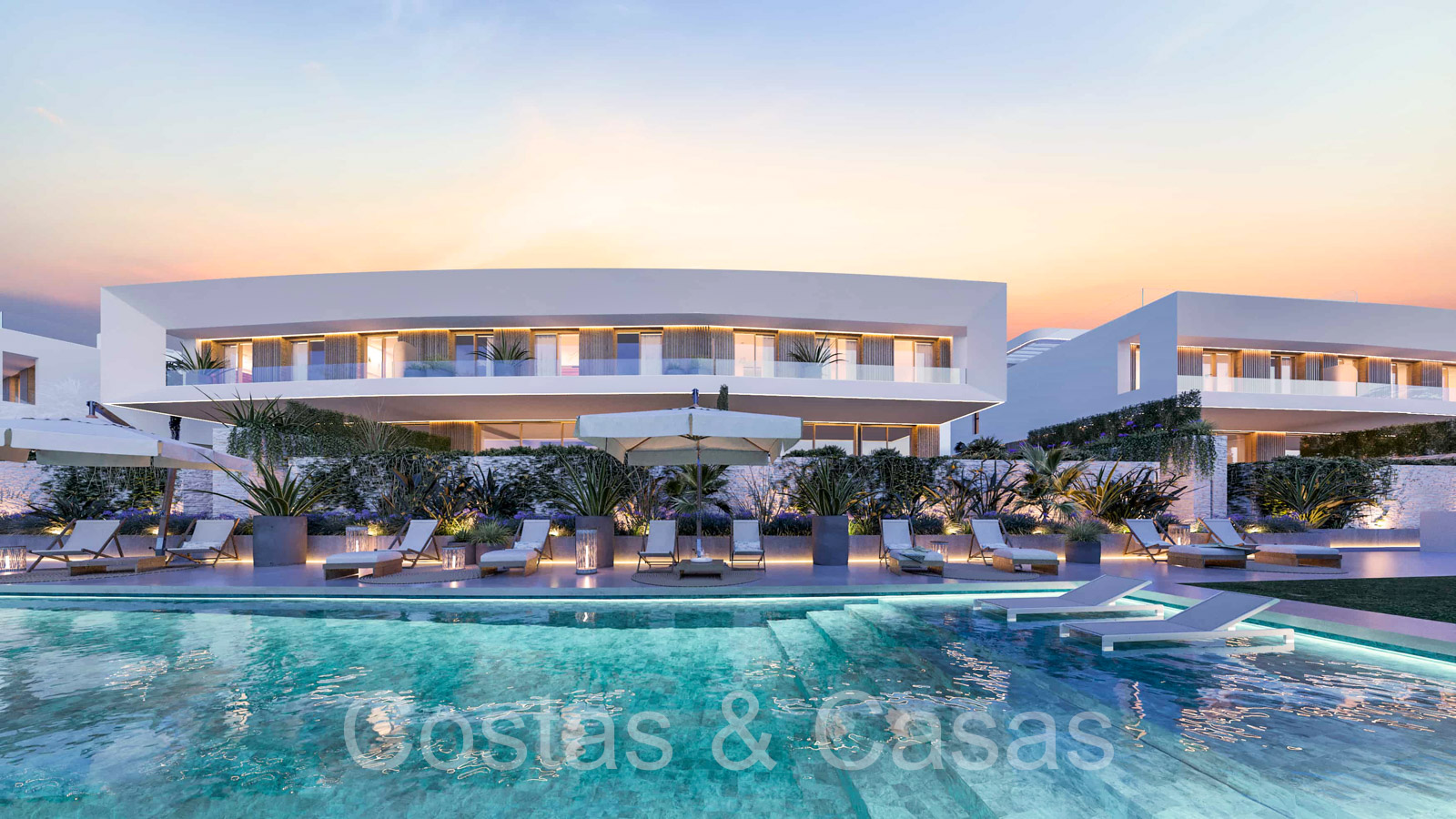 De bewoners van het complex genieten bovendien van gemeenschappelijke tuinen, een overloopzwembad, fitnessruimte en spavoorzieningen.