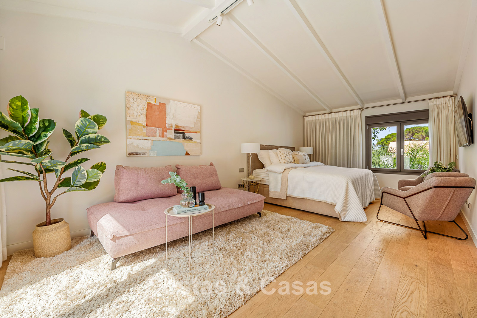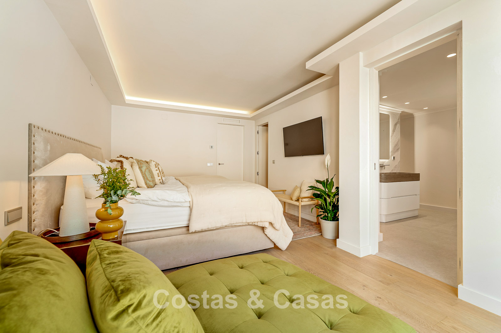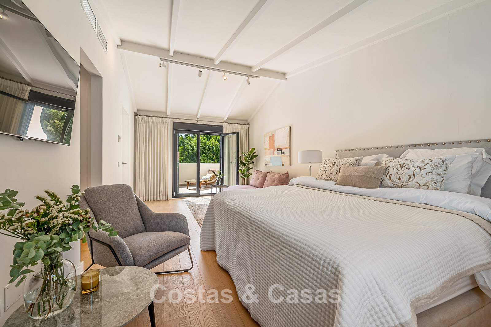De royale slaapkamer op de bovenste verdieping voorziet een eigen zithoek en directe toegang tot een ruim terras, vanwaar je geniet van prachtig zeezicht.