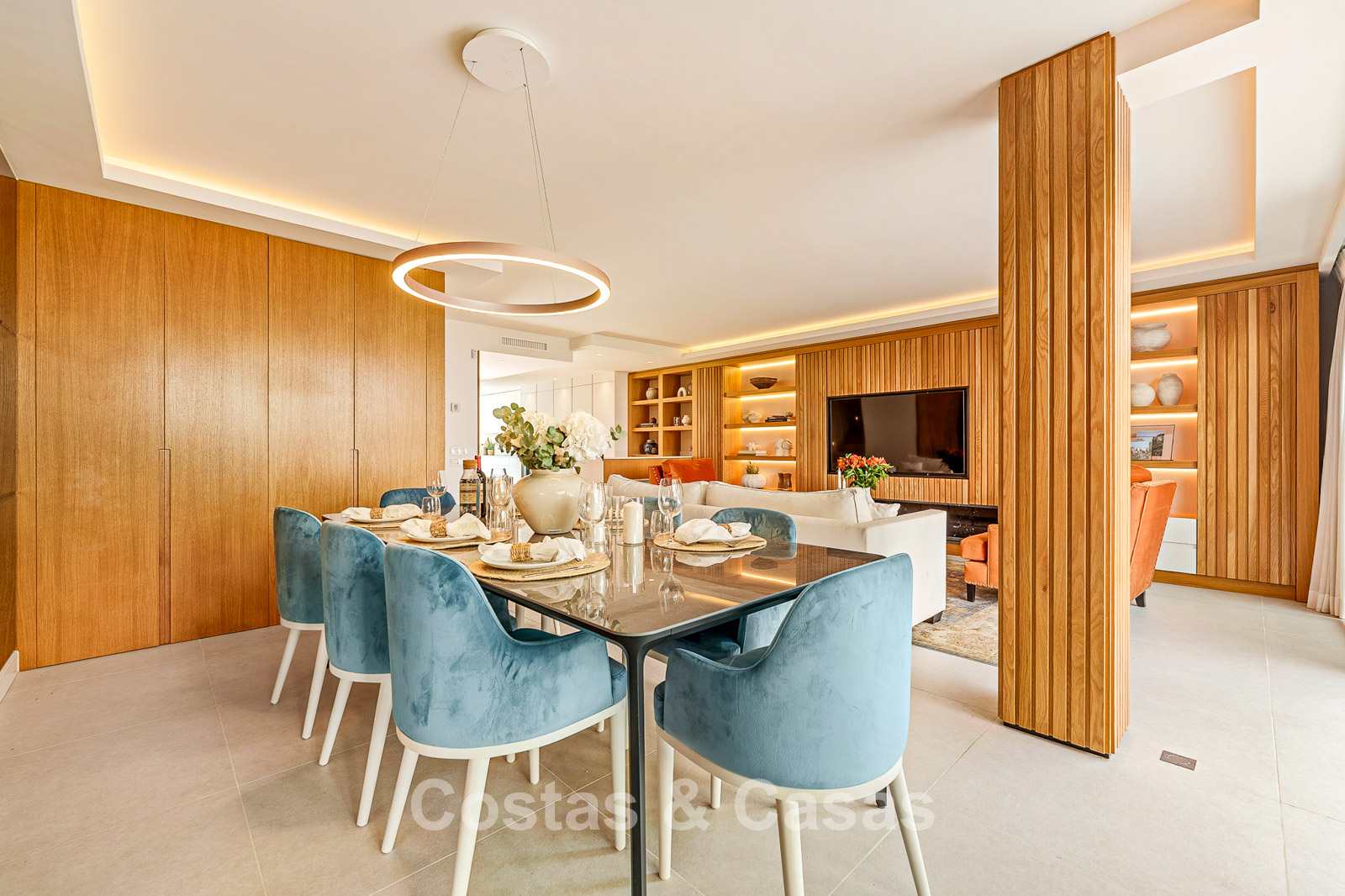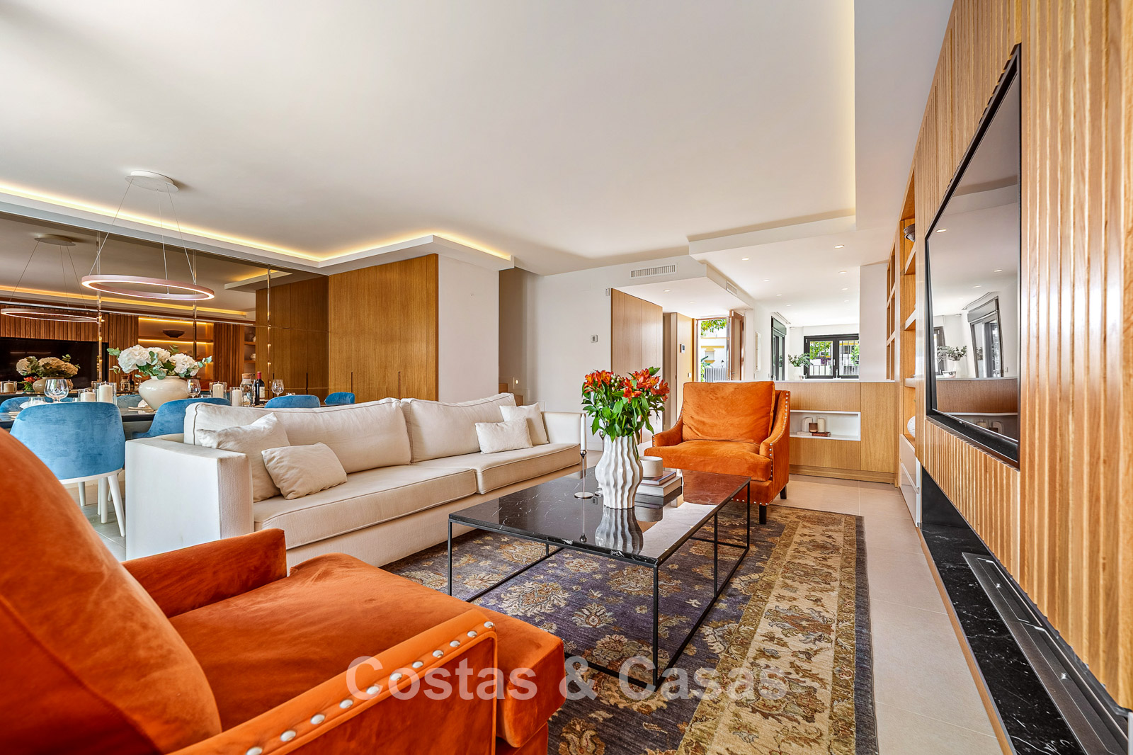 Open plan leefruimte met woon- en eetruimte.
