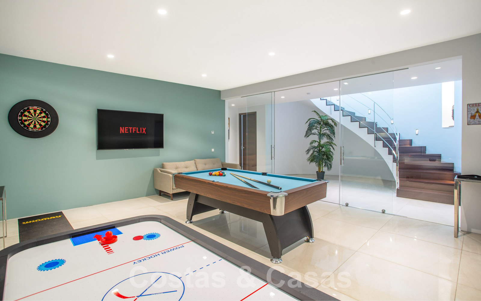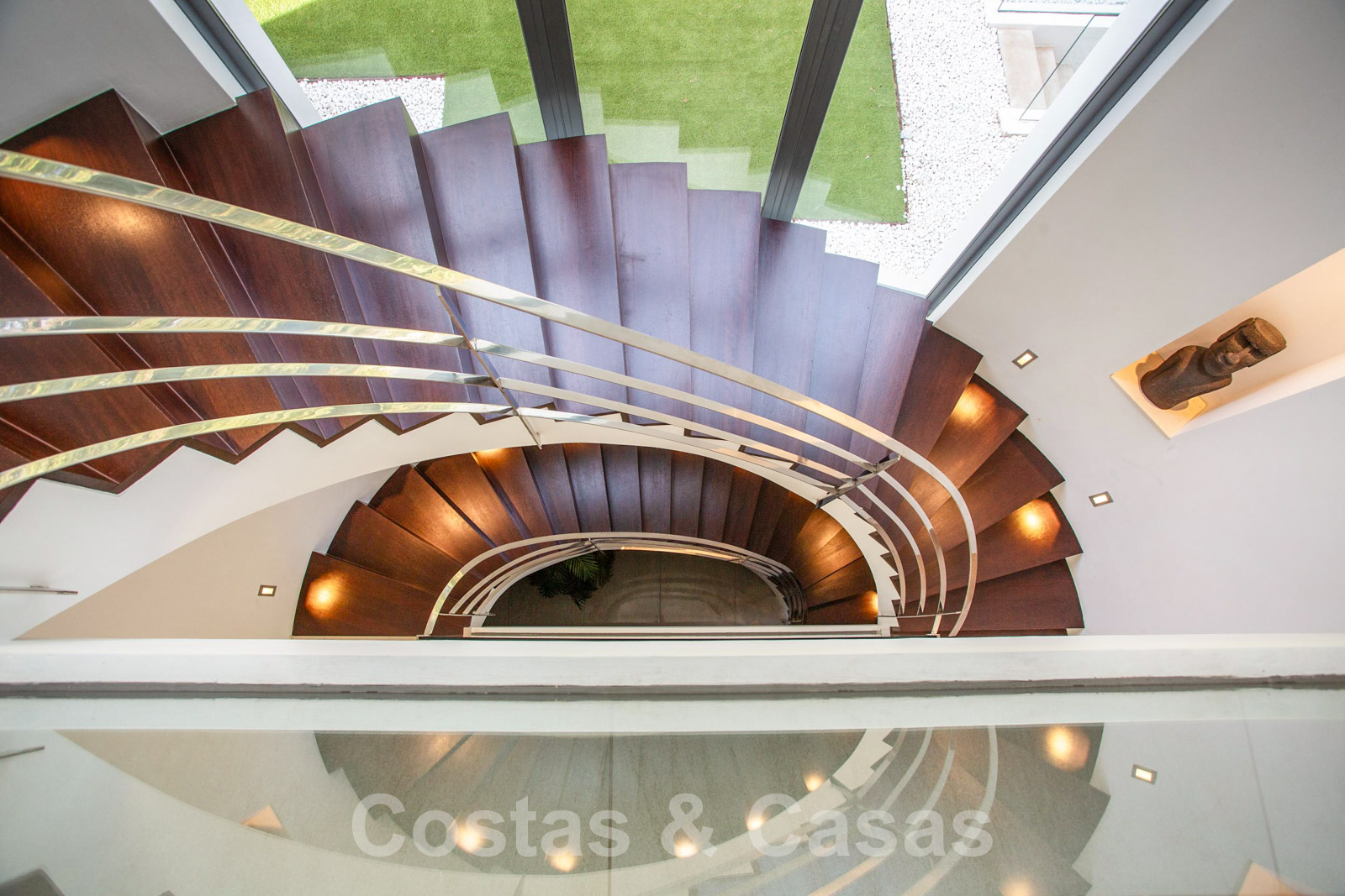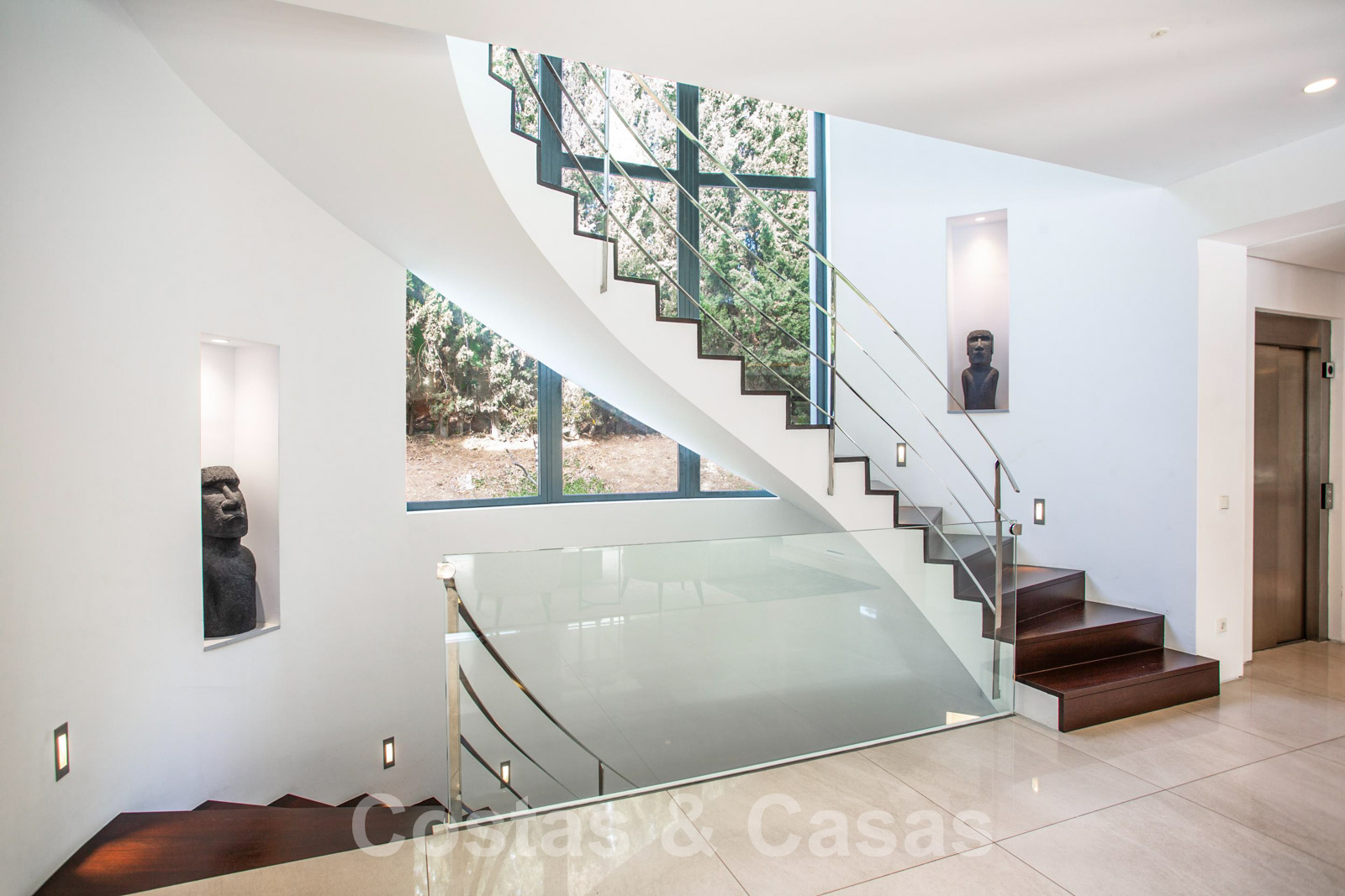 • Je komt meteen binnen in de grote leefruimte die door middel van een driedubbelhoge traphal in connectie staat met de andere verdiepingen van de villa.