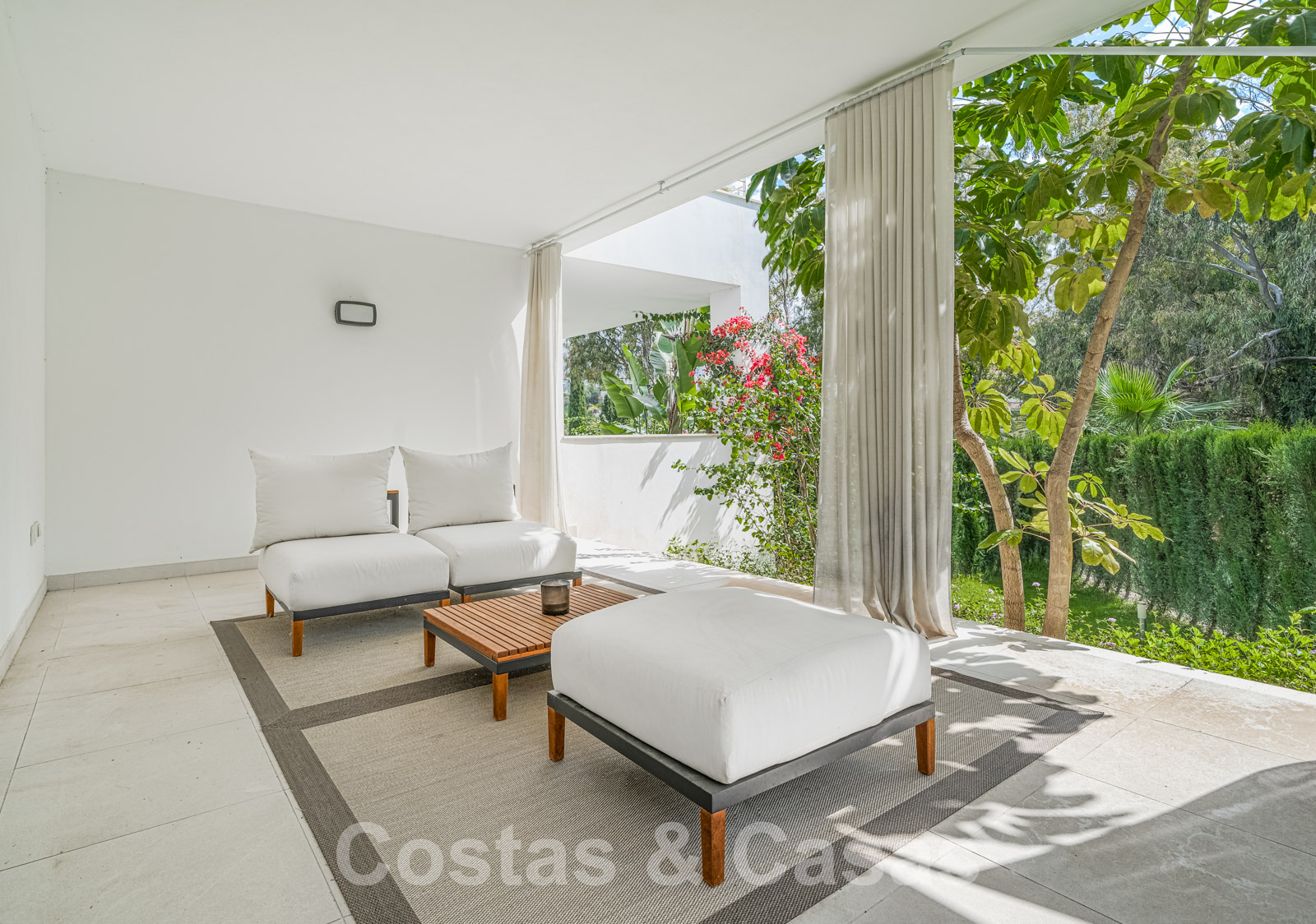 Overdekt terras uitgerust met lounge en toegang tot de tuin.