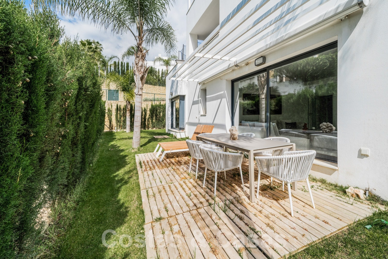 Lateraal zonneterras met een ‘al fresco dining’ area en ligstoelen.