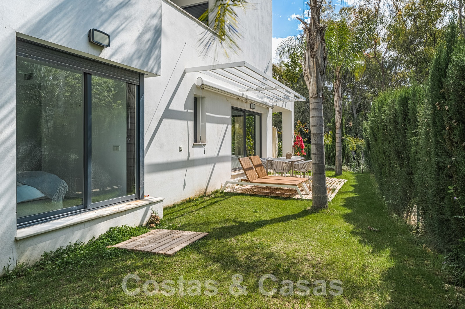 Bedienbare zonneweringen op het terras.