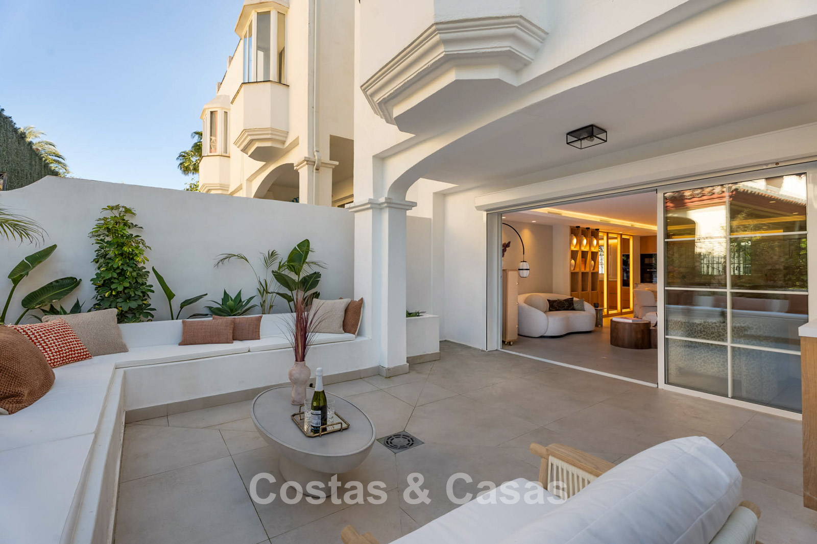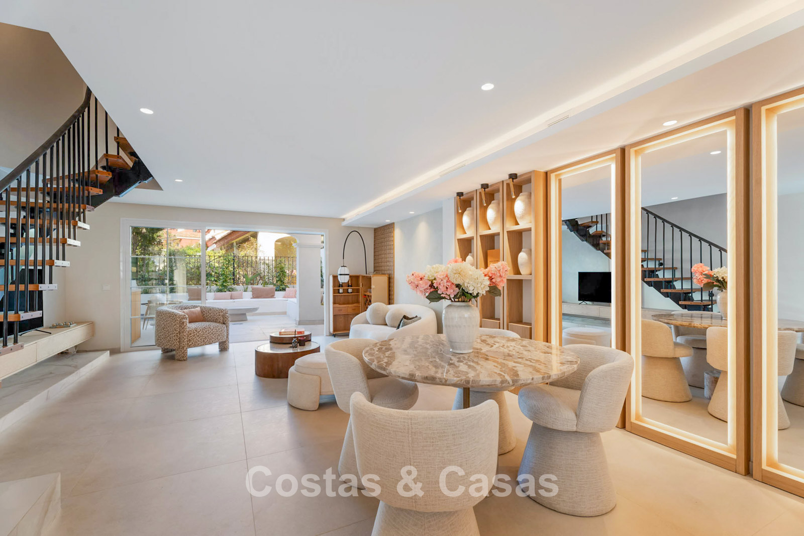 De grote glazen schuifdeuren laten een overvloed aan natuurlijk licht binnen en creëren een naadloze overgang tussen het stijlvolle interieur en het zonnige terras buiten.