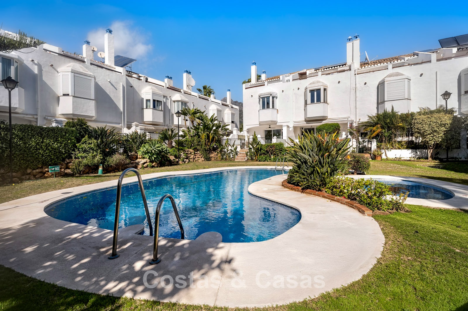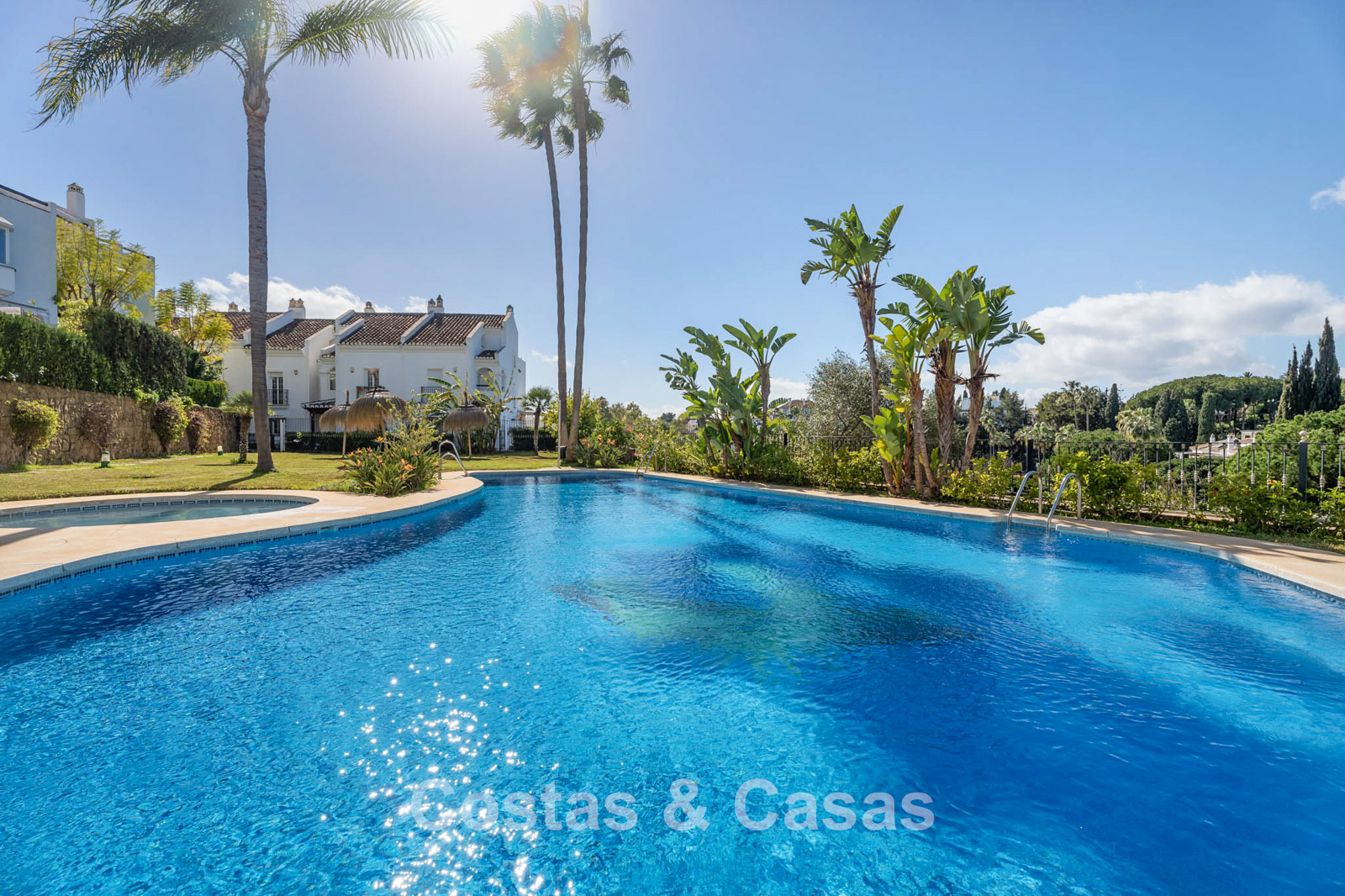 Het complex beschikt over twee gemeenschappelijke zwembaden, omgeven door prachtig aangelegde tuinen met tropische planten en geplaveide paden.