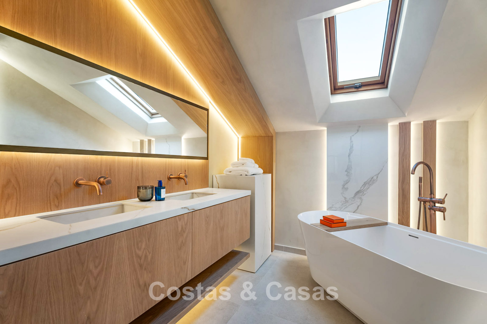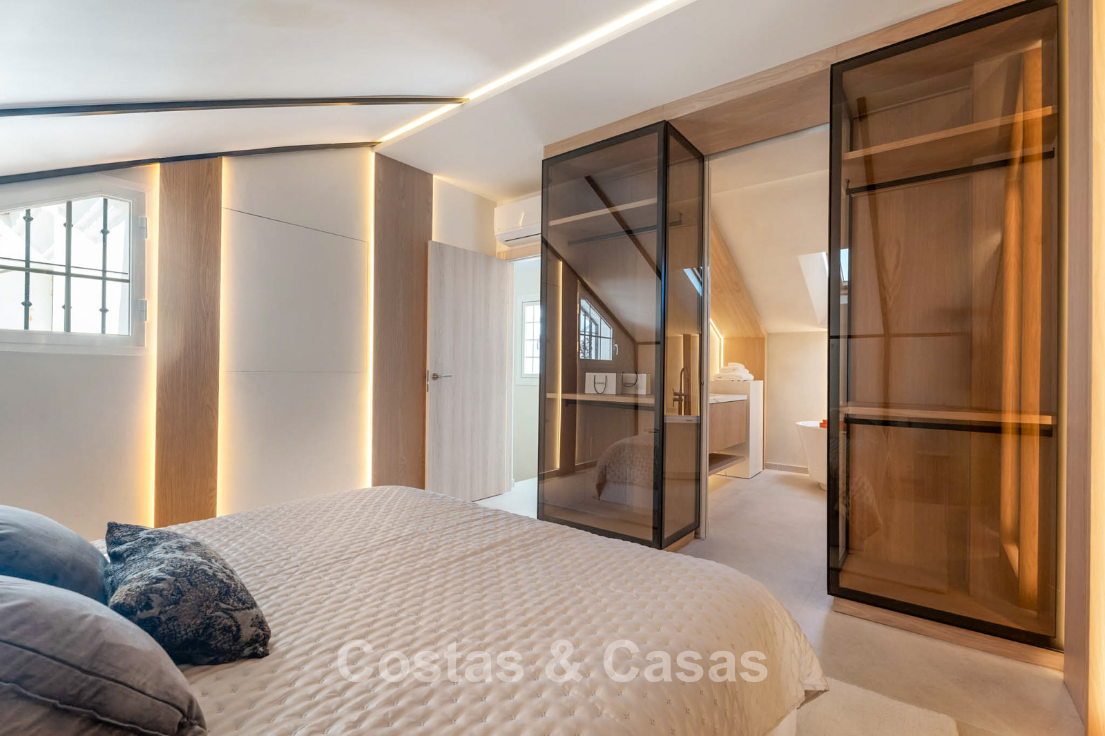 De master suite bevindt zich op de bovenste verdieping en voorziet hoge plafonds, een luxueuze en-suite badkamer met een vrijstaand bad en dubbele wastafel.