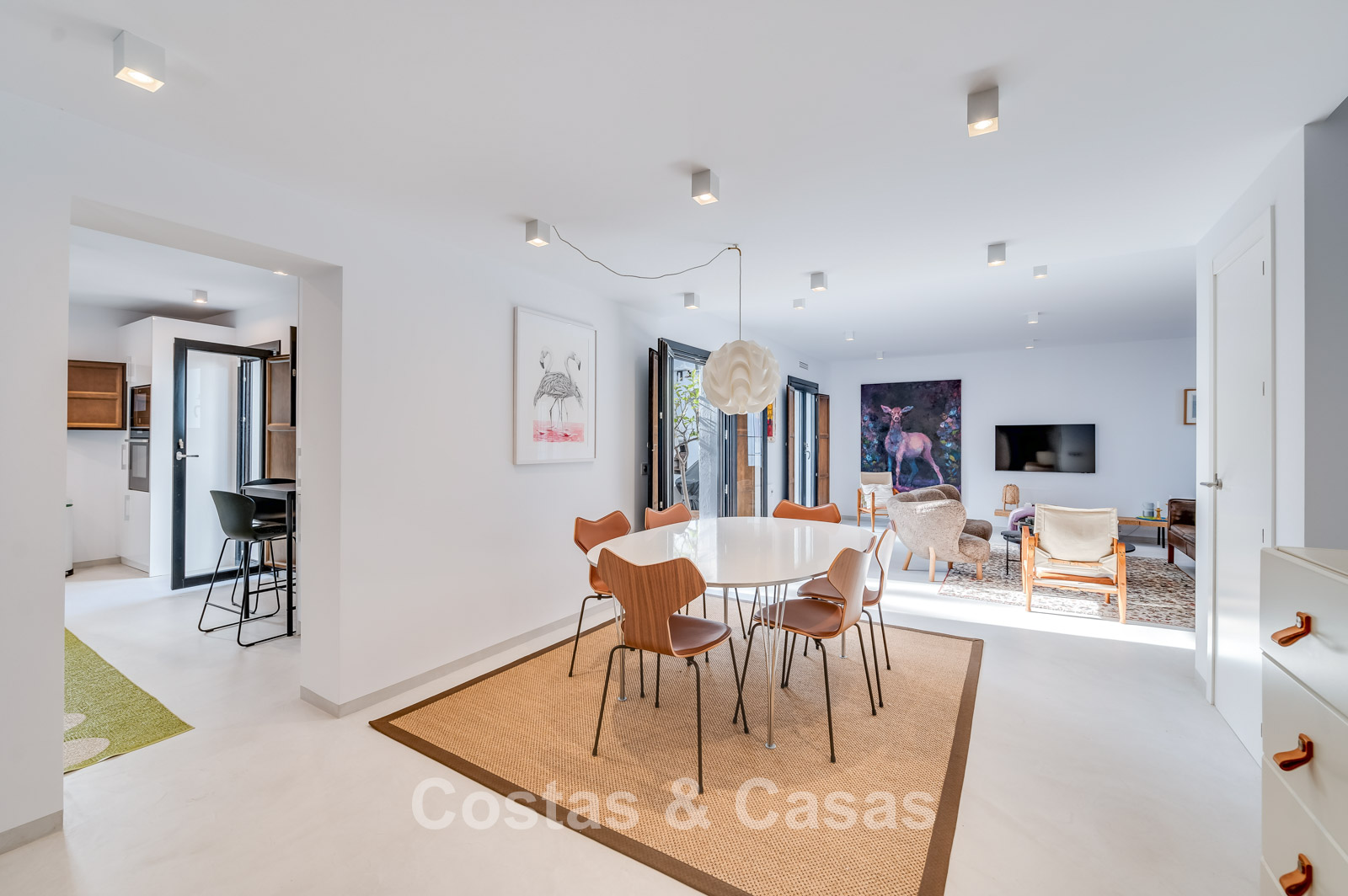 Grote glazen schuifdeuren geven toegang tot een ruime, zonovergoten patio in Andalusische stijl, een privé-oase waar je kunt dineren, ontspannen en volop kunt genieten van het mediterrane klimaat.