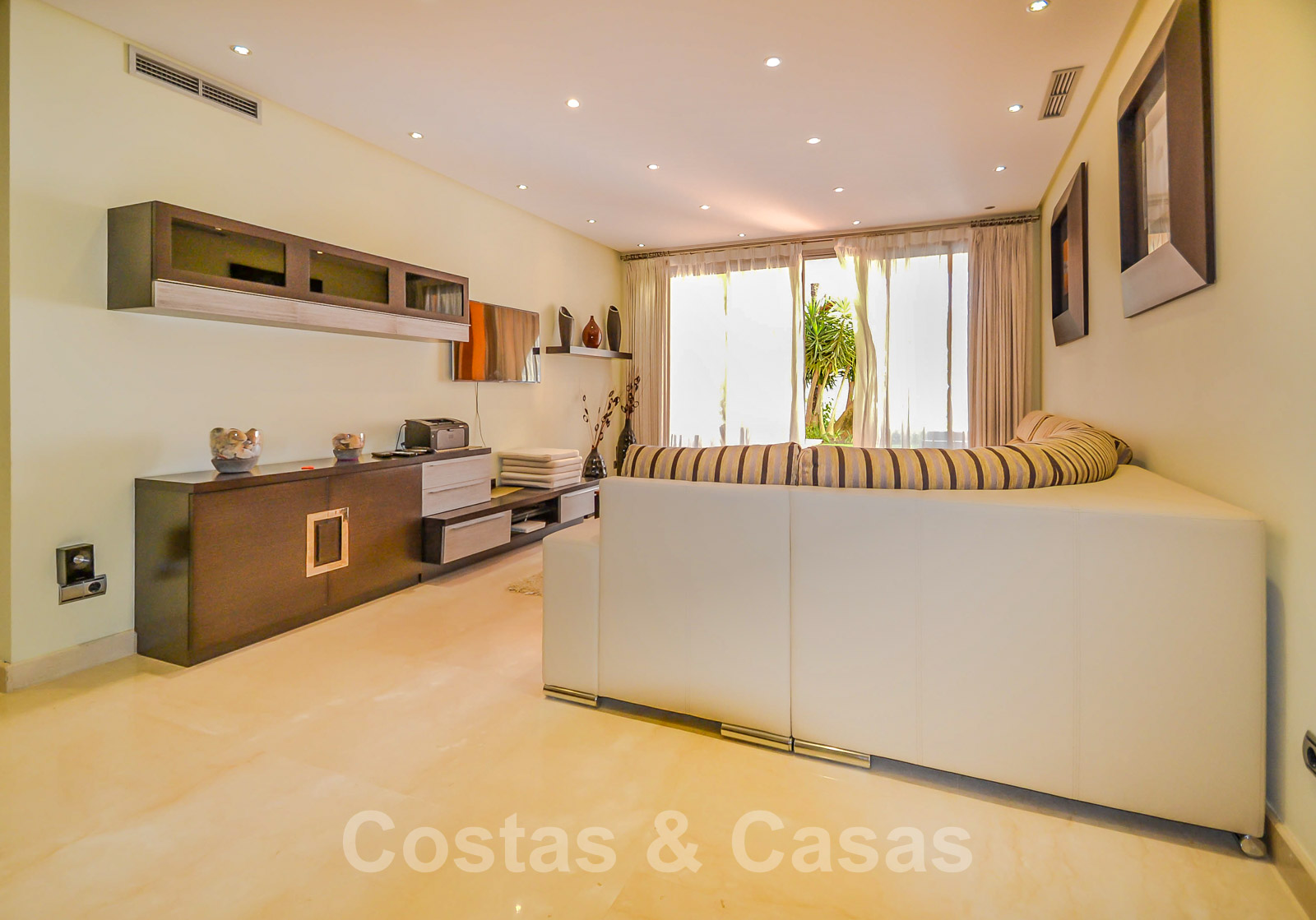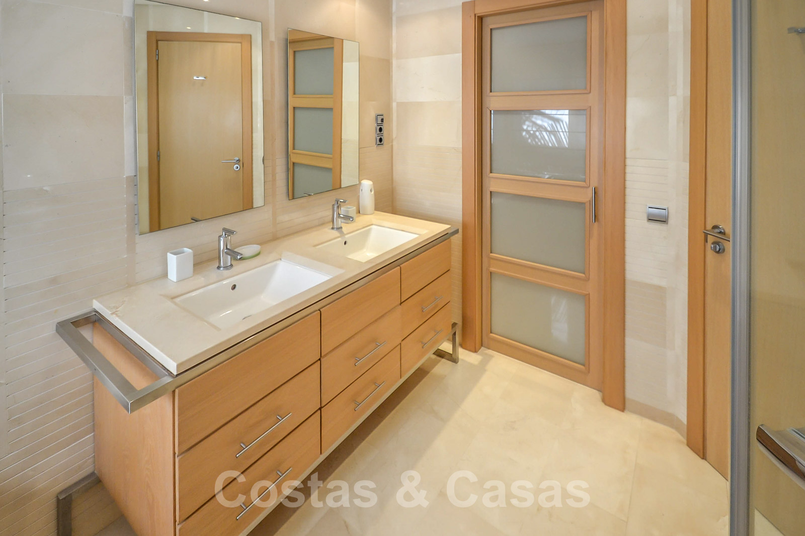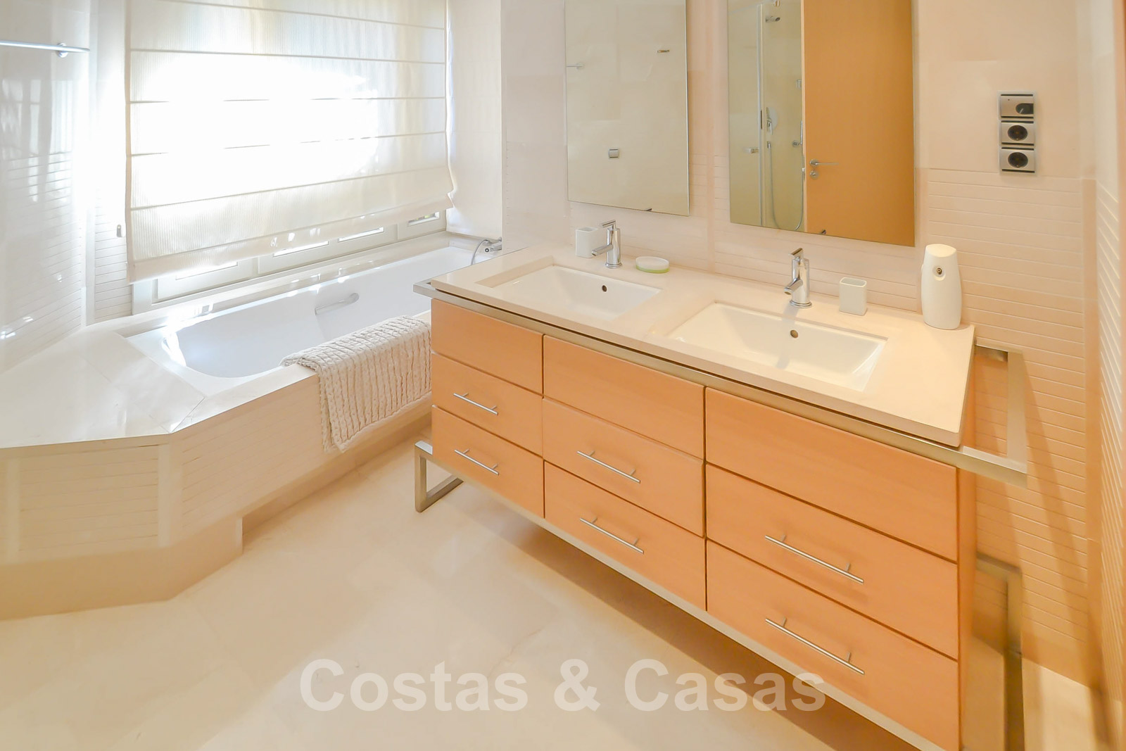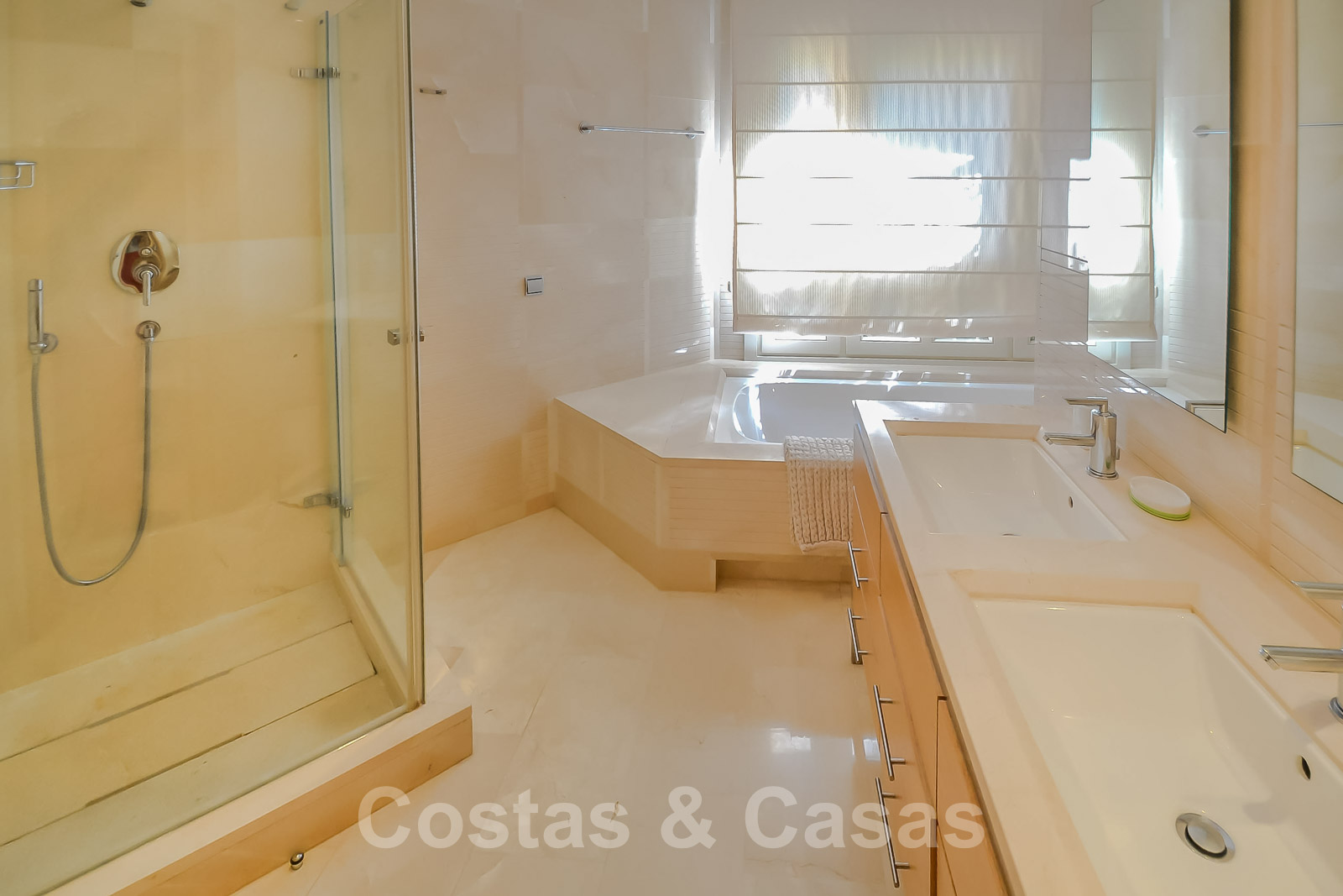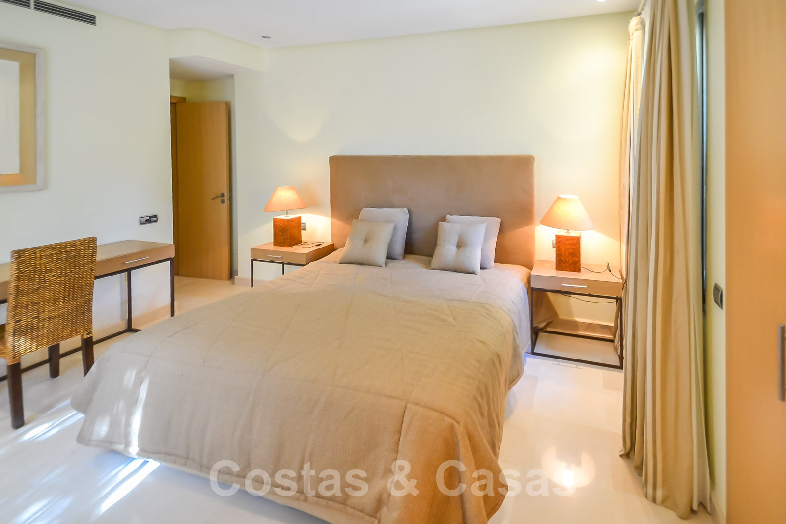 • Crème marmeren vloeren, vloerverwarming, airconditioning voor verkoeling en verwarming, domotica, alarmsysteem.