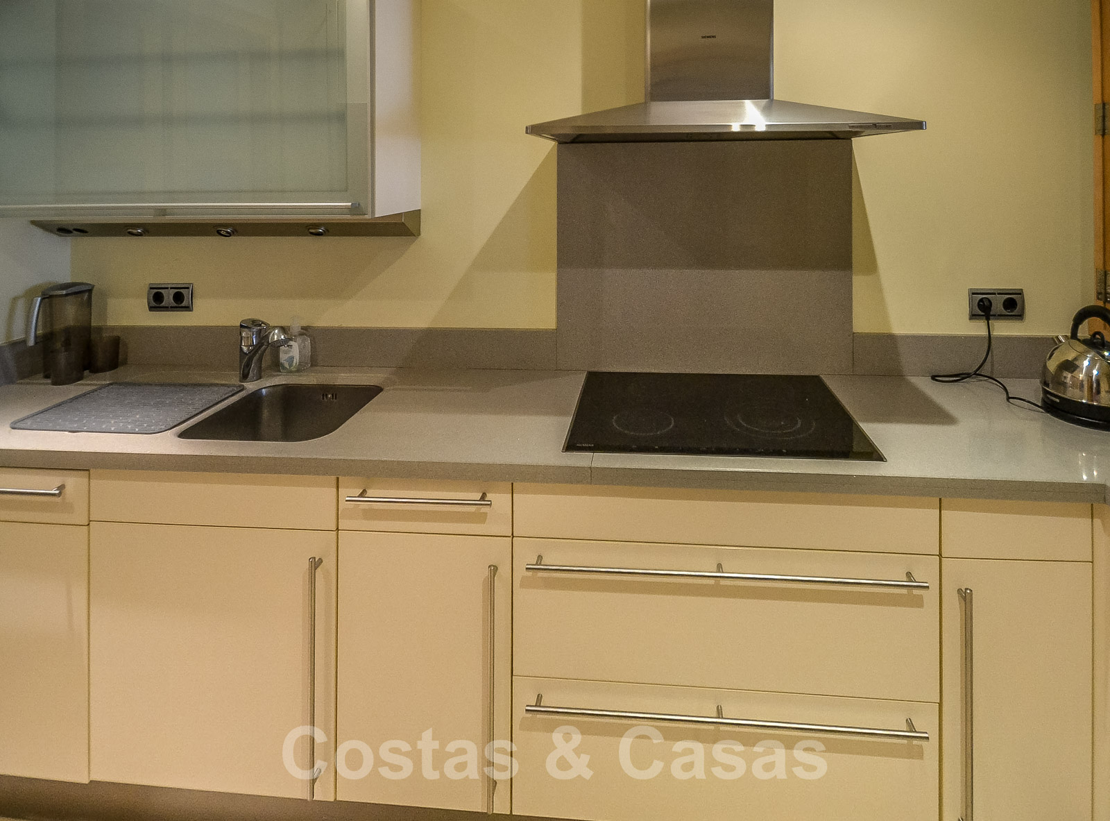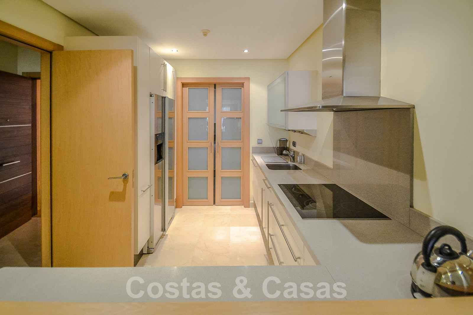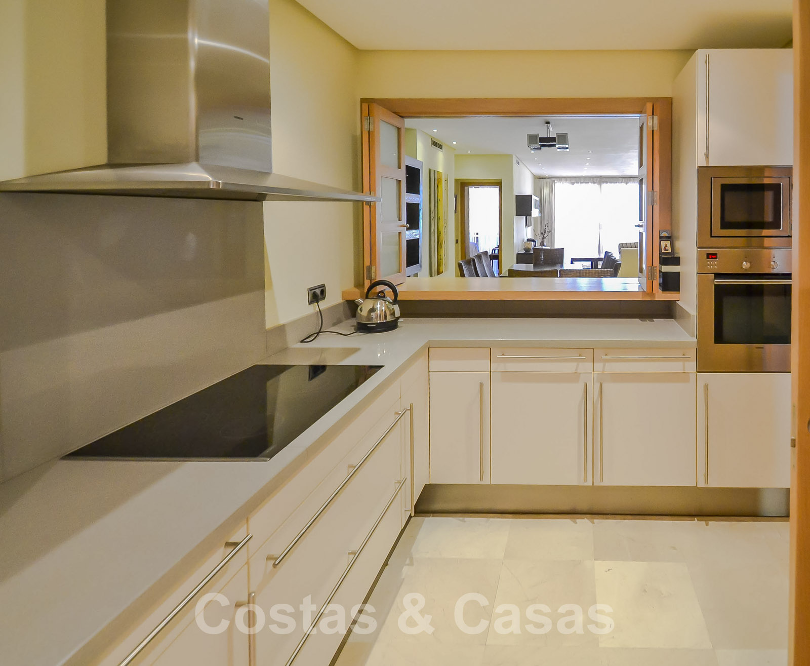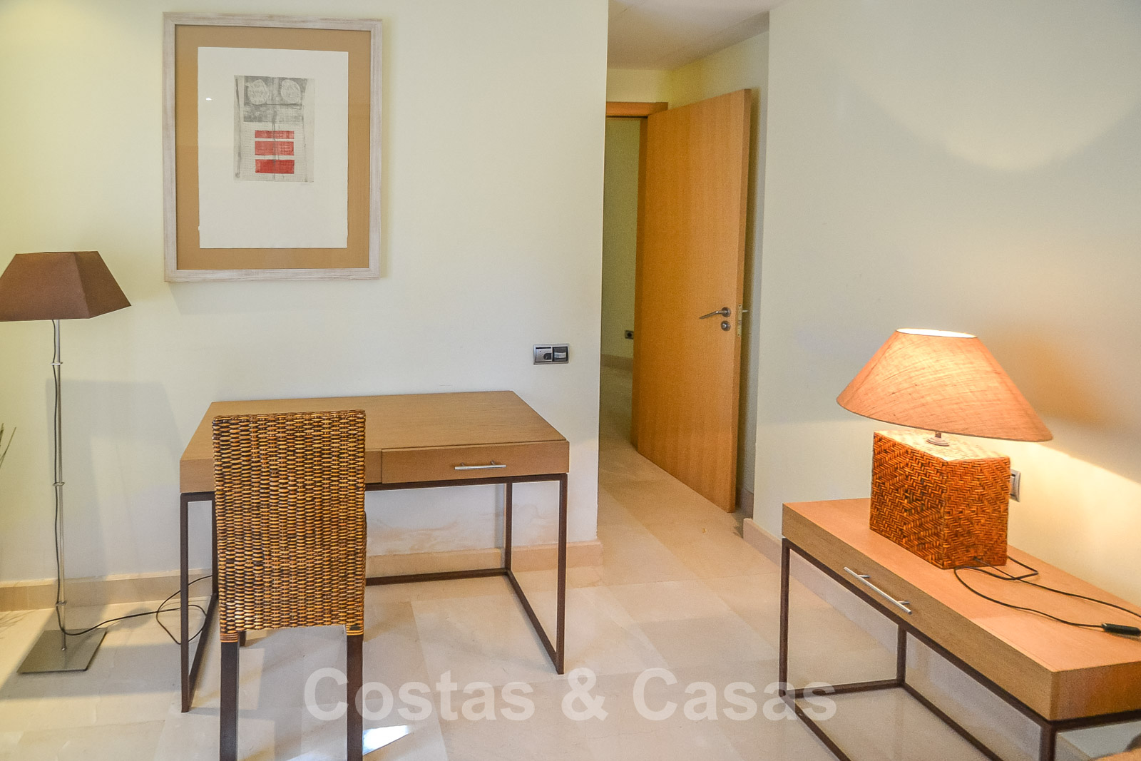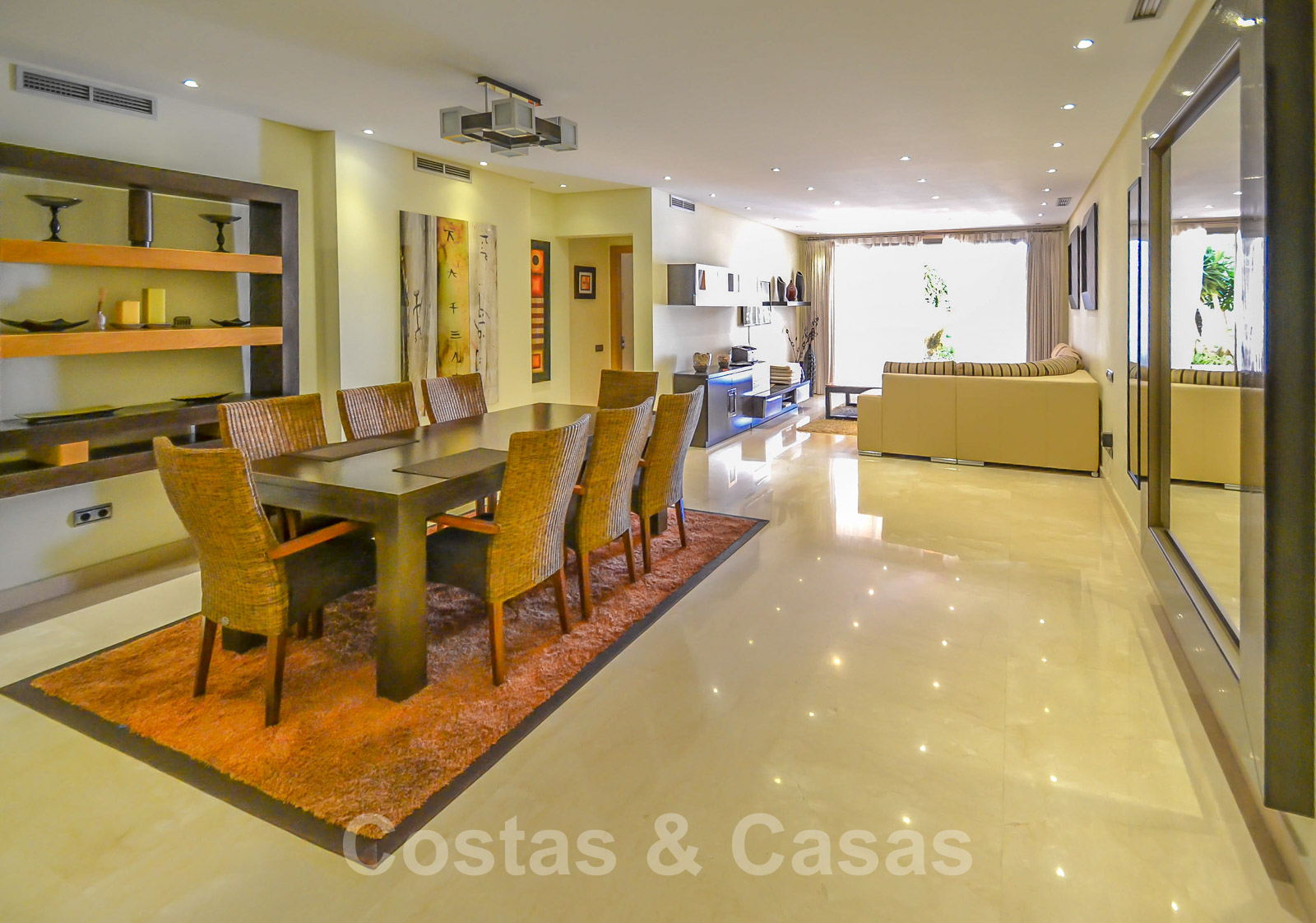 • Crème marmeren vloeren, vloerverwarming, airconditioning voor verkoeling en verwarming, domotica, alarmsysteem.