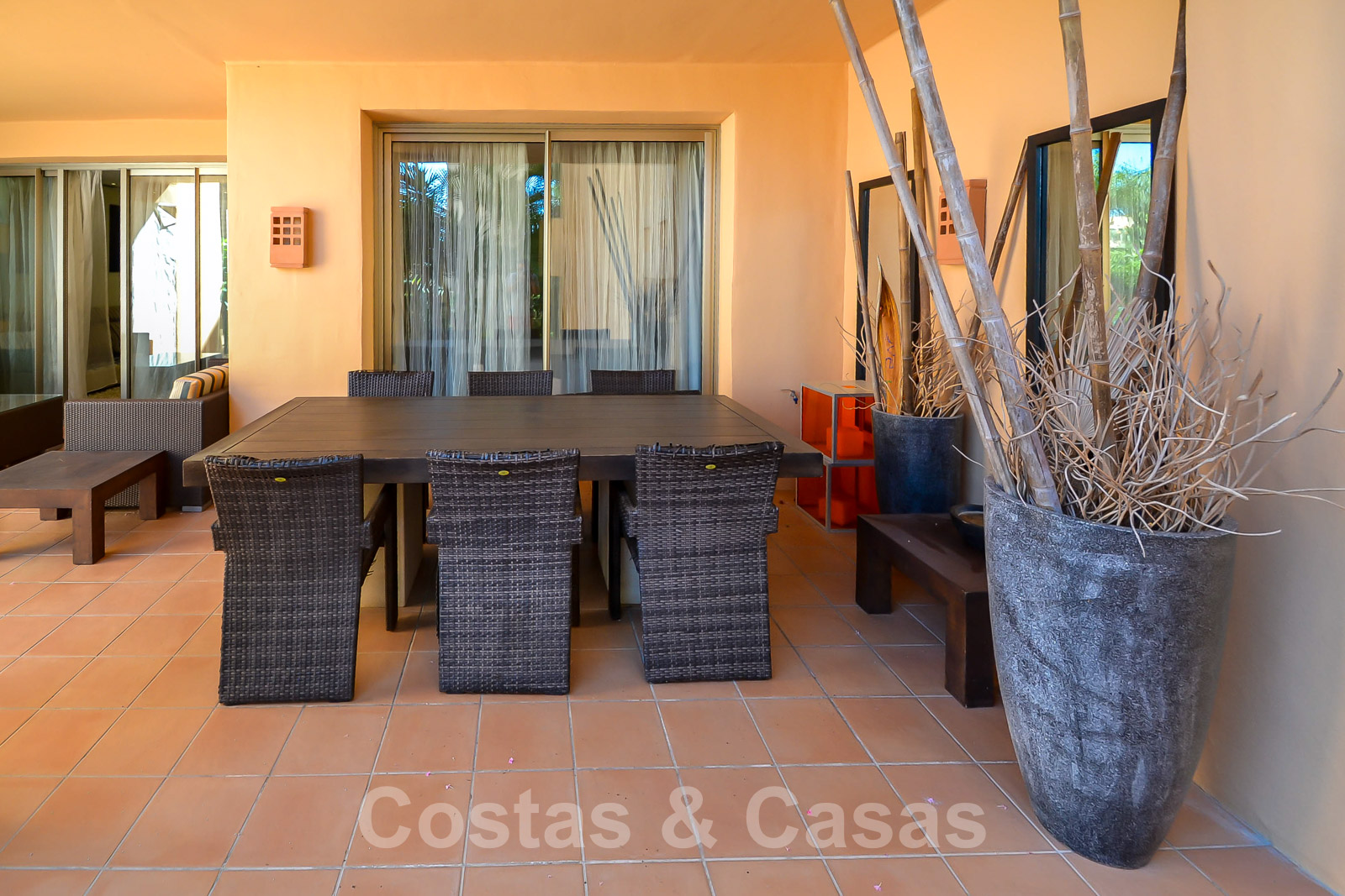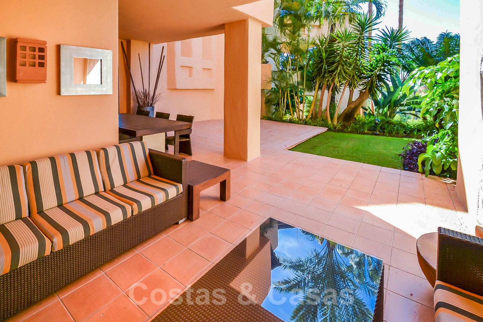 • Uitgestrekt, deels overdekt terras met zicht op de tuin.