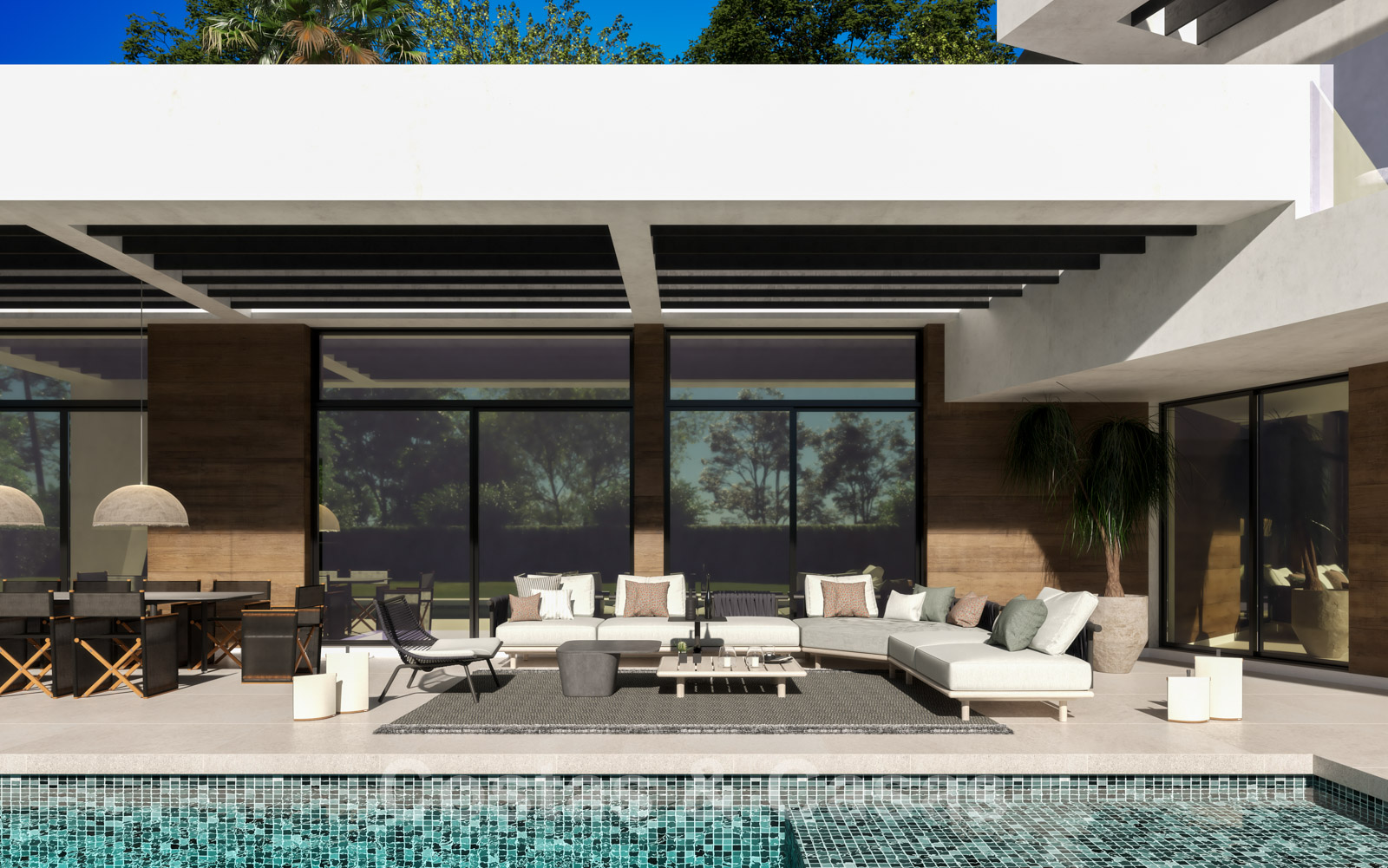 Toegang tot het overdekt terras via de kamerhoge schuiframen.
