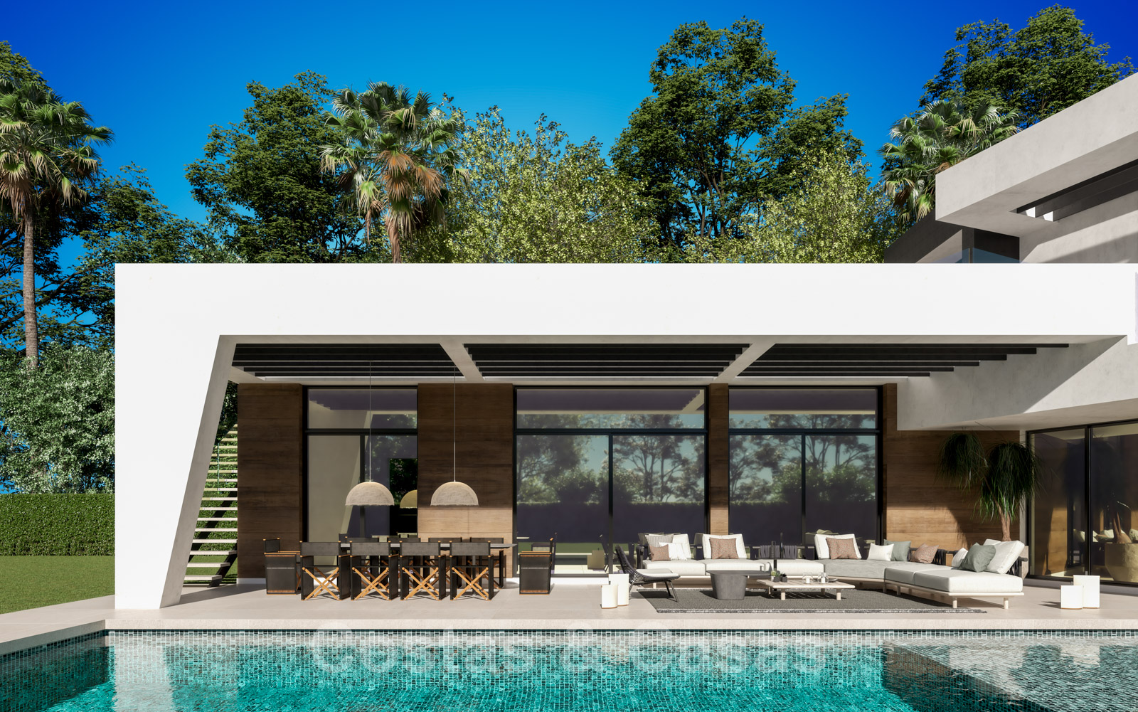 Enkele treden die het solarium verbinden met het pergolaterras van de andere vleugel.