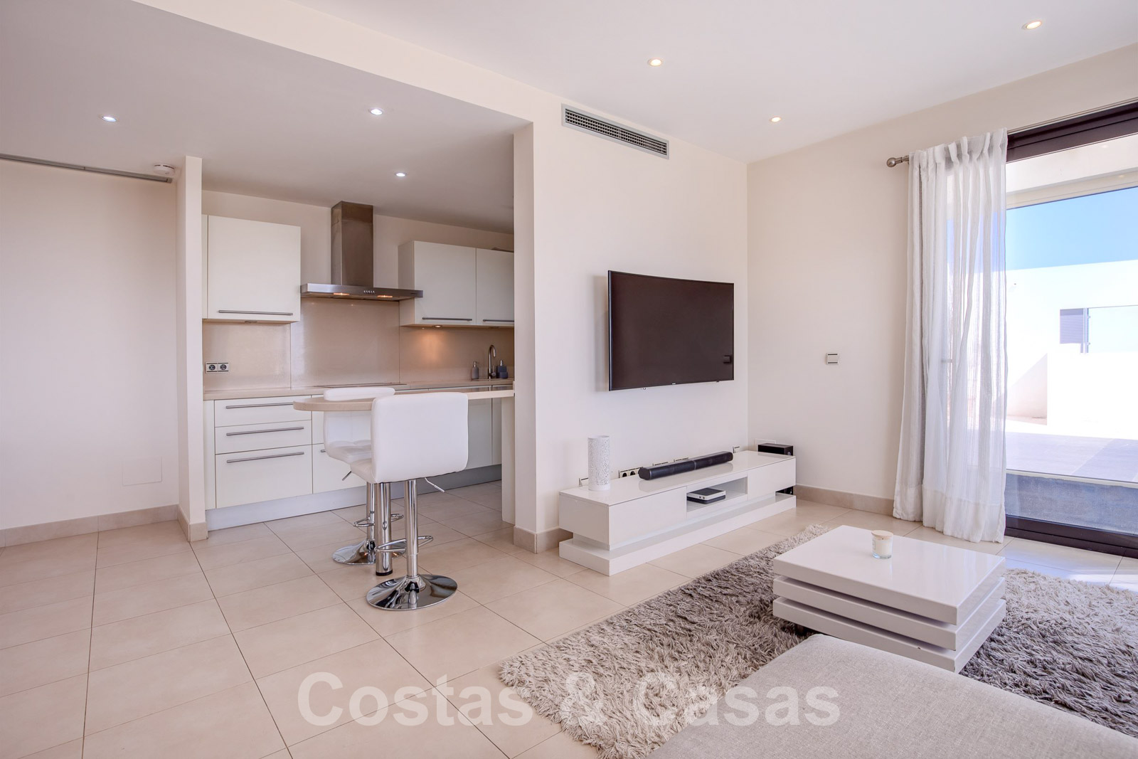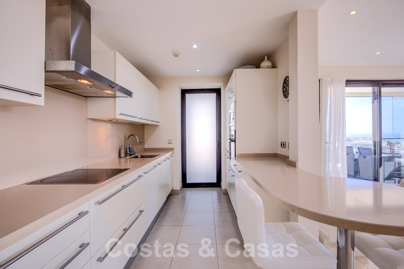 Het hele appartement en de terrassen bevinden zich op één niveau, wat uitzonderlijk is.