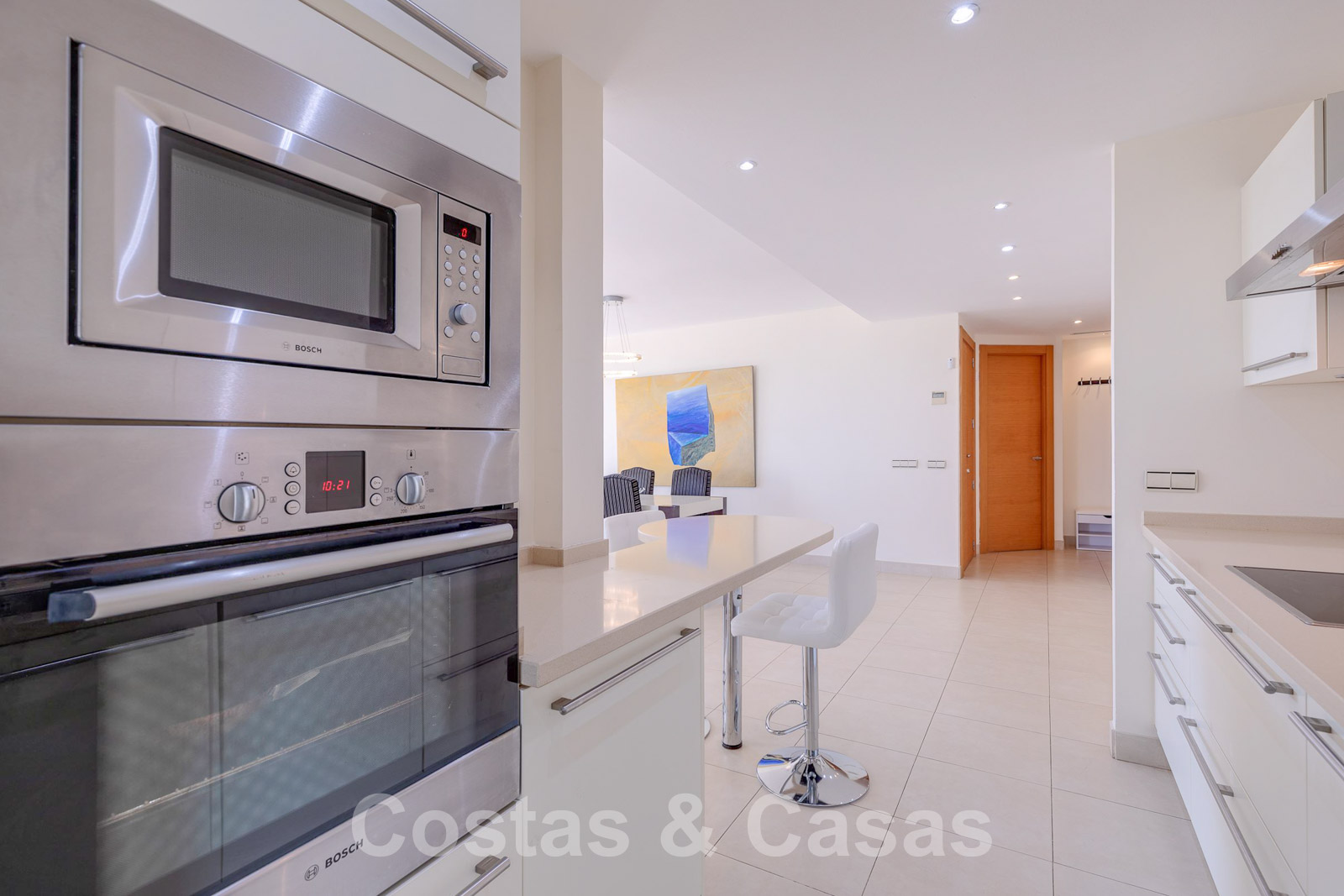 Open, volledig geëquipeerde keuken met een ontbijtbar dat uitgeeft op het salon.