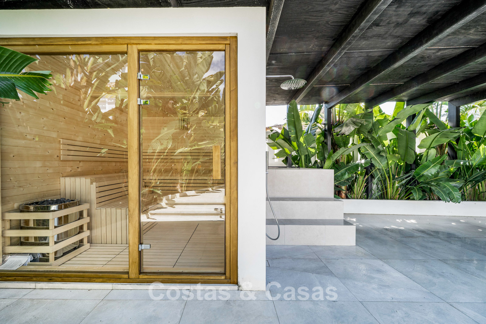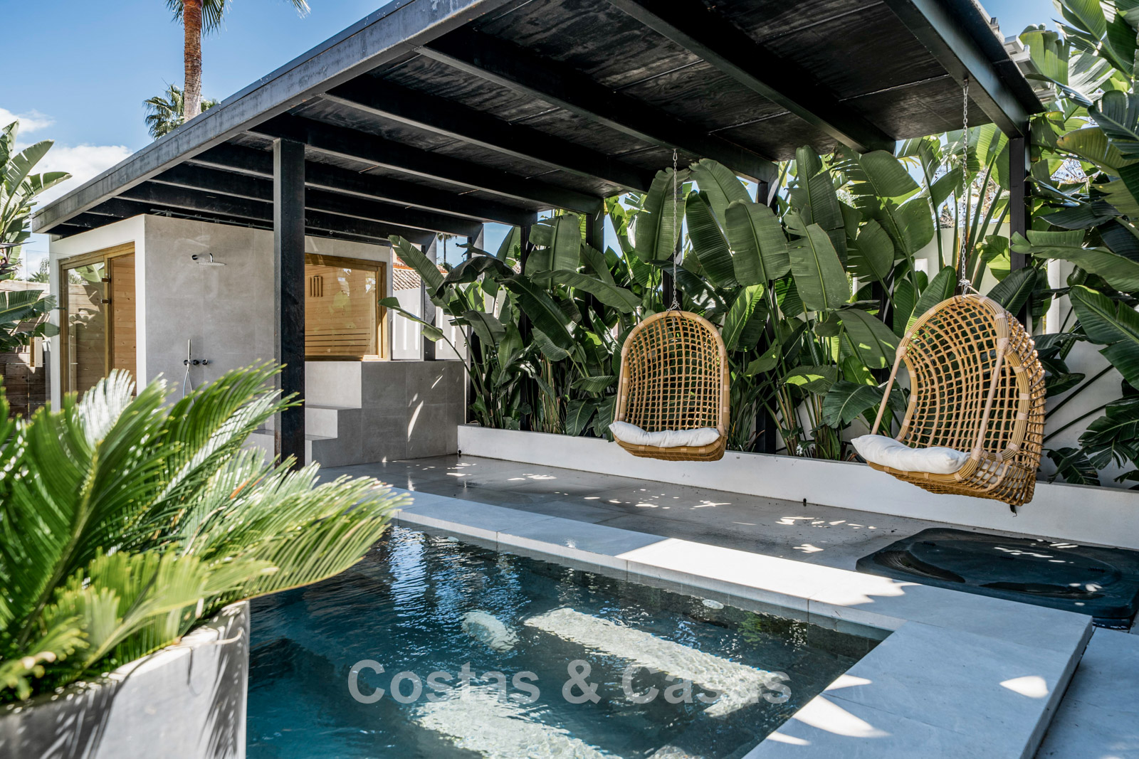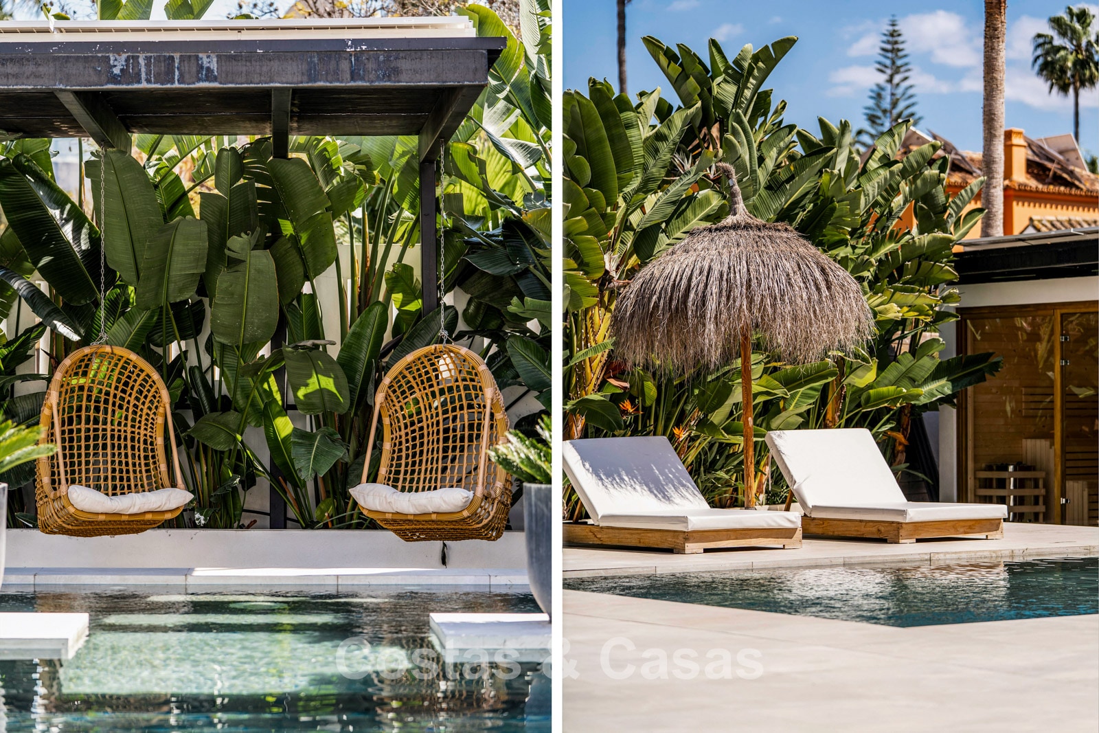 Het strakke, modern vormgegeven zwembad wordt omringd door tropisch groen en stijlvolle loungebedden.