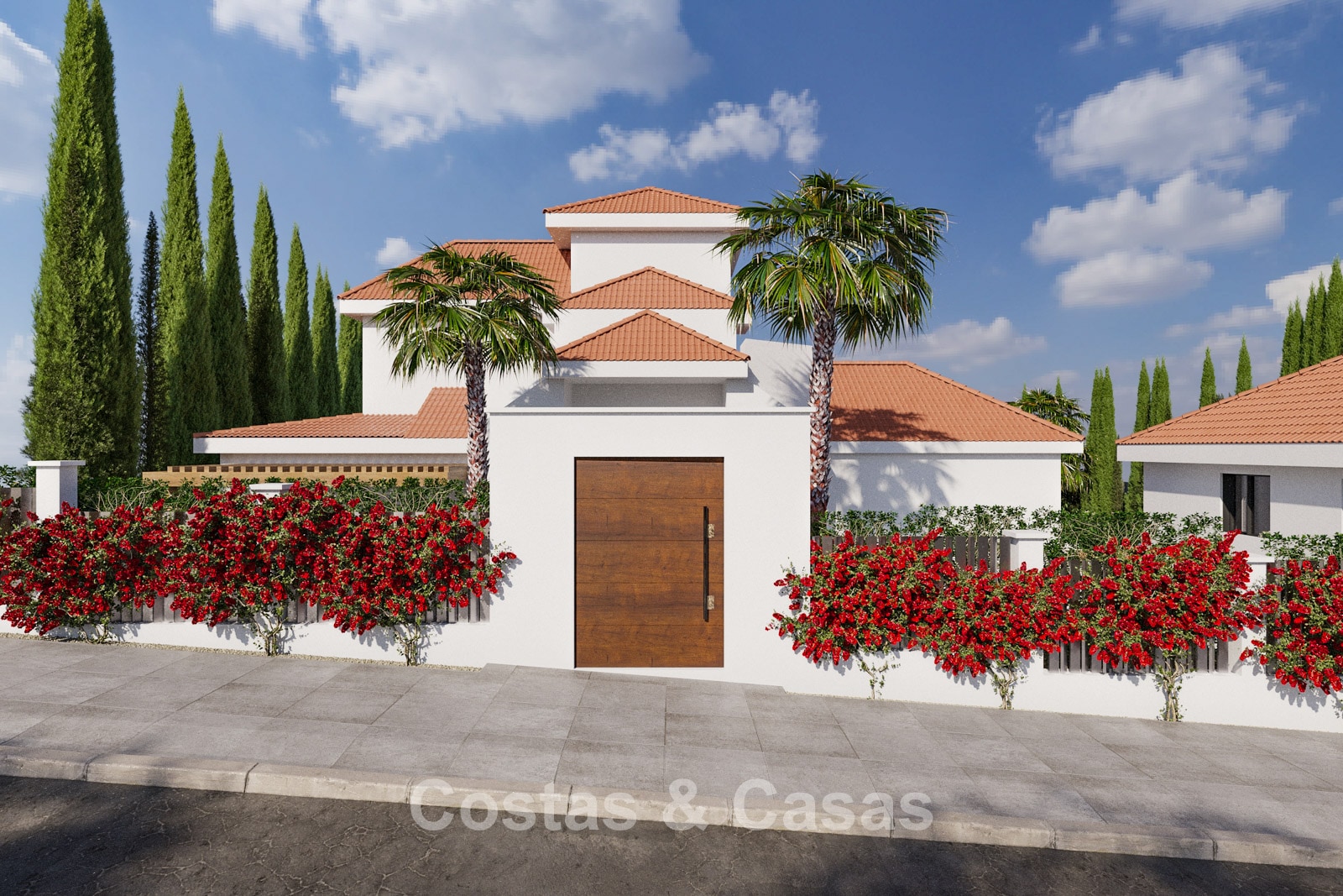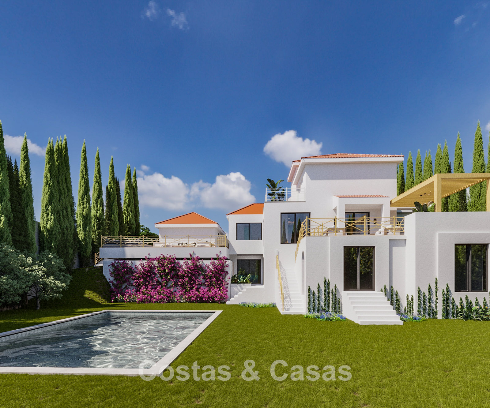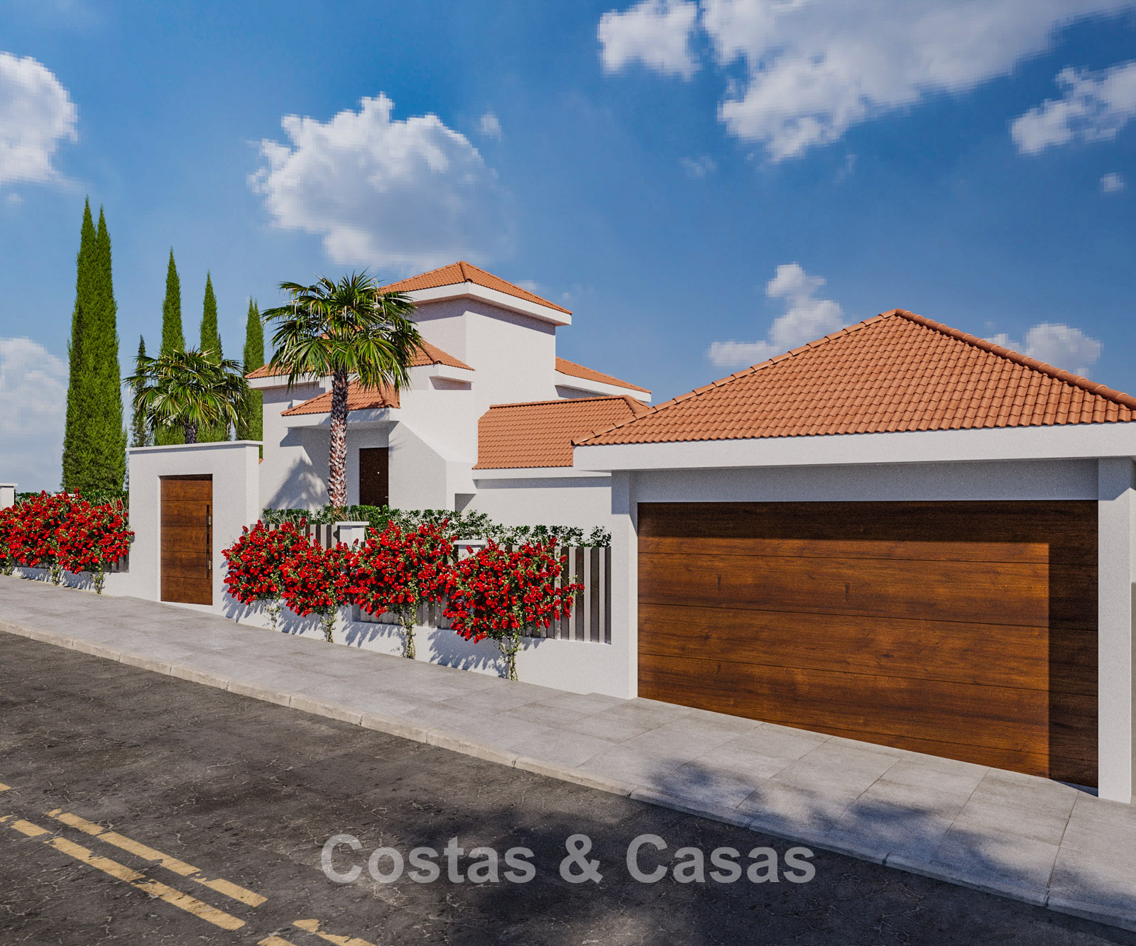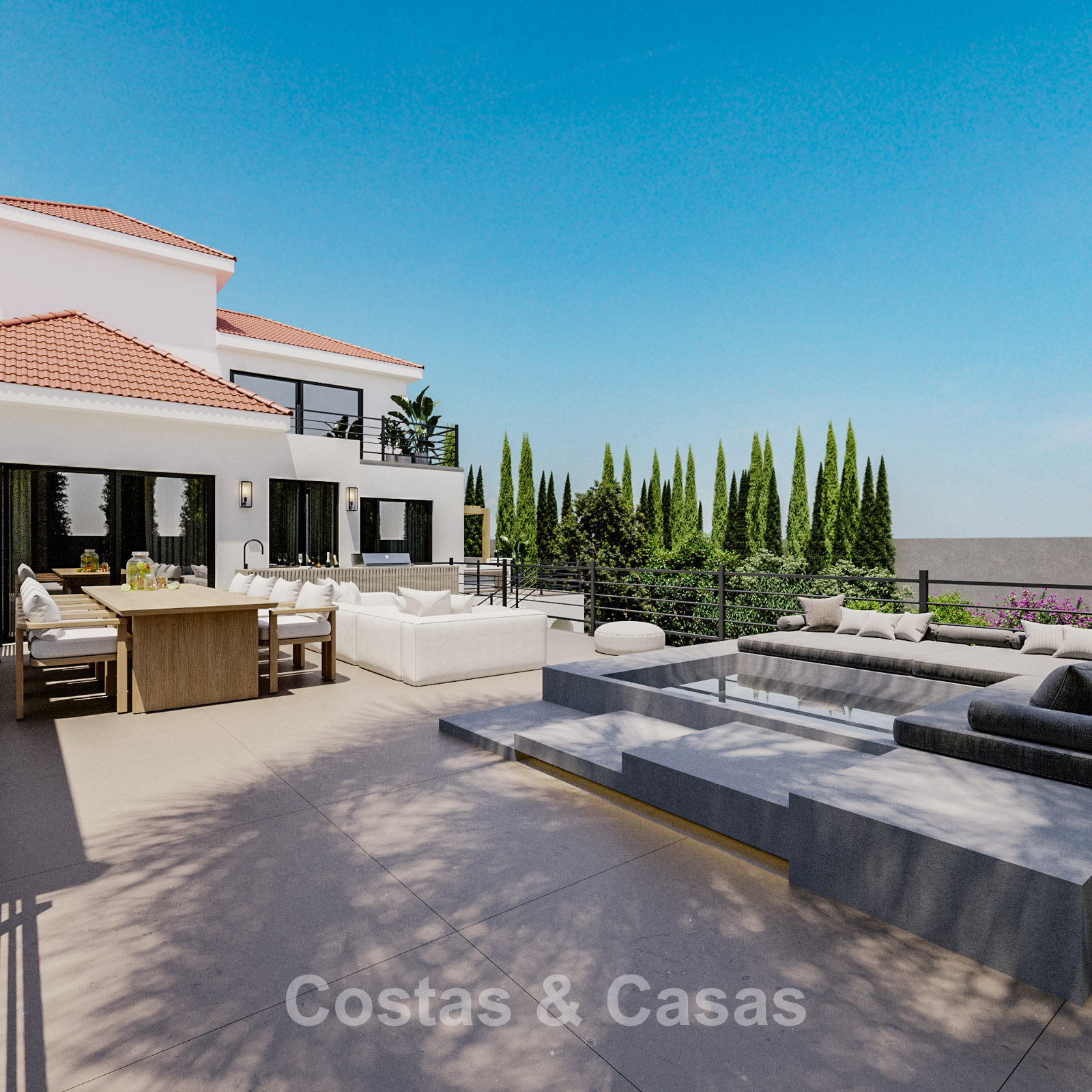 Vrijstaande villa met moderne architectuur gecombineerd met Andalusische accenten zoals terracotta dakpannen, die charme en karakter toevoegen.