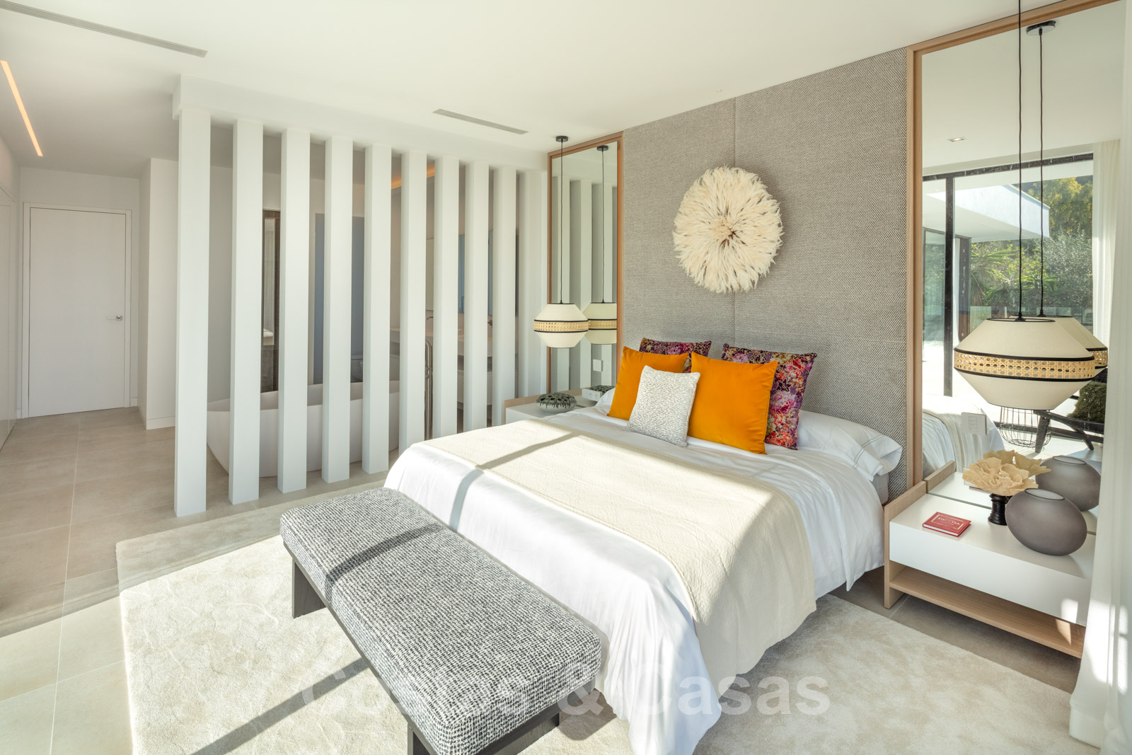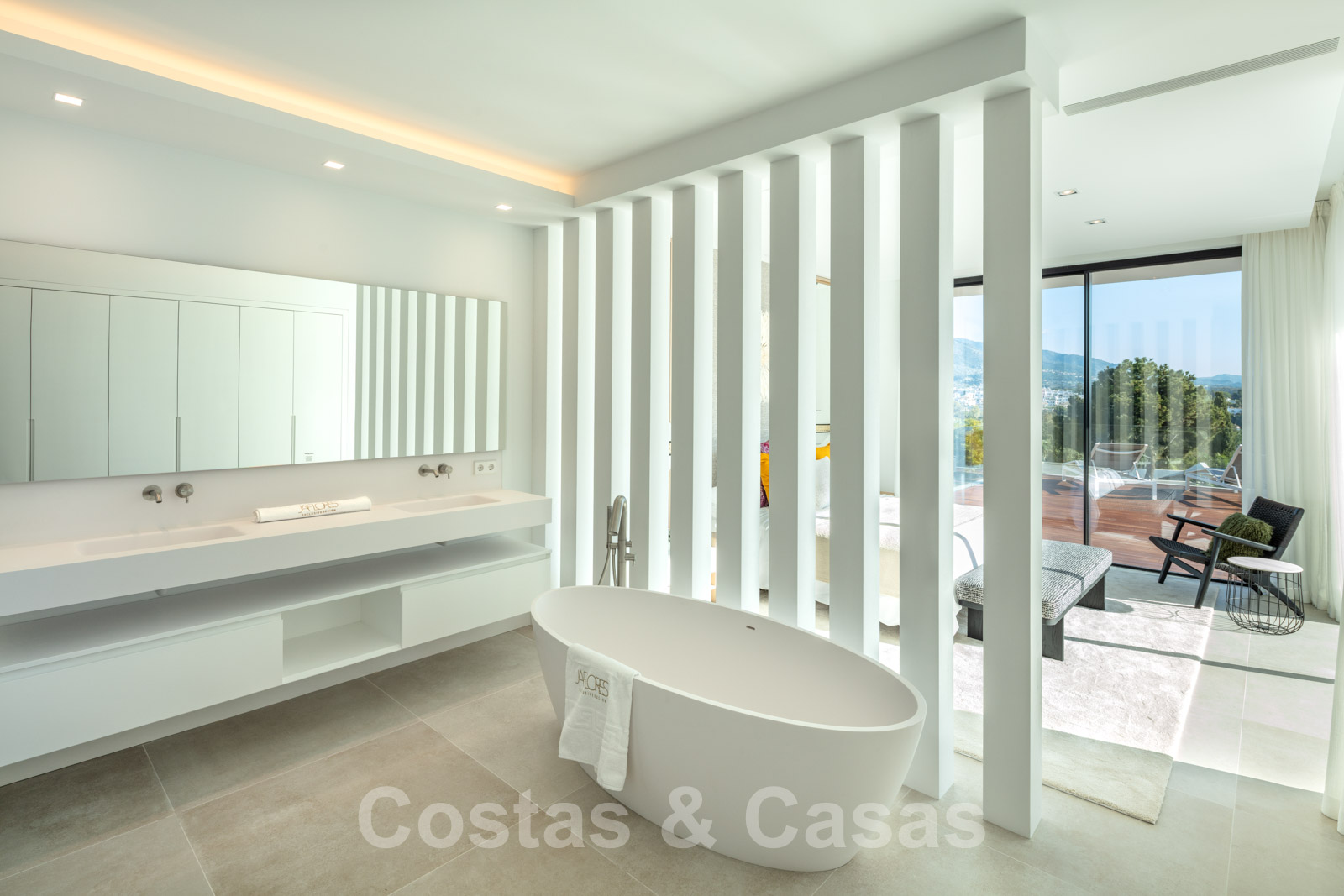 Master suite met vrijstaand bad en dubbele wastafels.