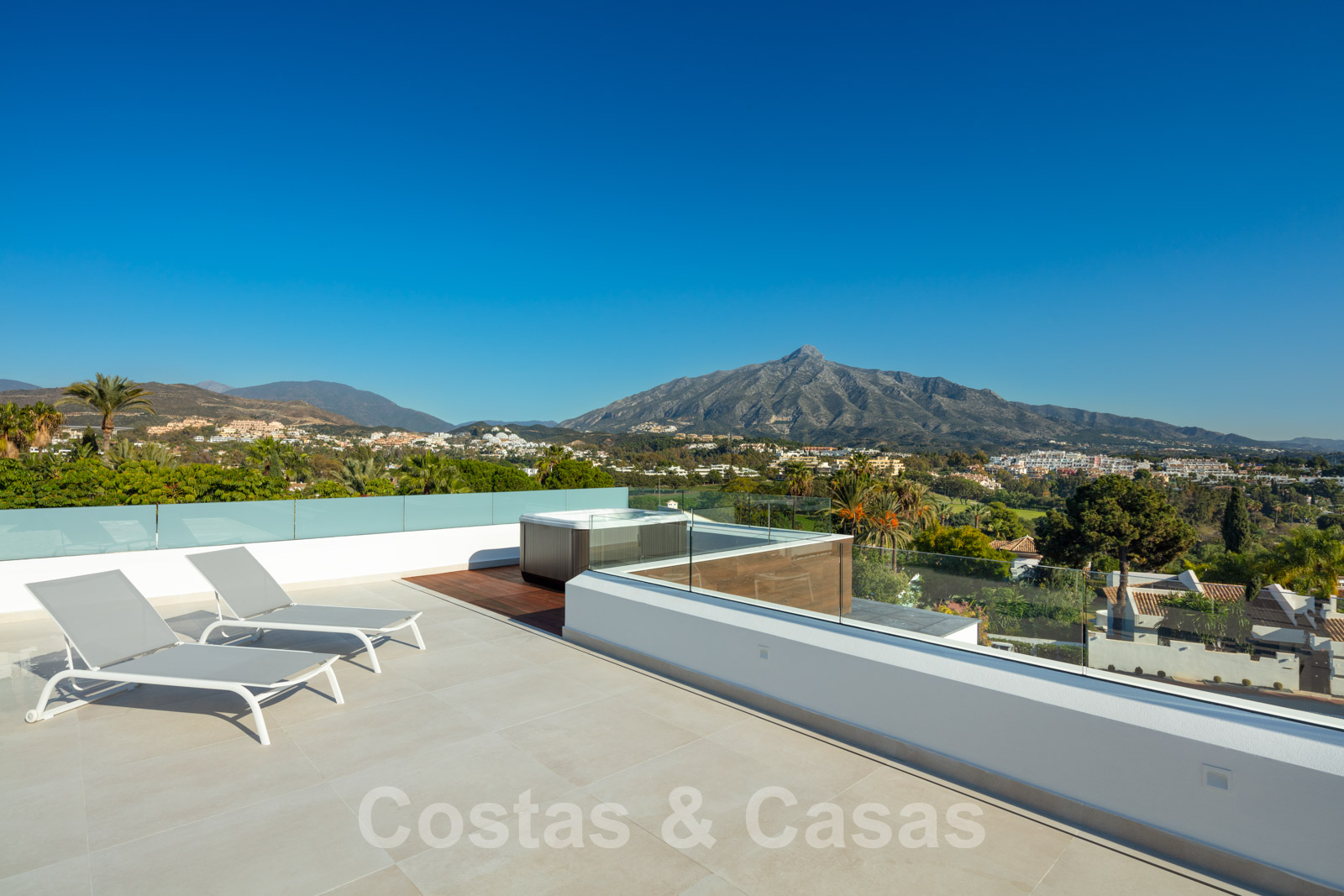 Groot terras met Jacuzzi en prachtig panoramisch uitzicht over de golfvallei, de La Concha berg en voorbij.