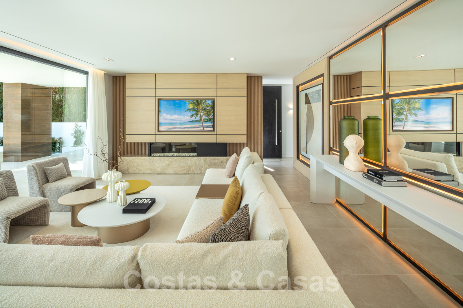 Royale open en overdekte terrassen met verzonken zithoek bij het zwembad met open haard