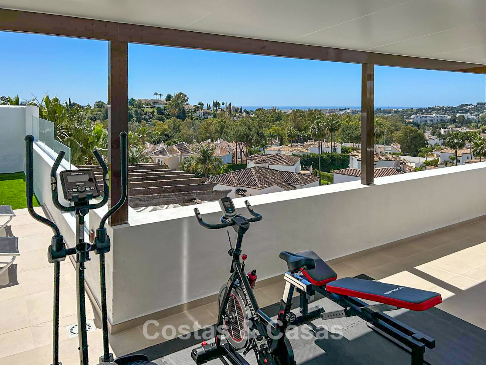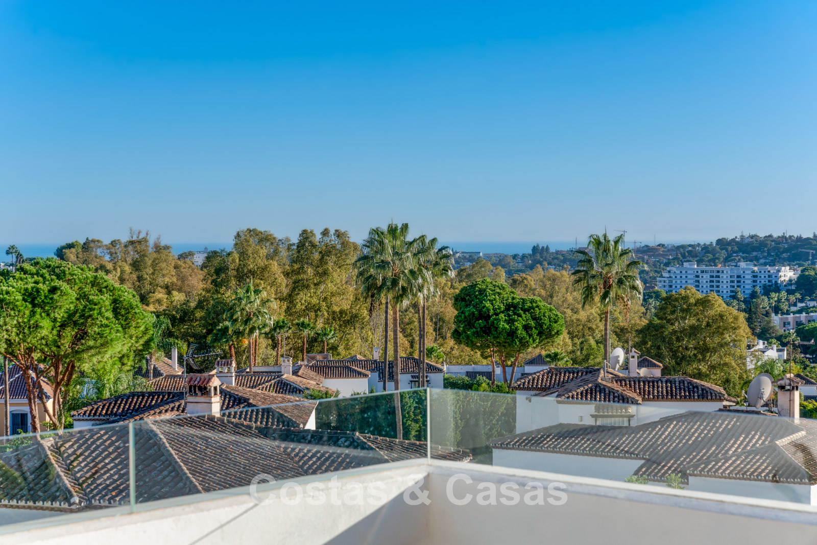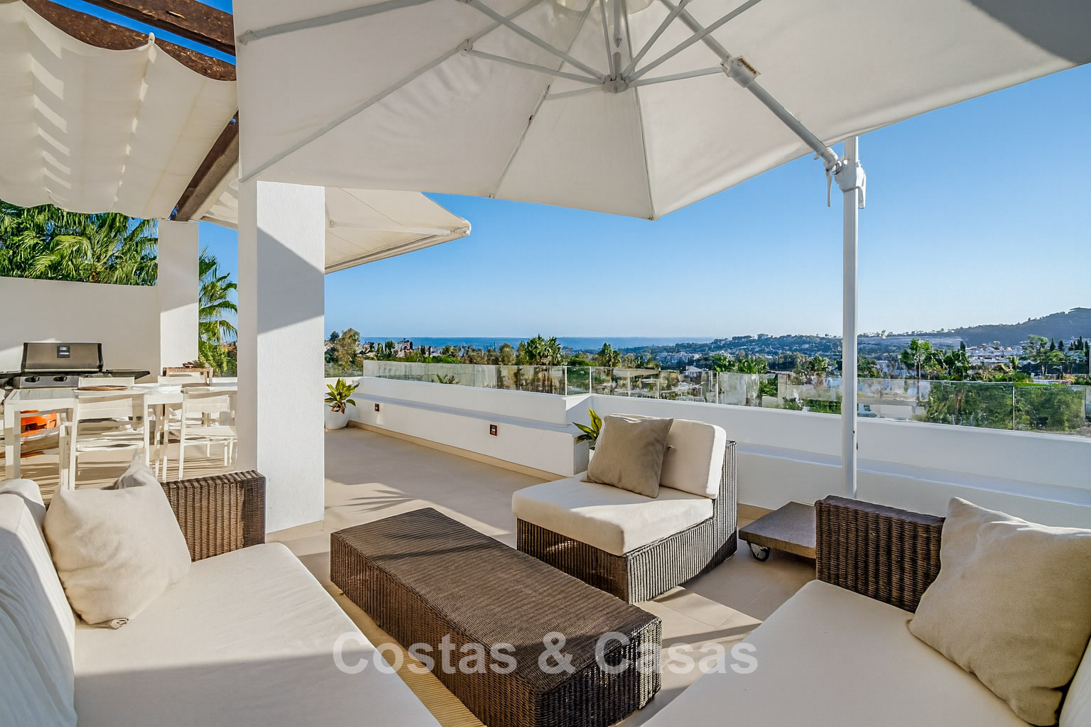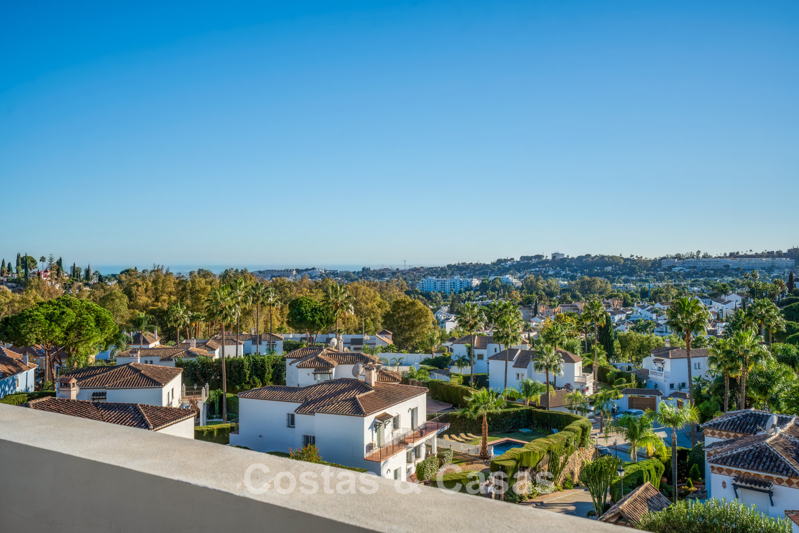 Het uitzicht is adembenemend en strekt zich uit over de vallei van Nueva Andalucía, de iconische La Concha-berg en de Middellandse Zee.