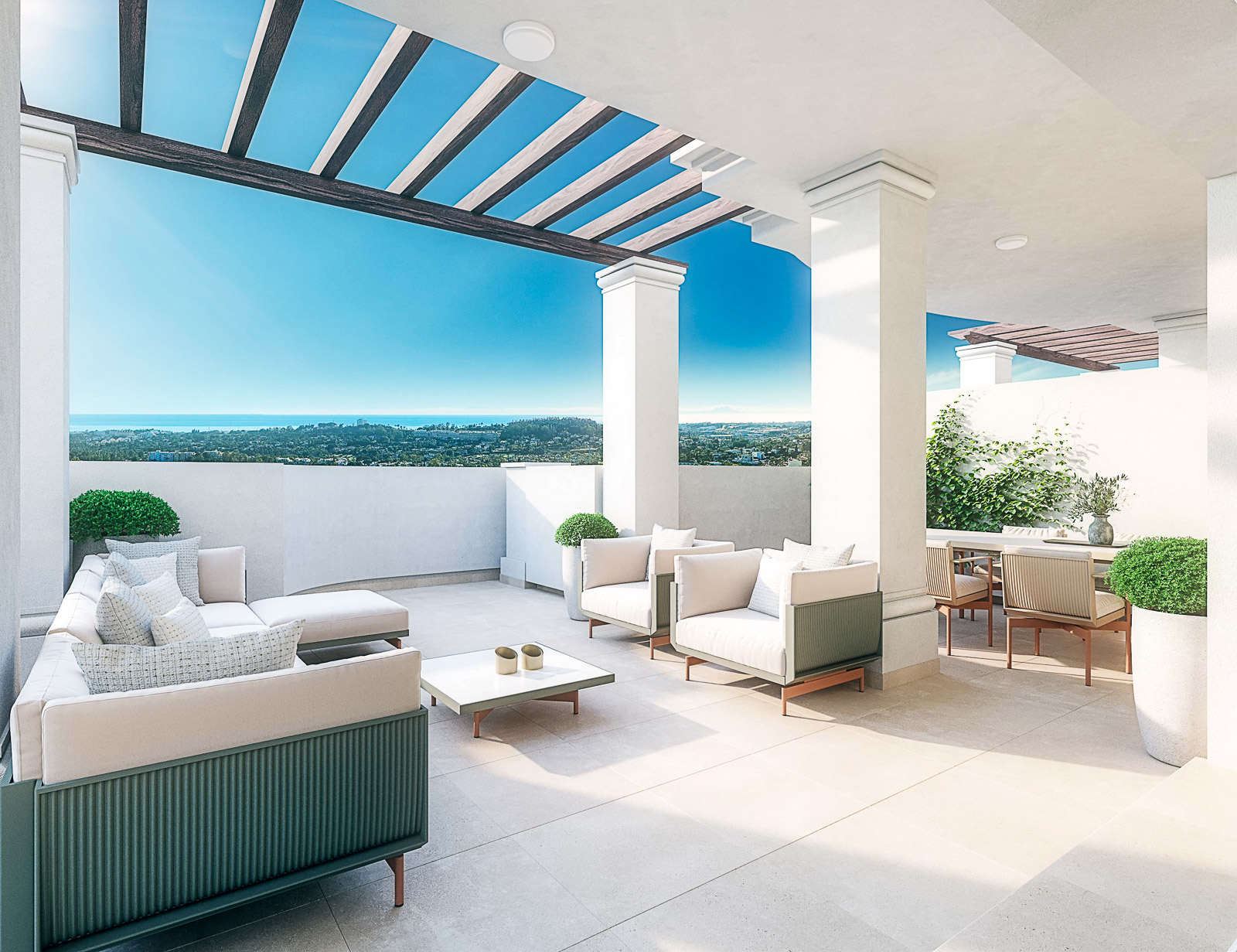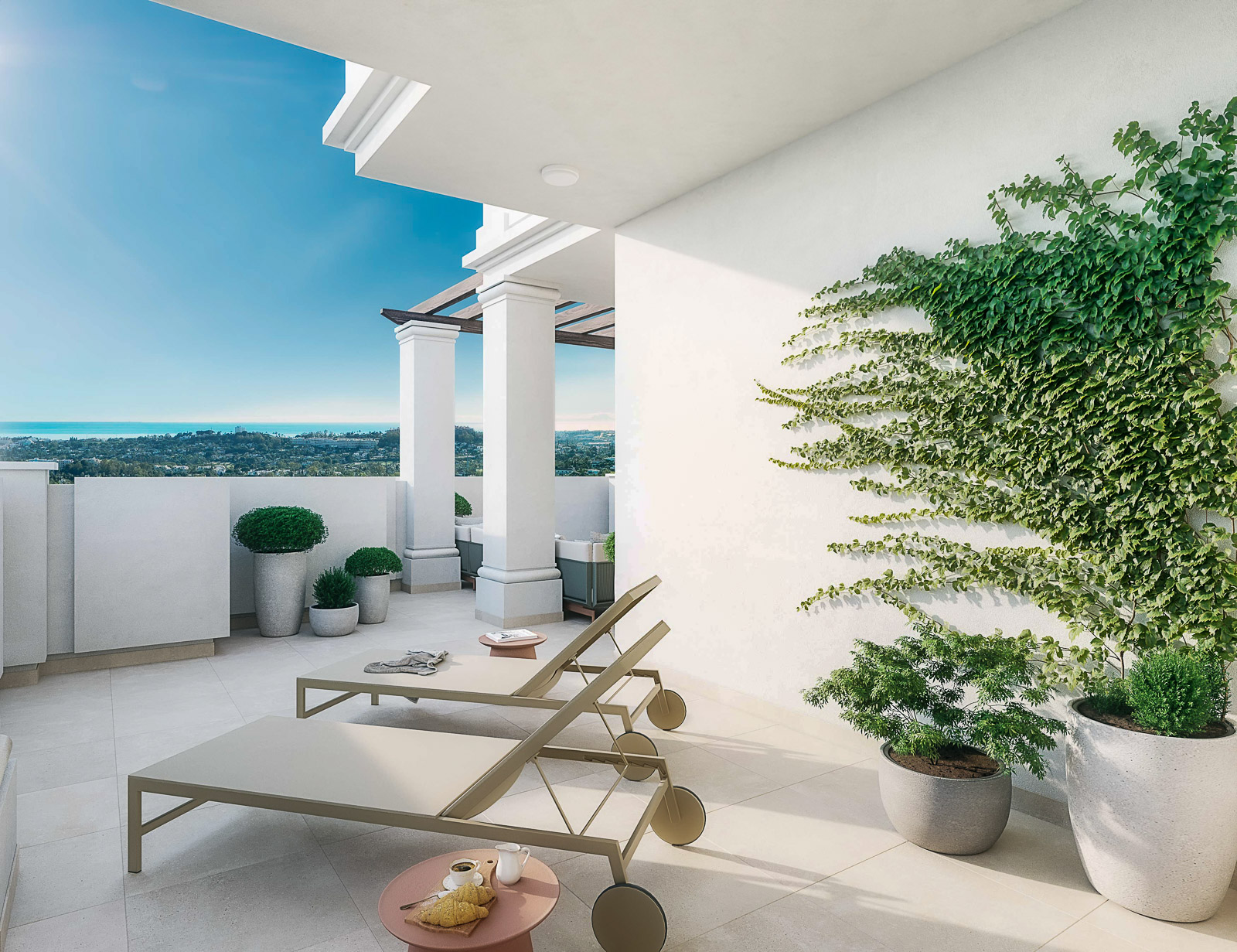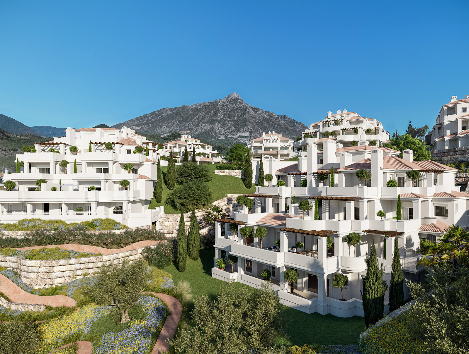 Hedendaagse appartementen in een Andalusische stijl te koop met panoramisch uitzicht naar zee toe in de golfvallei van Nueva Andalucia, Marbella