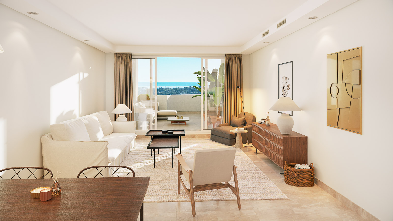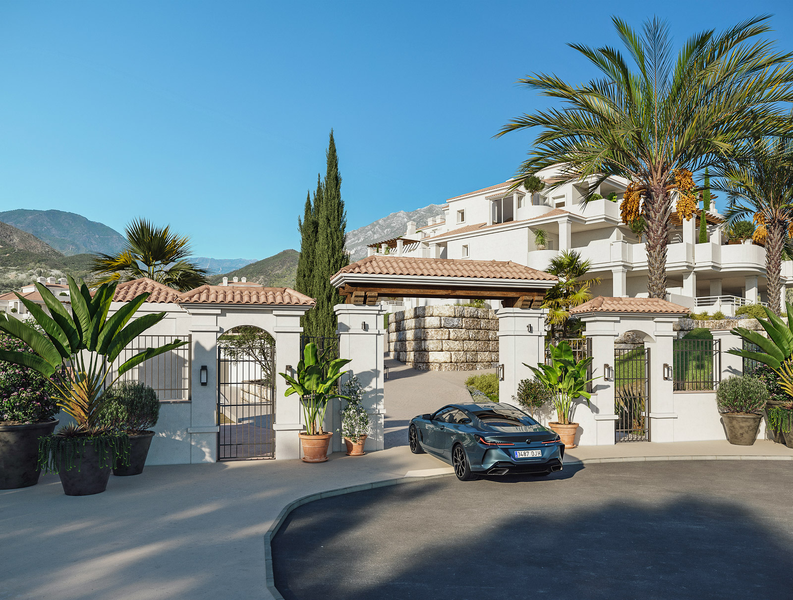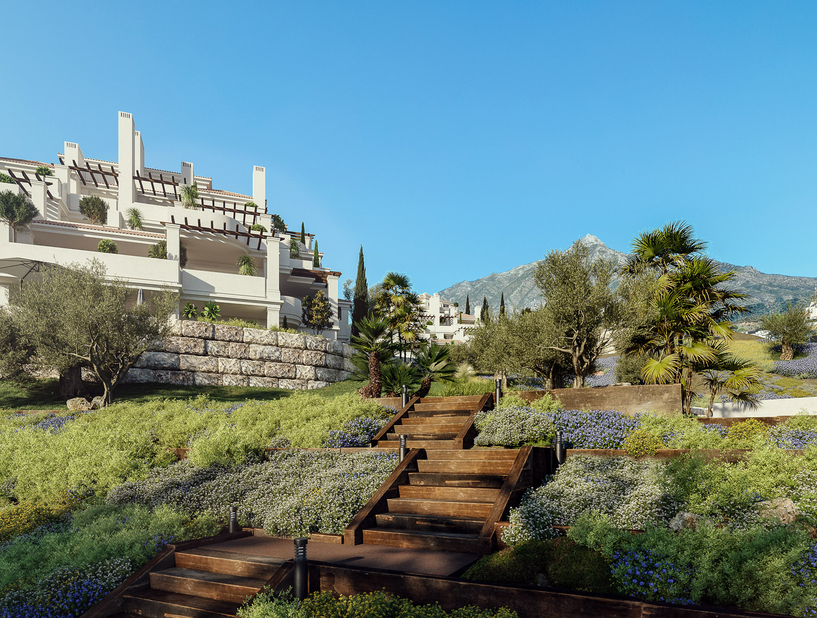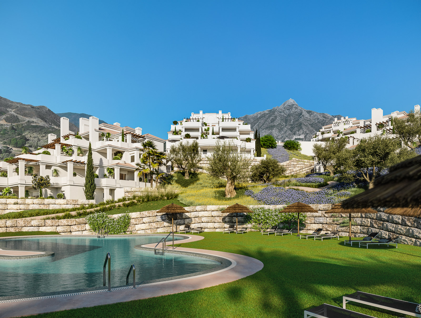 Hedendaagse appartementen in een Andalusische stijl te koop met panoramisch uitzicht naar zee toe in de golfvallei van Nueva Andalucia, Marbella