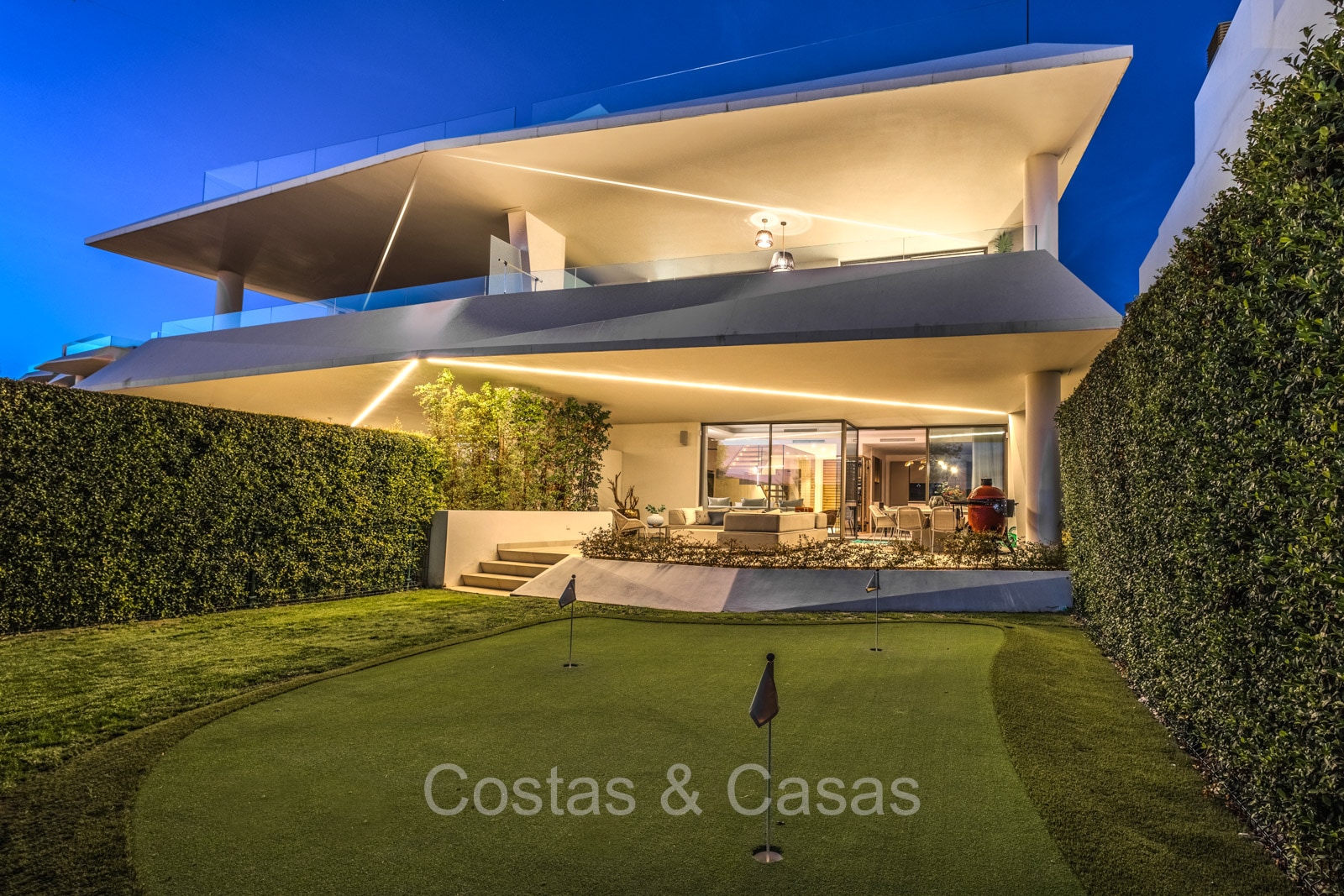 Privétuin volledig omgeven door hoge groene aanplantingen.De tuin bestaat uit een gazon en een putting green.