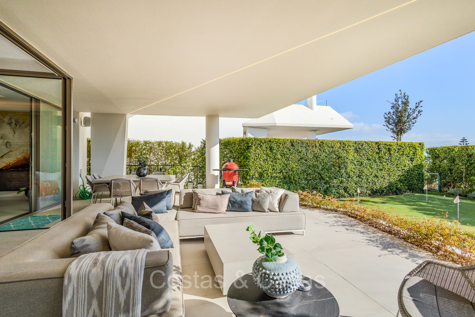 Het overdekt terras op de begane grond biedt ruimte voor een outdoor eetruimte en een grote lounge.