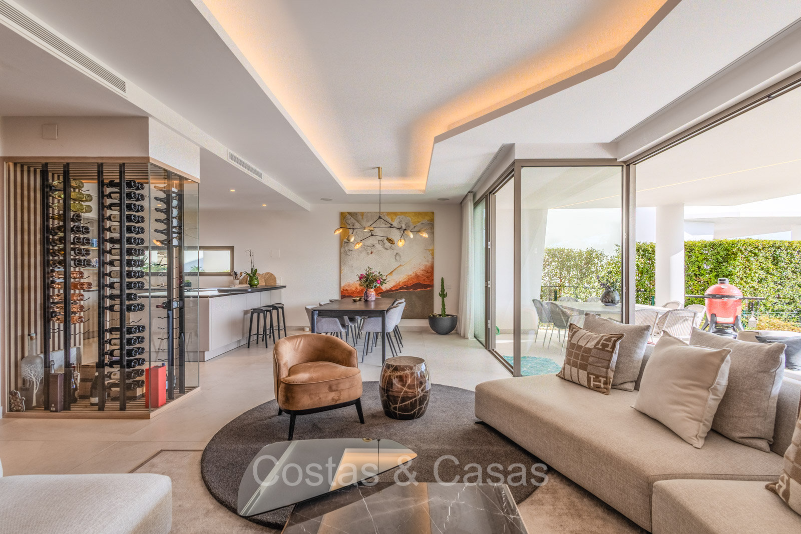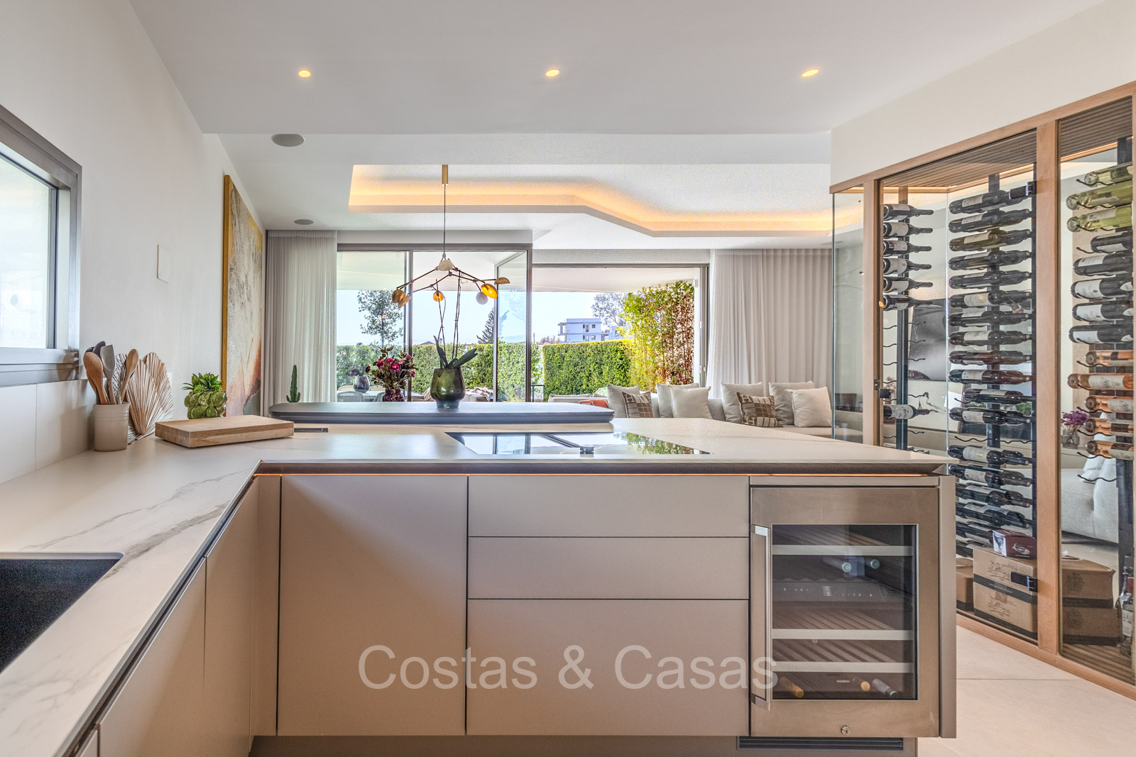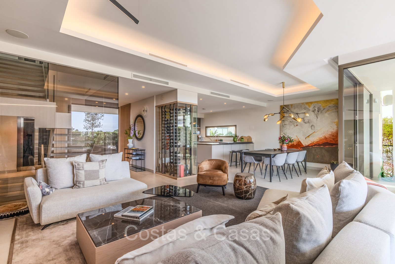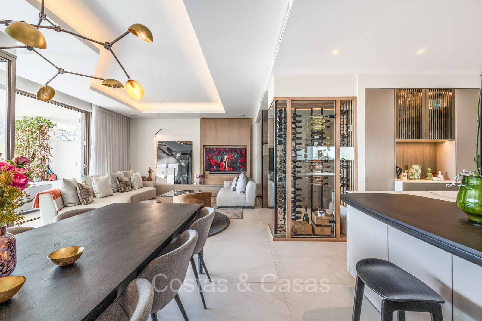 De open plan leefruimte biedt een sfeervolle TV-lounge, met centraal een glazen wijnbodega die een elegante en charmante uitstraling geeft aan het geheel.