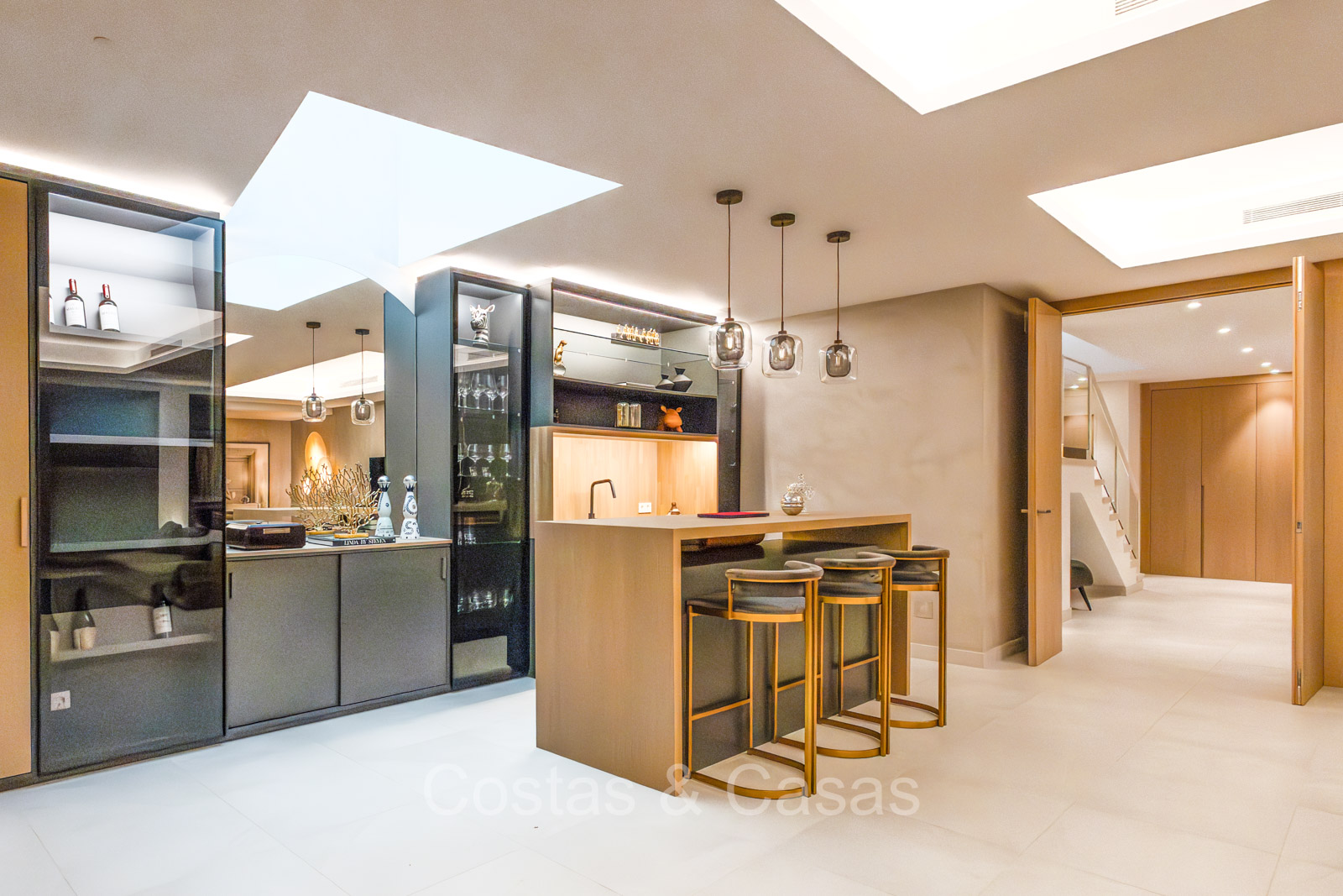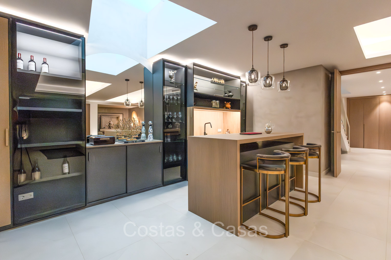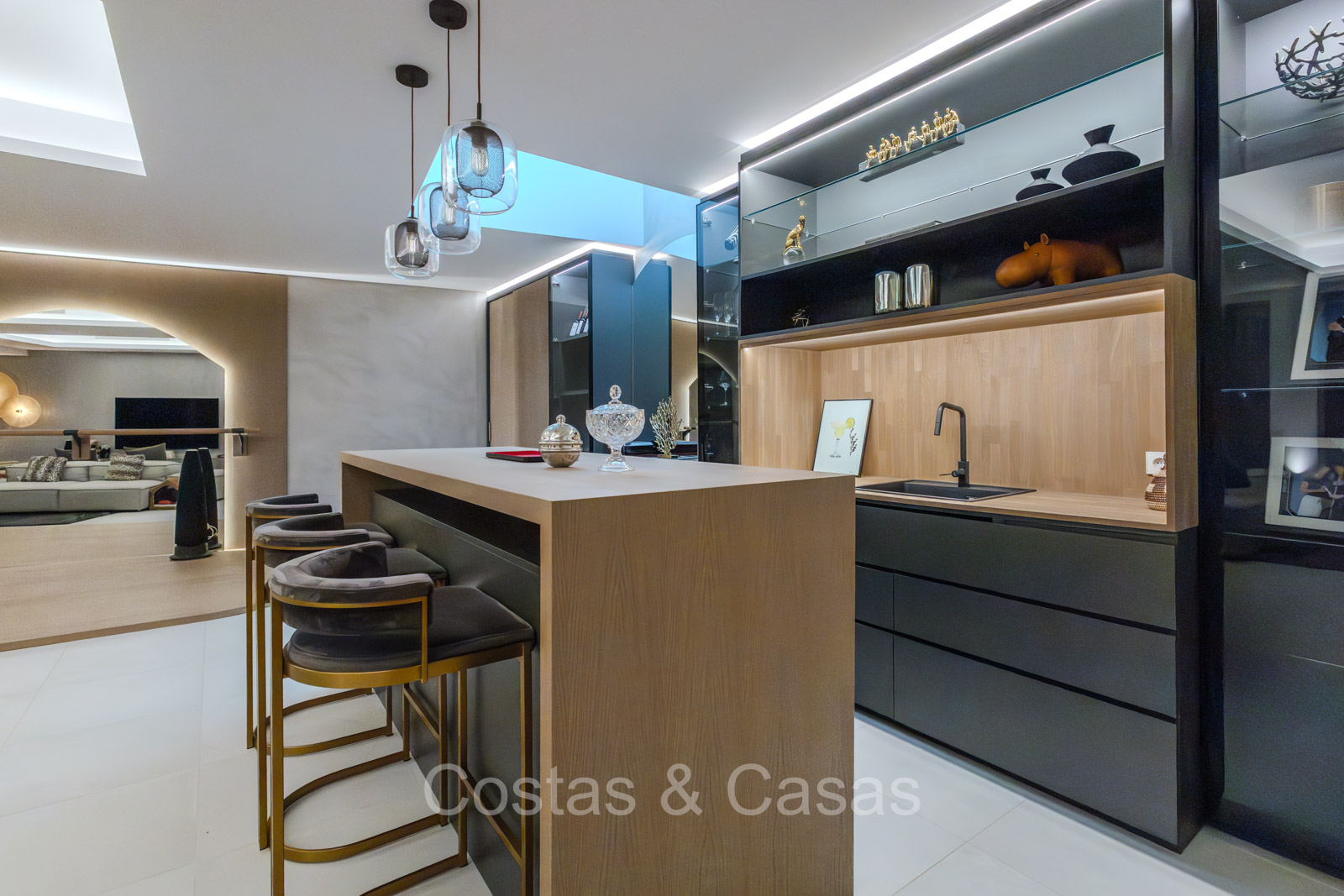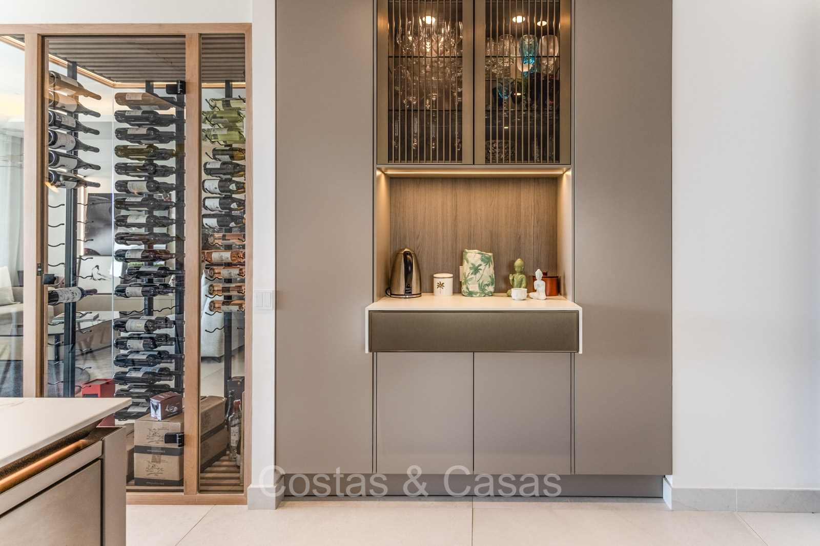 De open plan leefruimte biedt een sfeervolle TV-lounge, met centraal een glazen wijnbodega die een elegante en charmante uitstraling geeft aan het geheel.