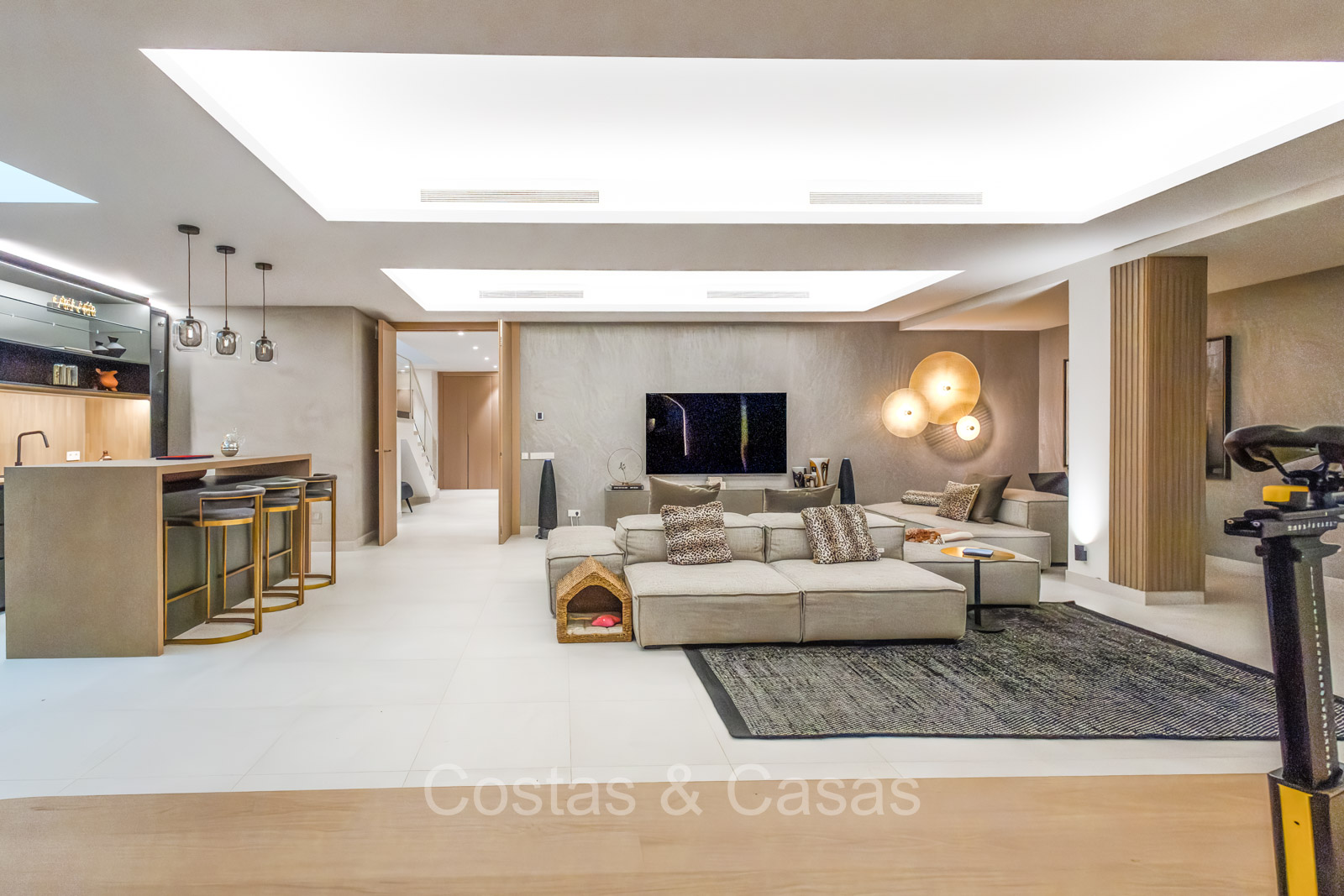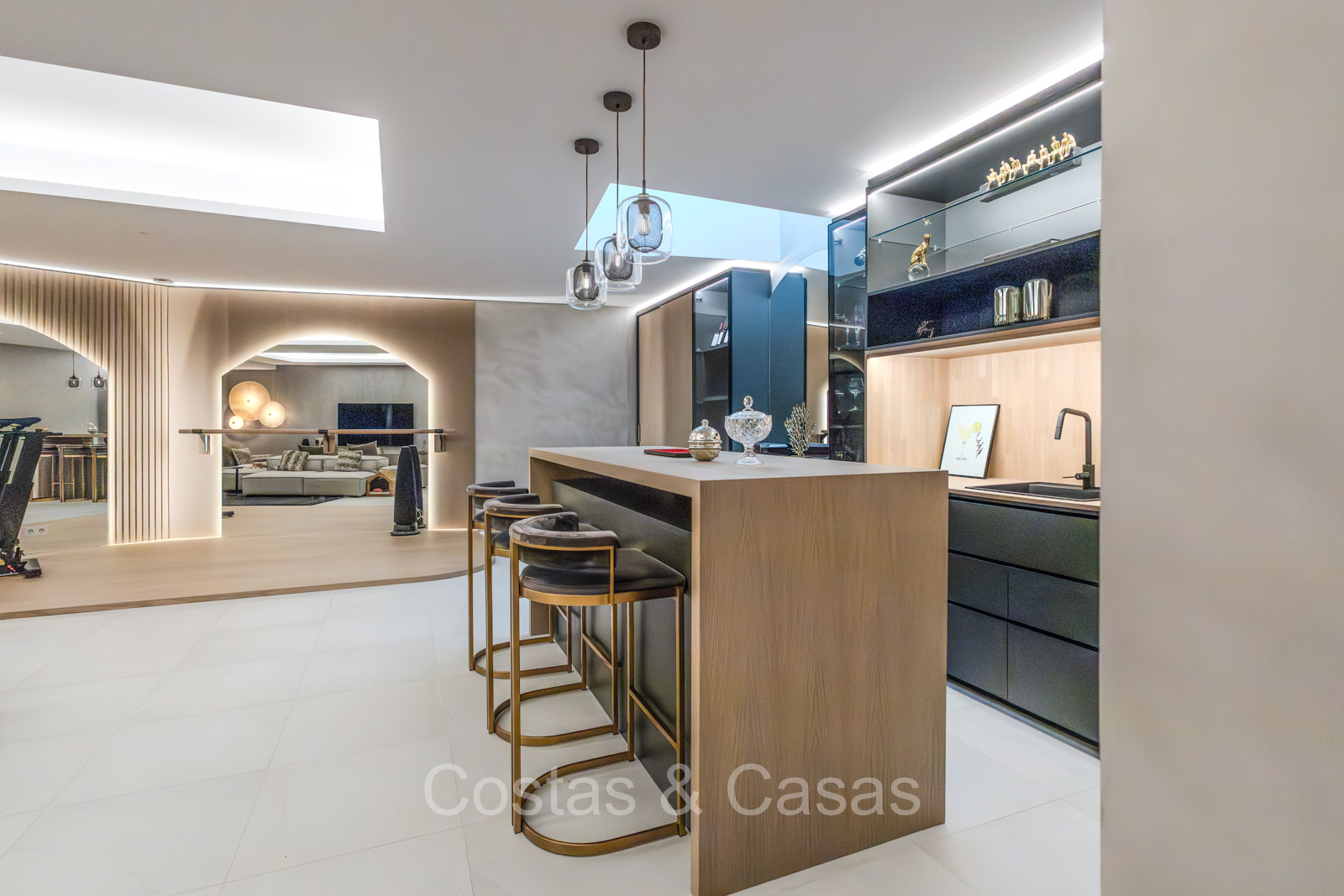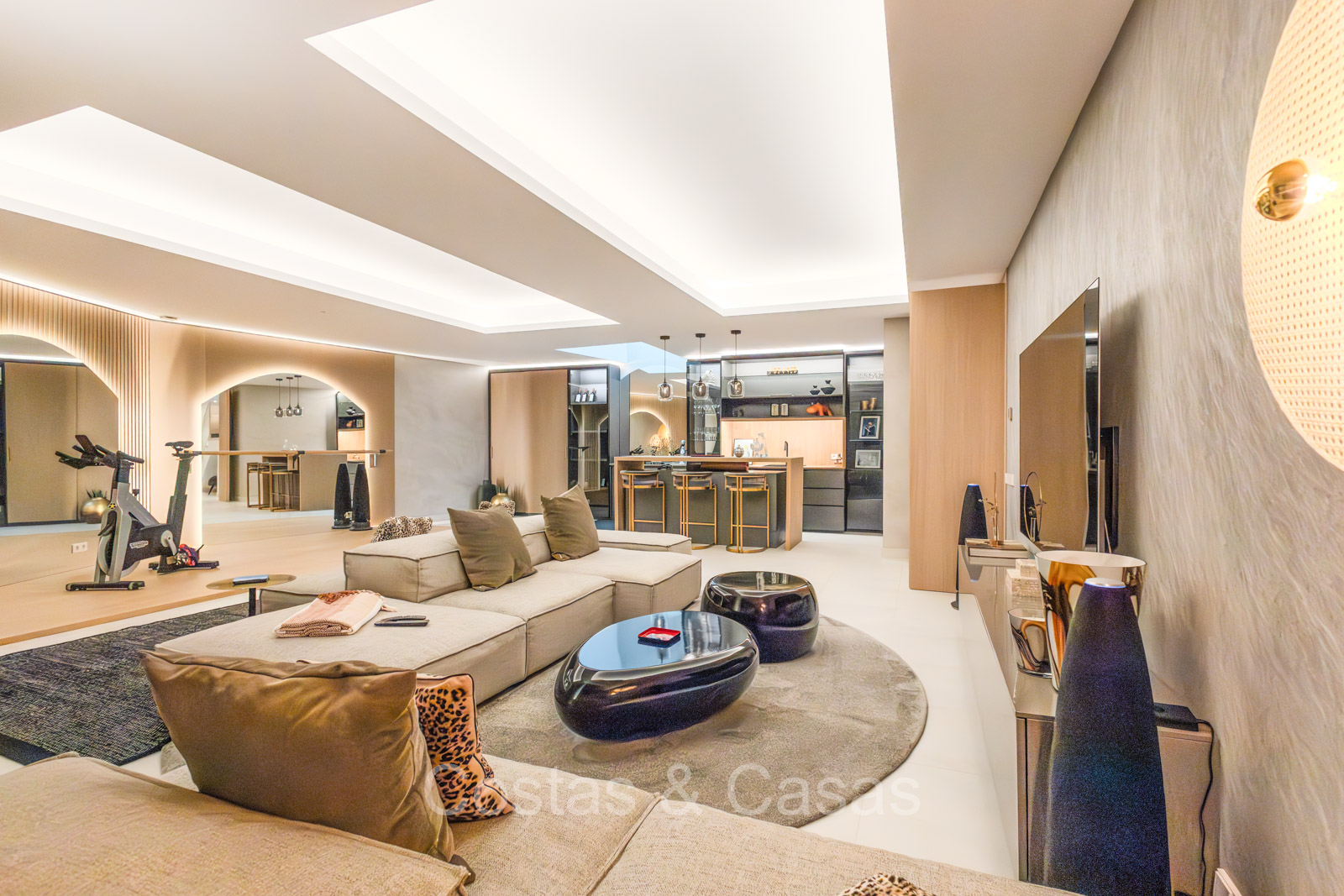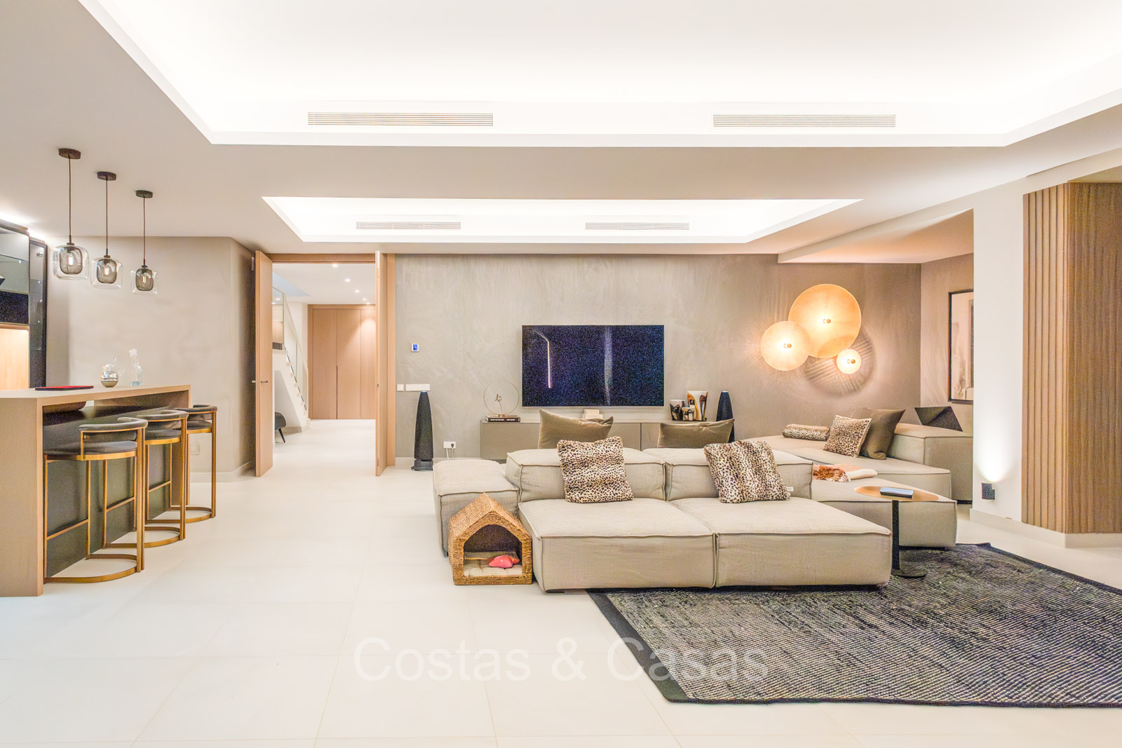 De open plan leefruimte biedt een sfeervolle TV-lounge, met centraal een glazen wijnbodega die een elegante en charmante uitstraling geeft aan het geheel.
