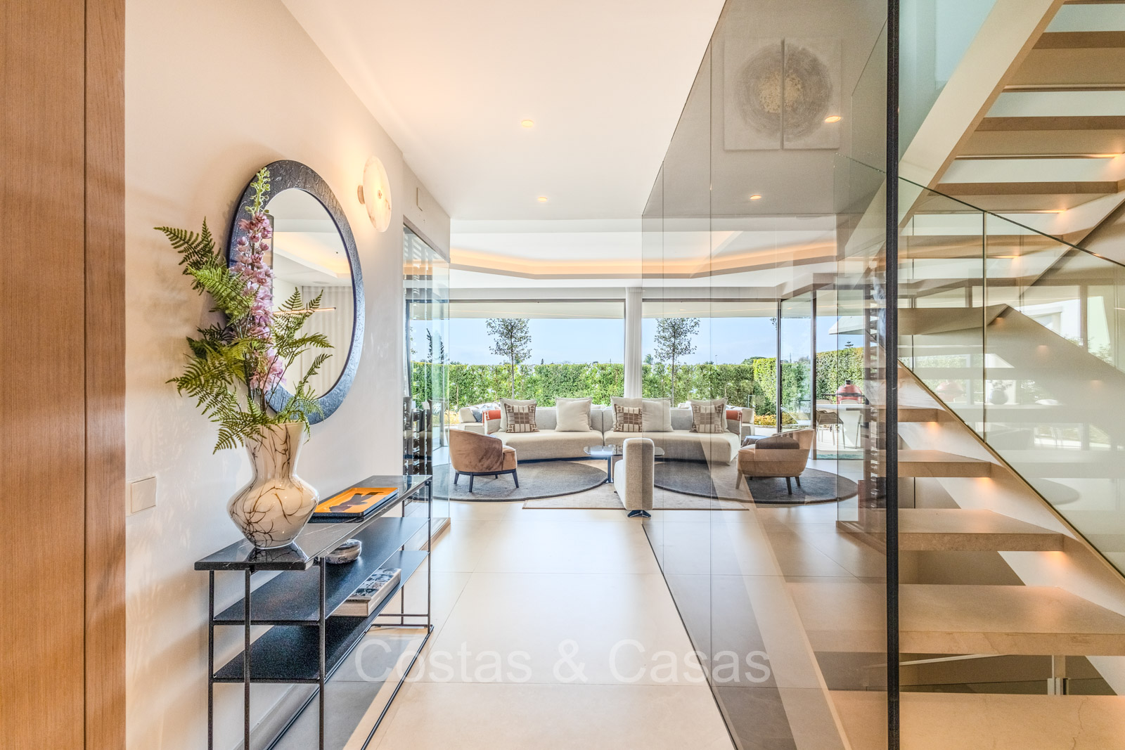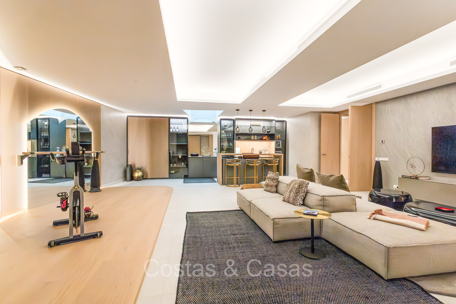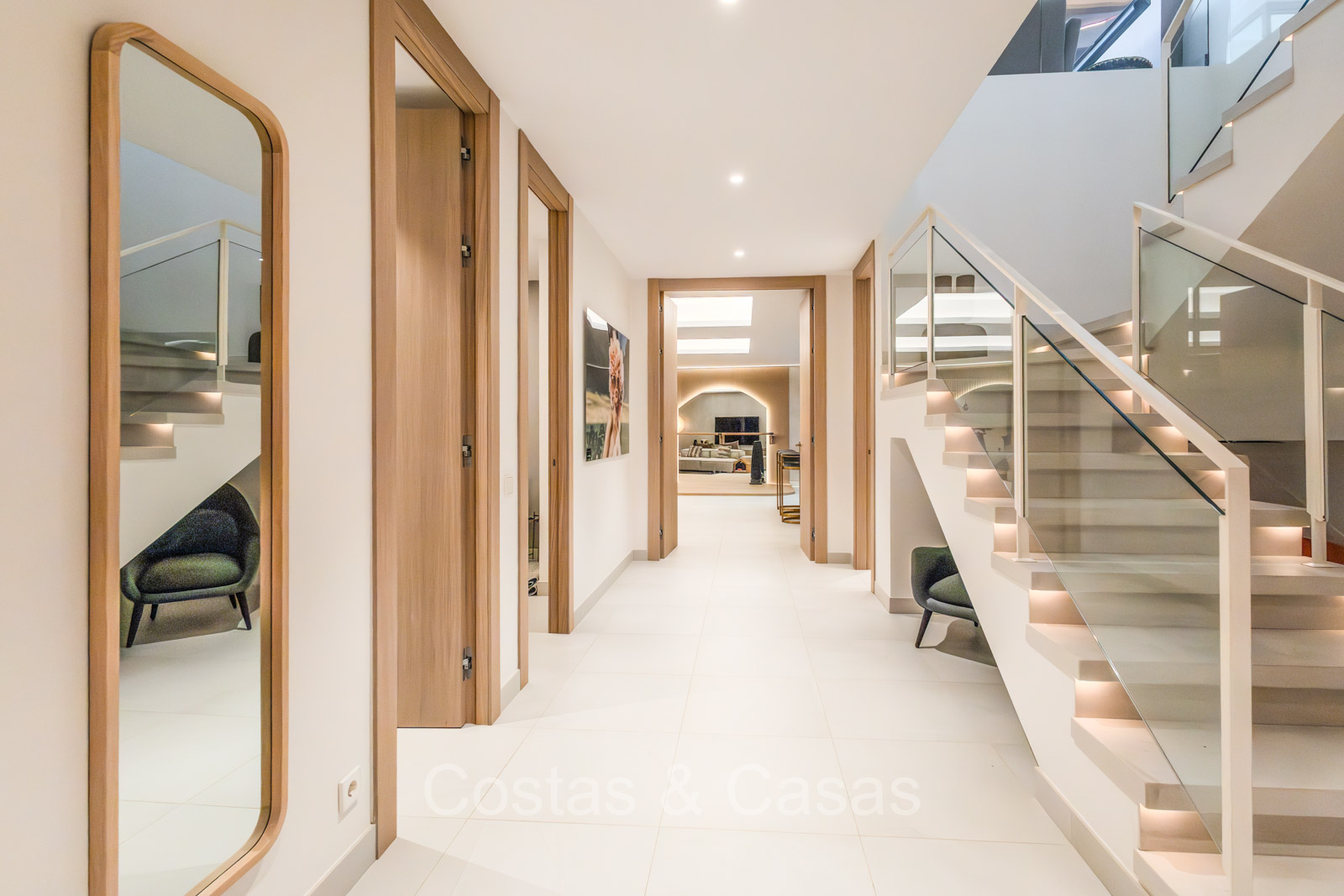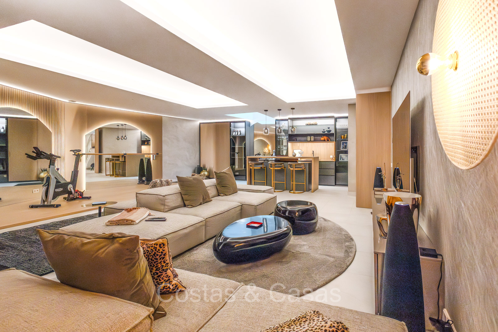 De open plan leefruimte biedt een sfeervolle TV-lounge, met centraal een glazen wijnbodega die een elegante en charmante uitstraling geeft aan het geheel.