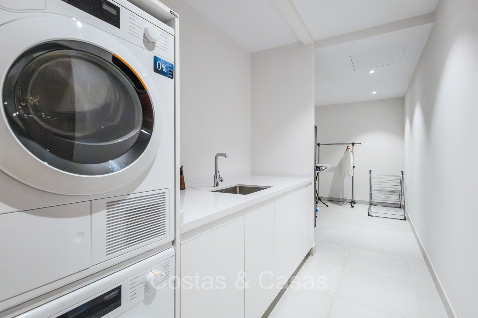Wasruimte met wasmachine, droger en strijkruimte.