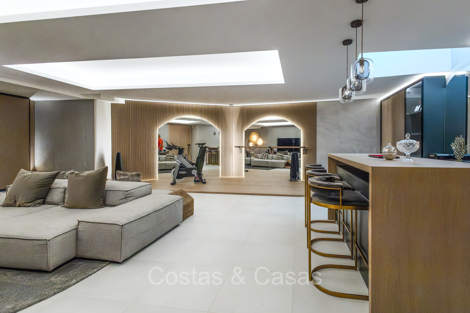 De benedenverdieping is gewijd aan recreatie en ontspanning, met een sfeervolle ruimte die een speelhoek en bar combineert, en daarnaast een gezellige TV-lounge biedt voor sociale momenten.