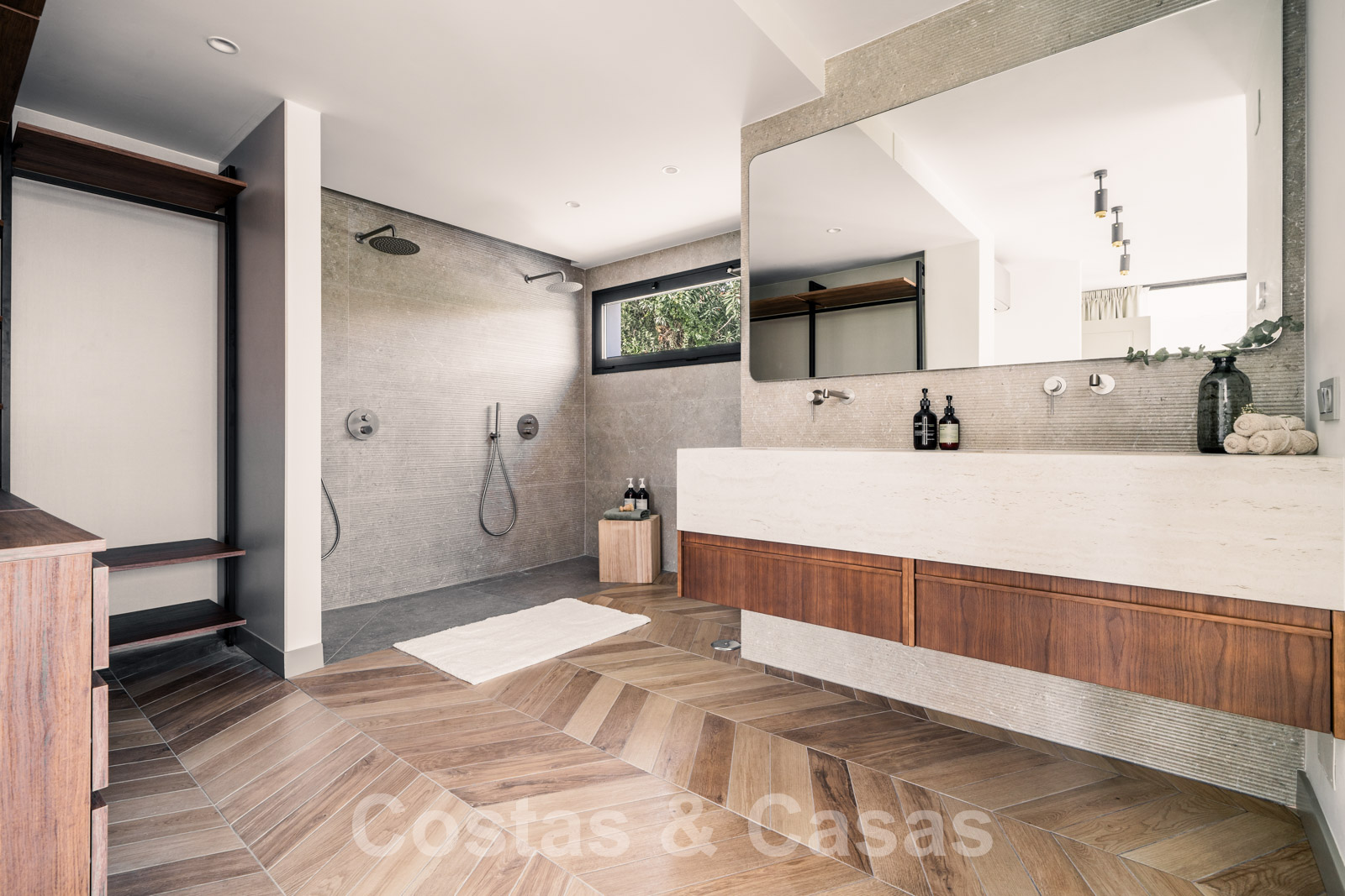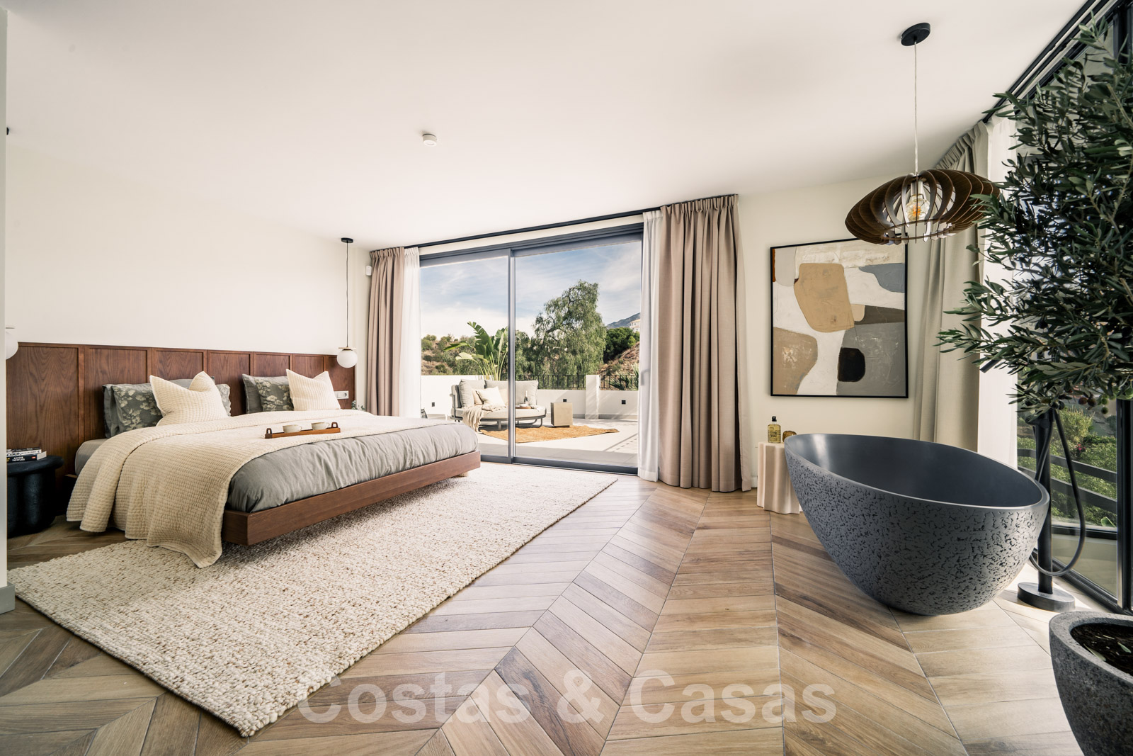 De master suite voorziet een open badkamer en een privéterras.