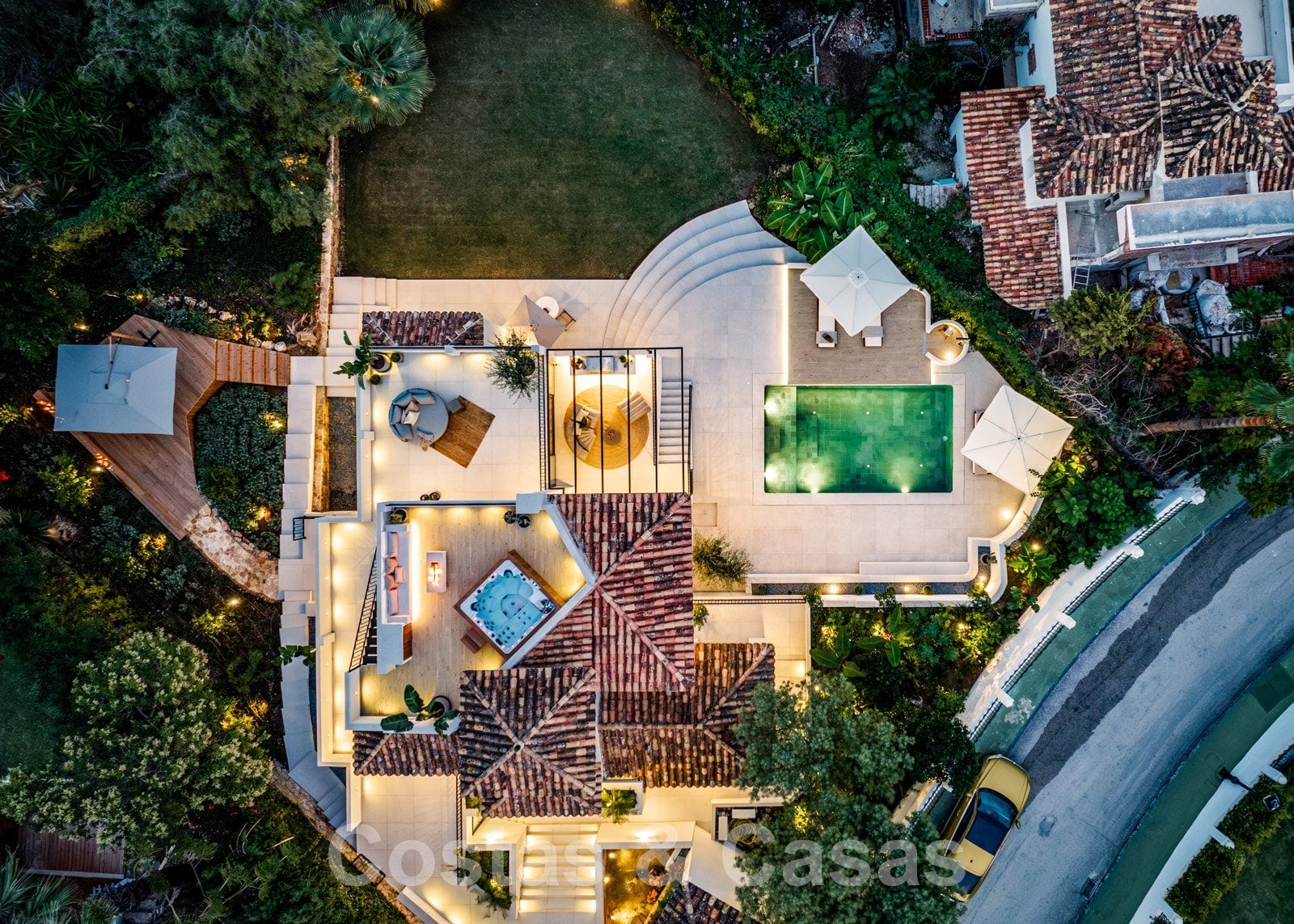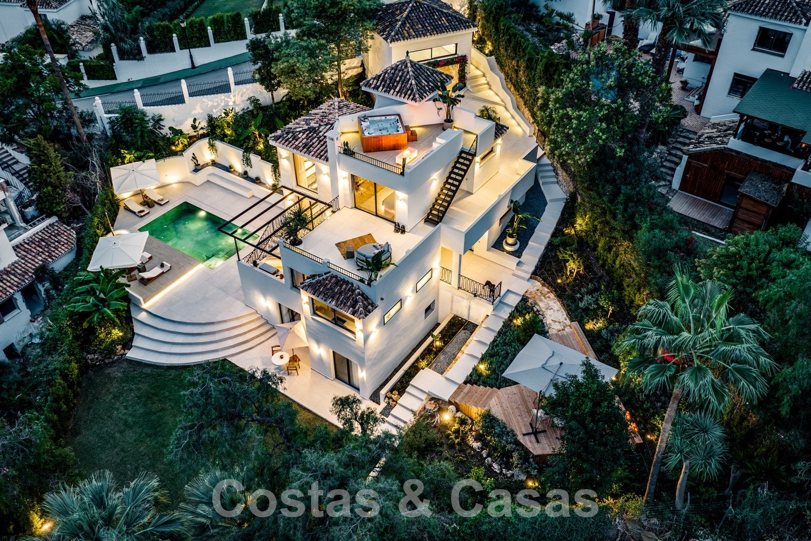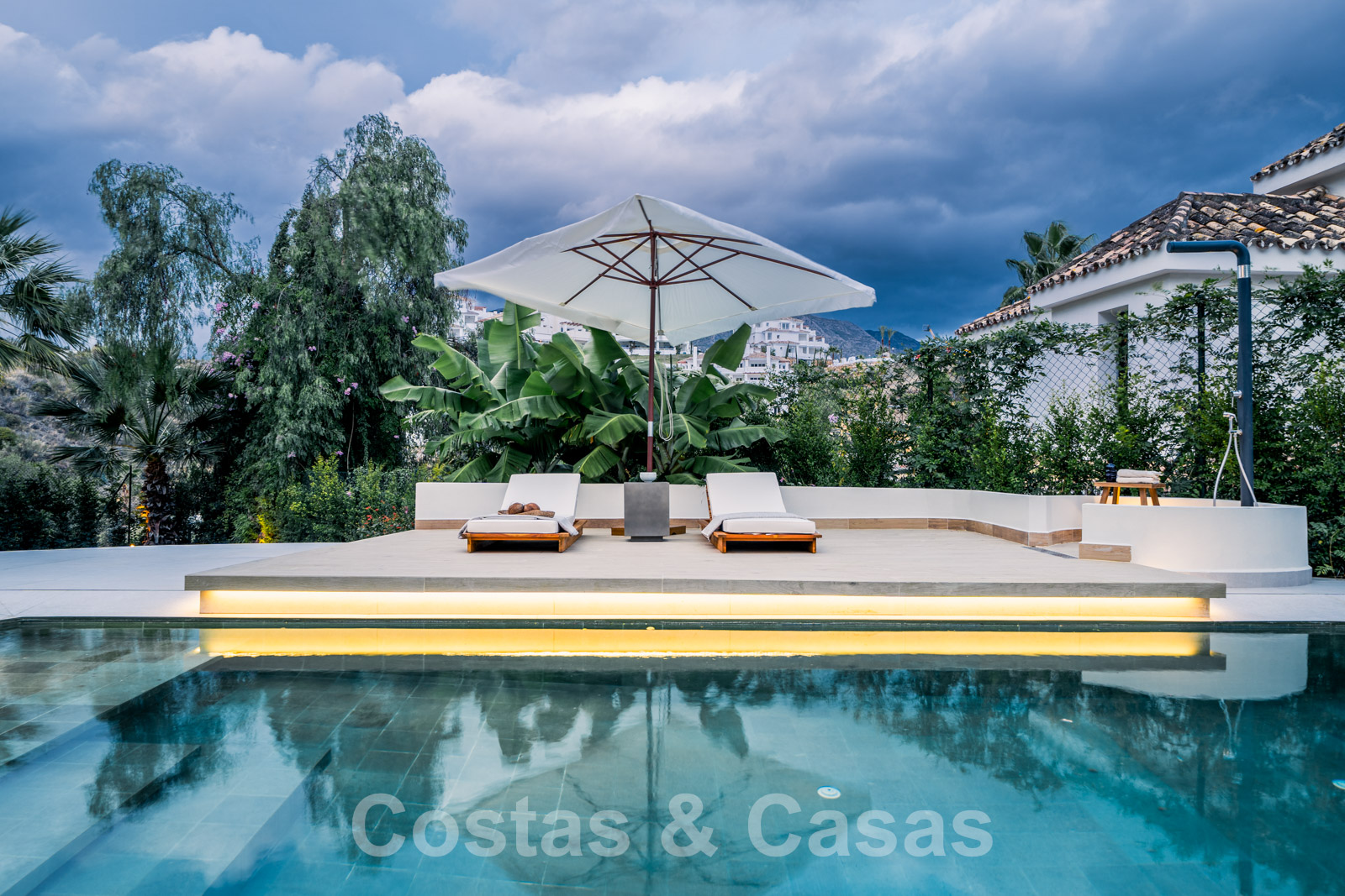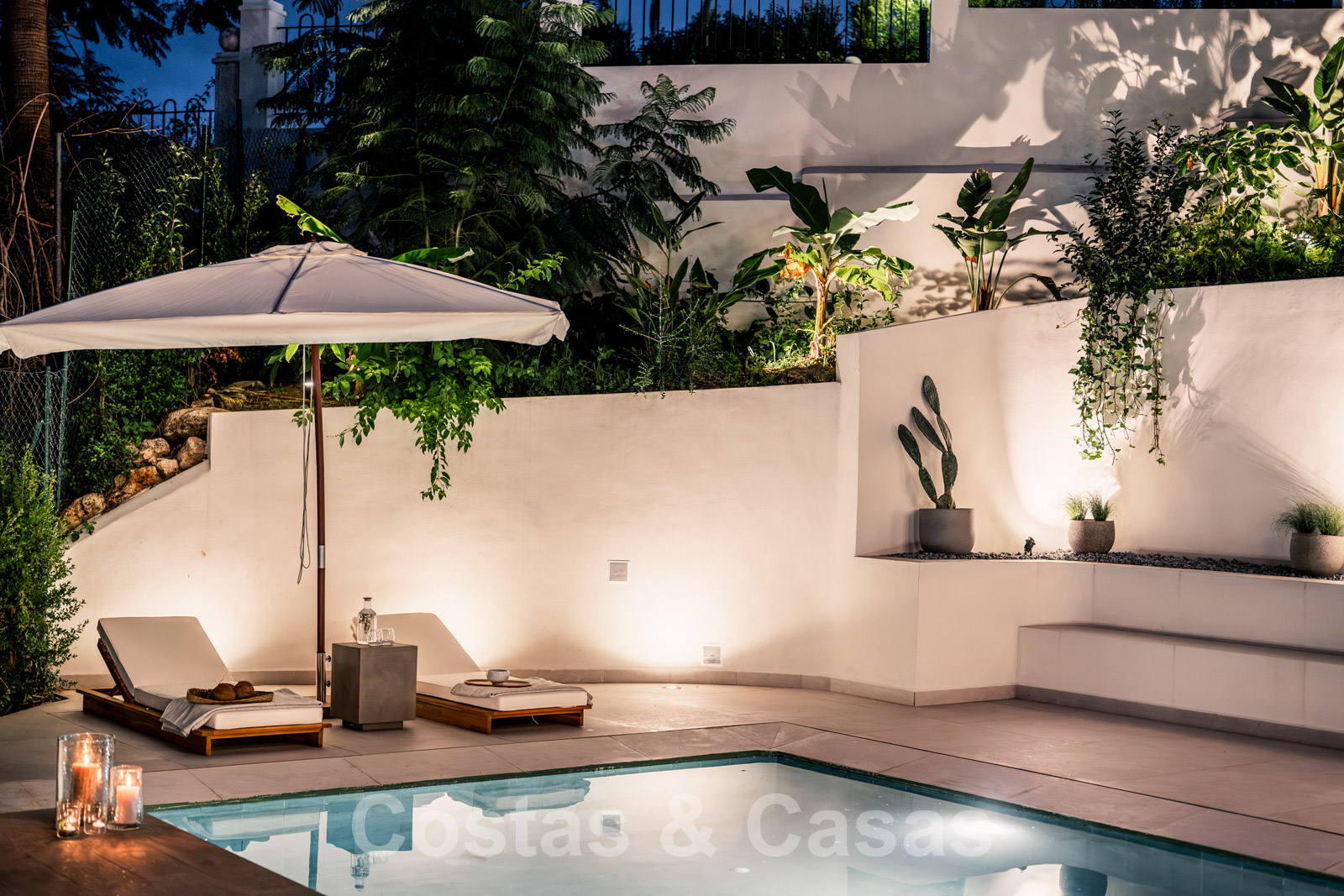 Ingebouwd privézwembad met ledverlichting omgeven door zonneterrassen.