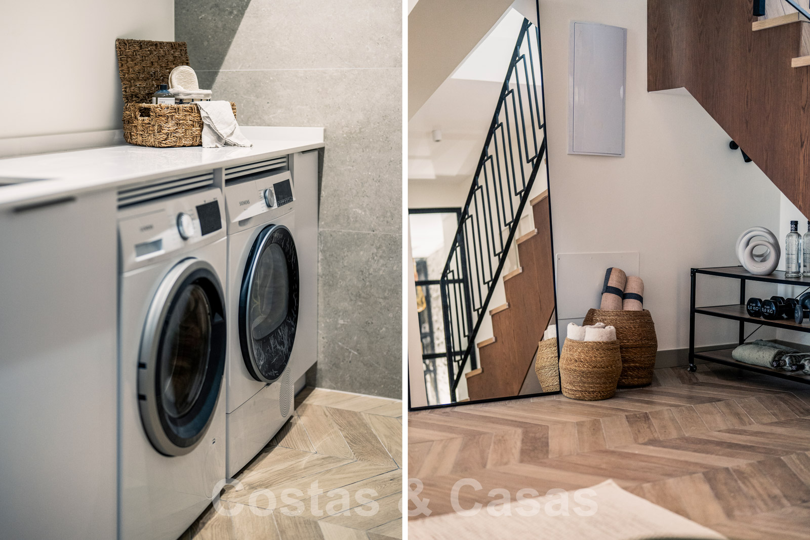 Keramische parketvloeren in visgraadstijl.