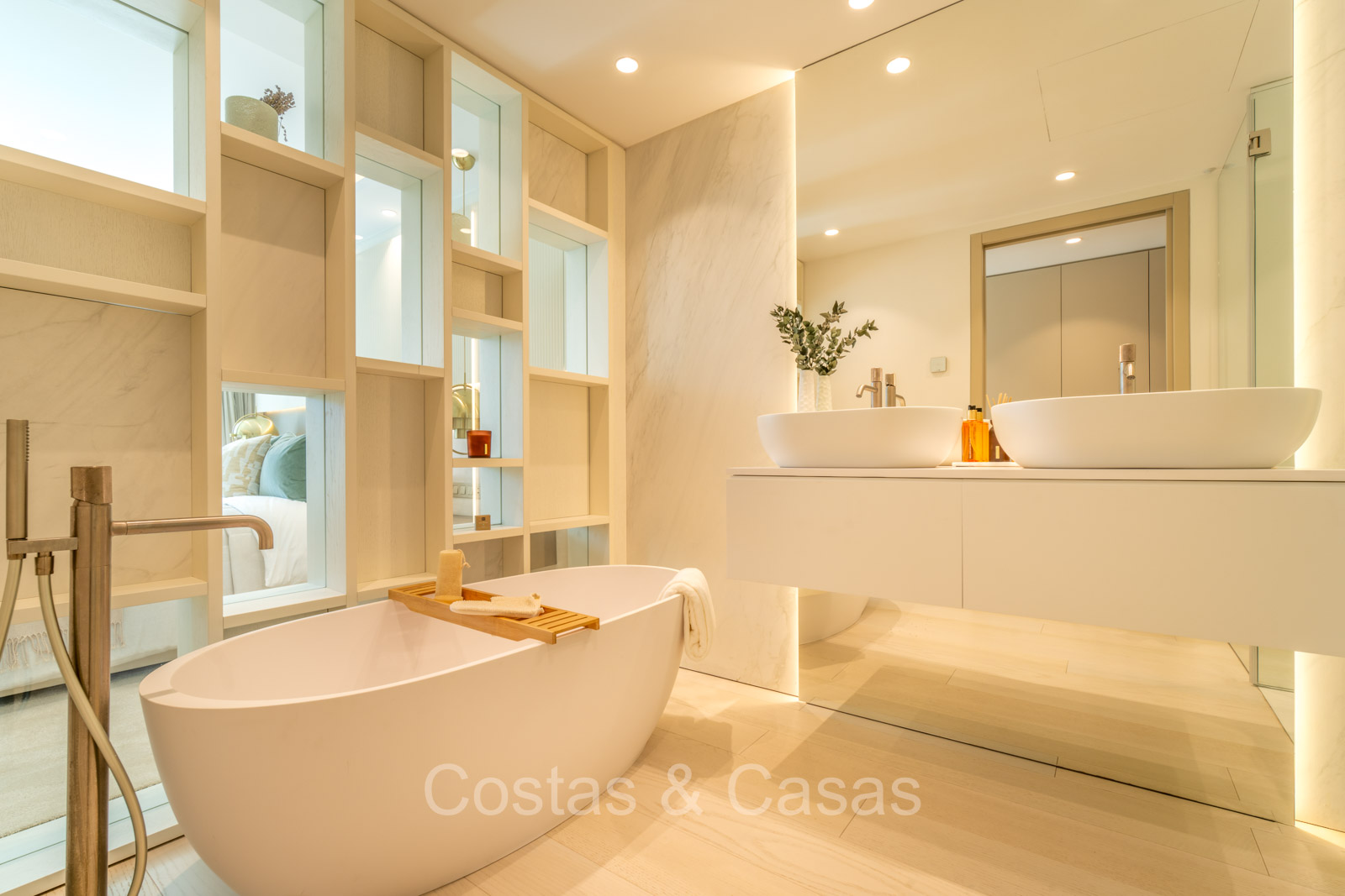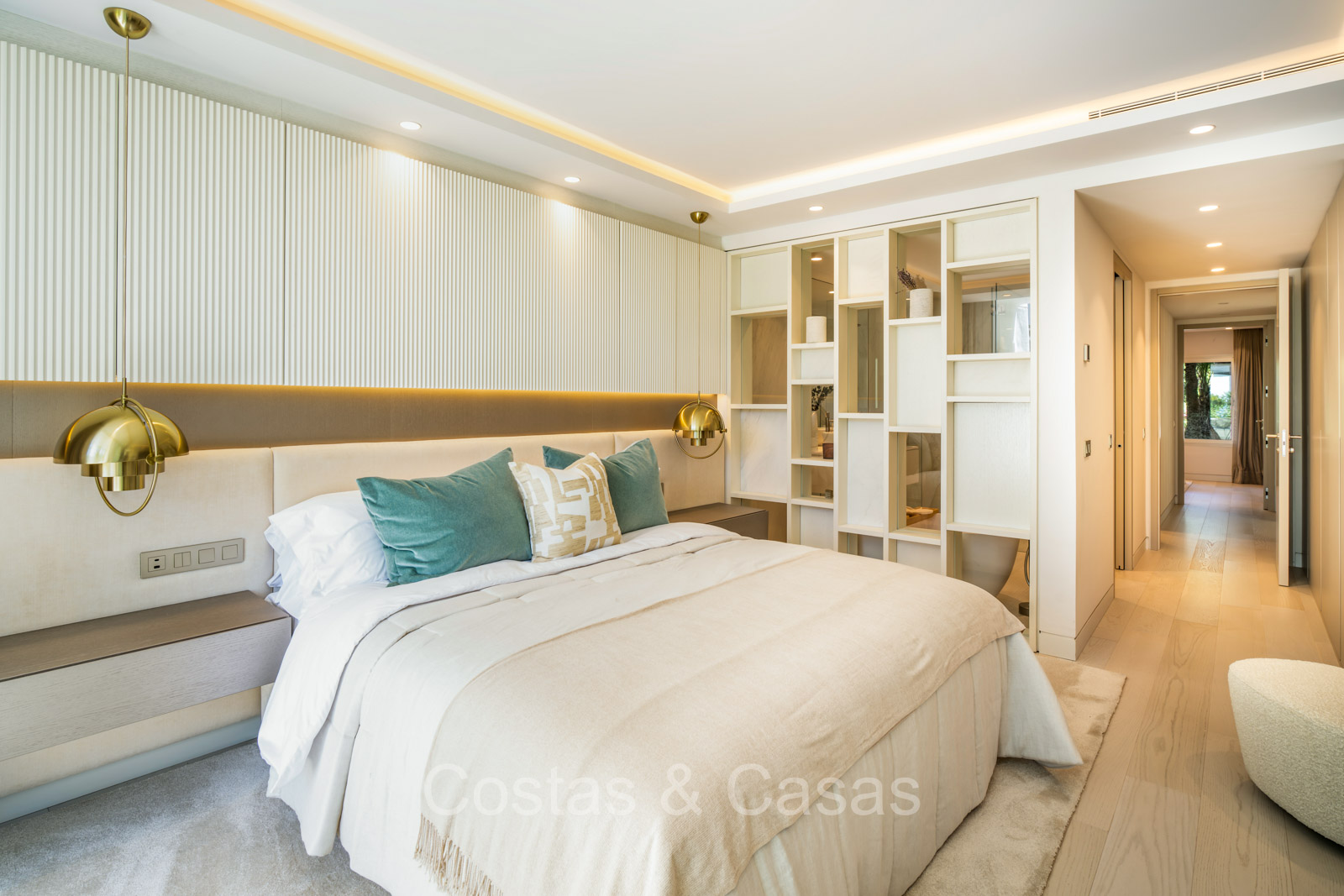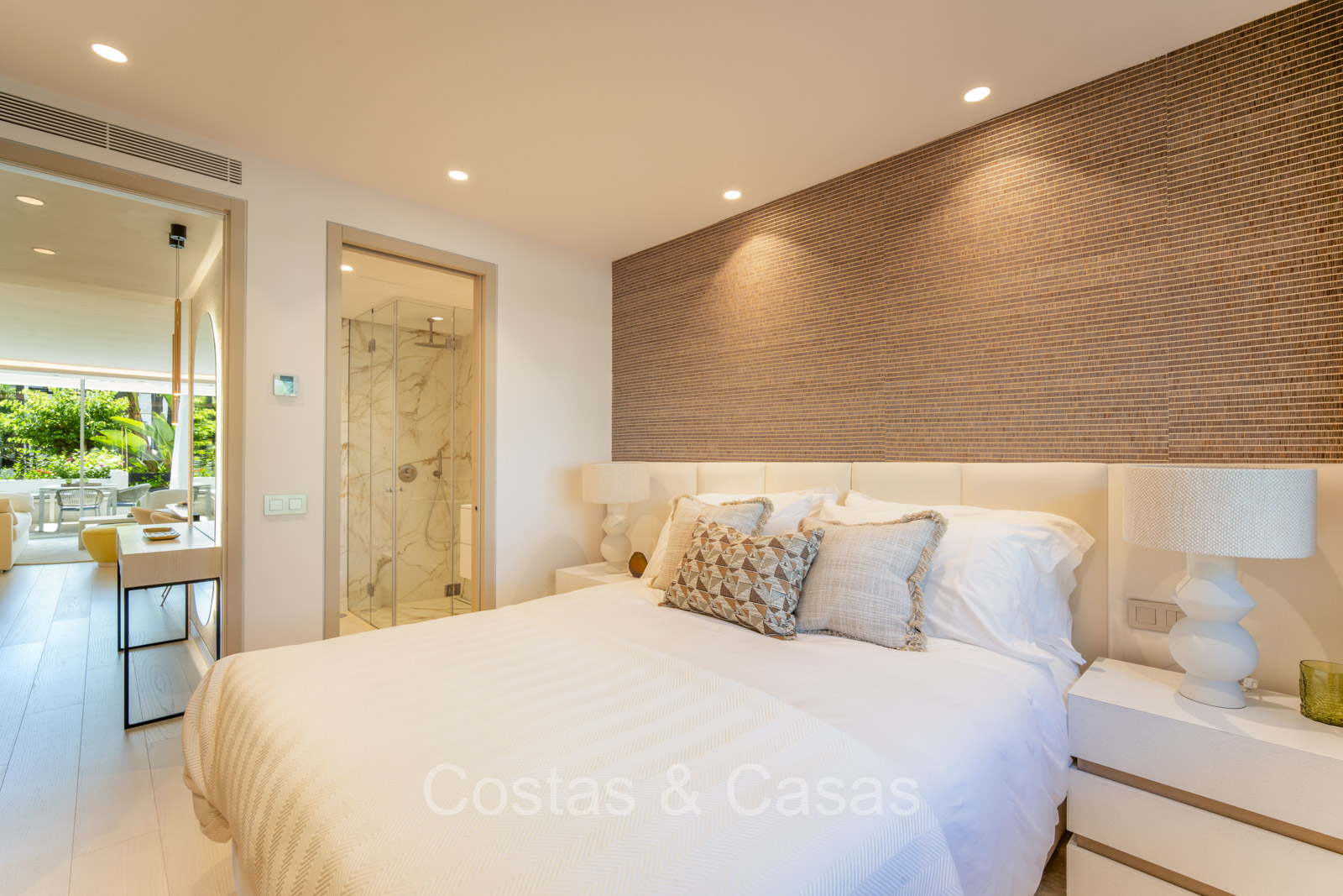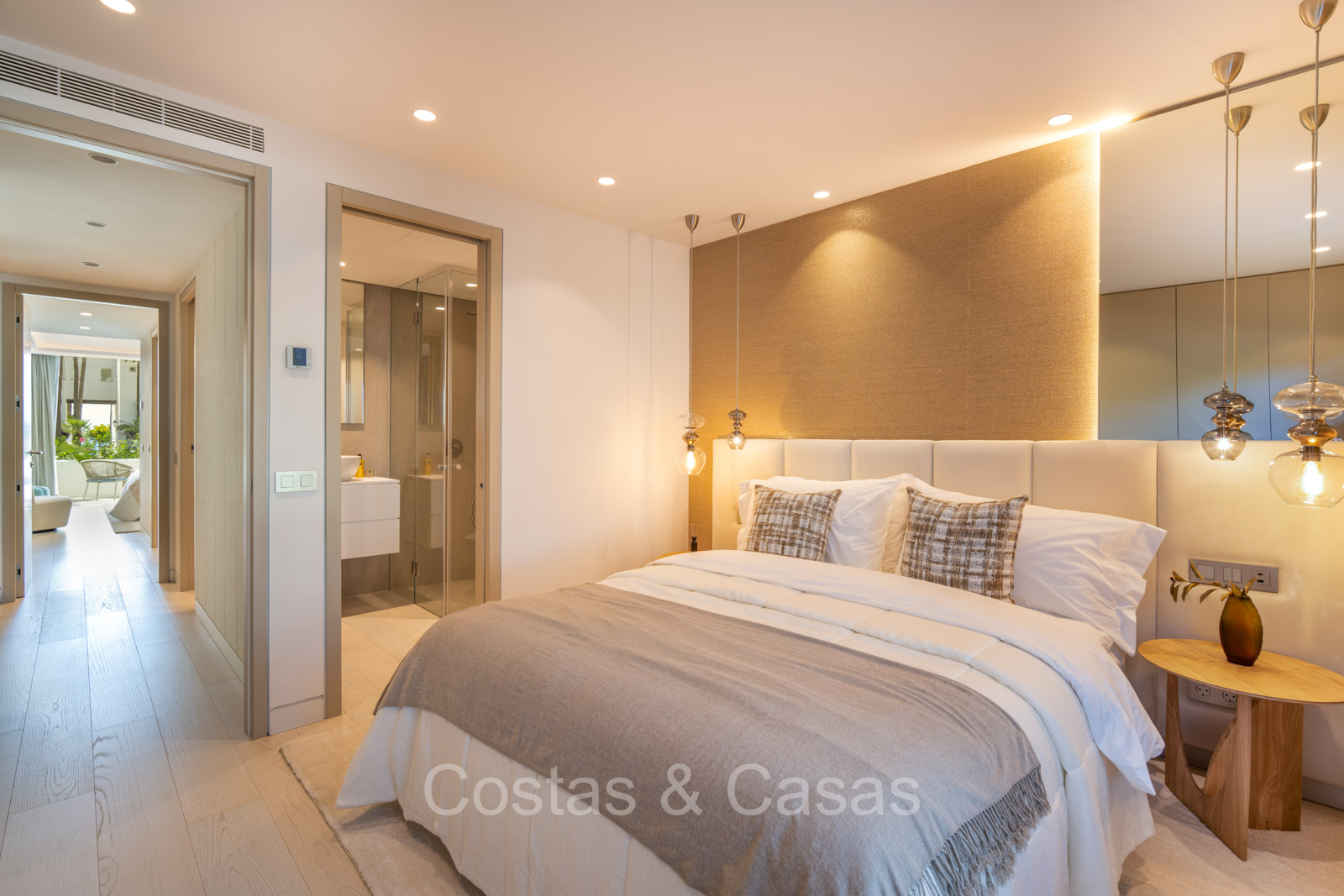 De master suite biedt een directe toegang tot het terras en heeft een luxe en-suite badkamer met een dubbele wastafel, vrijstaand bad en inloopdouche.