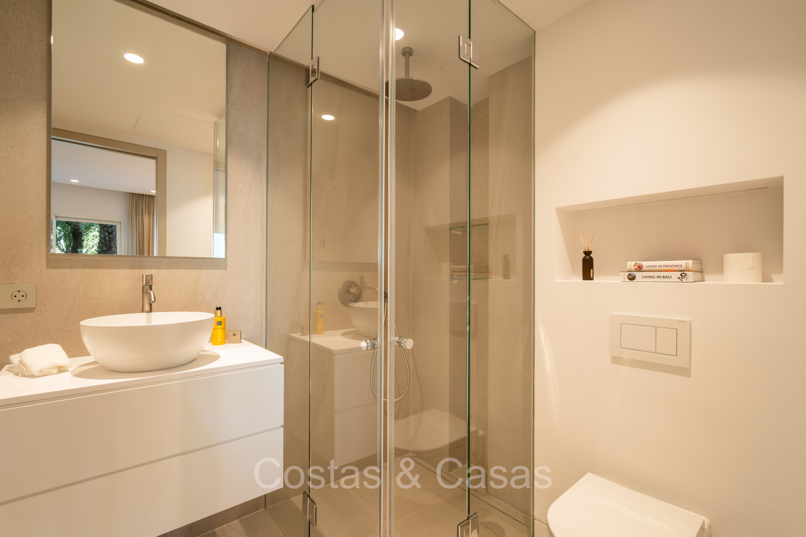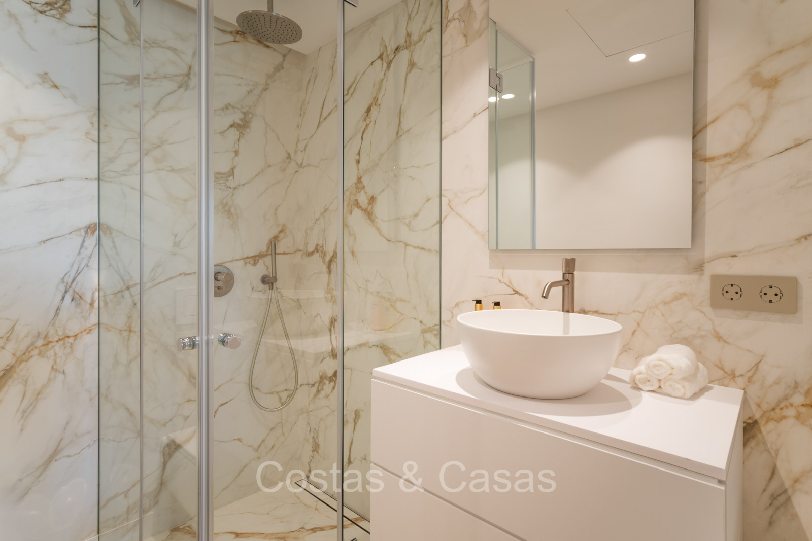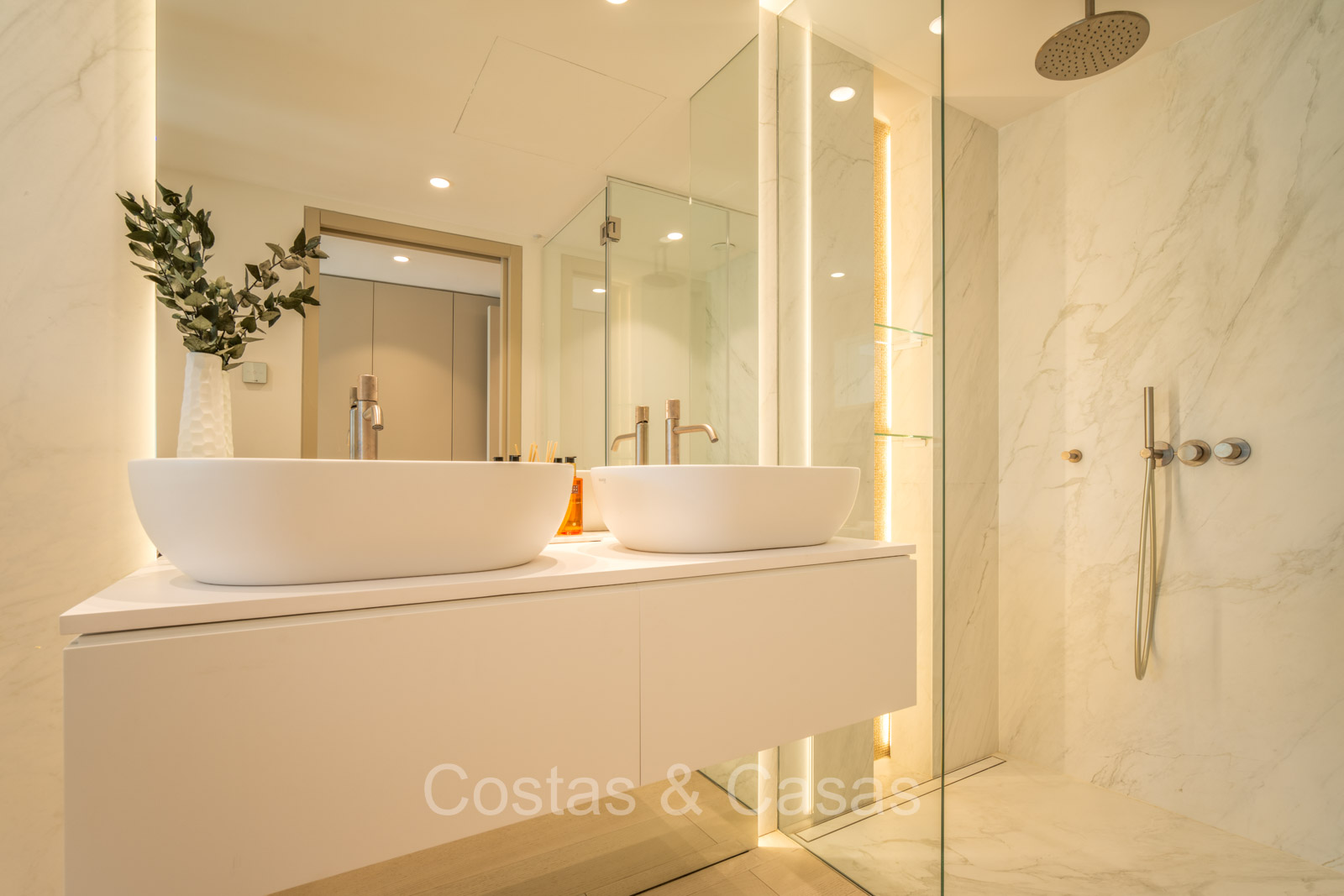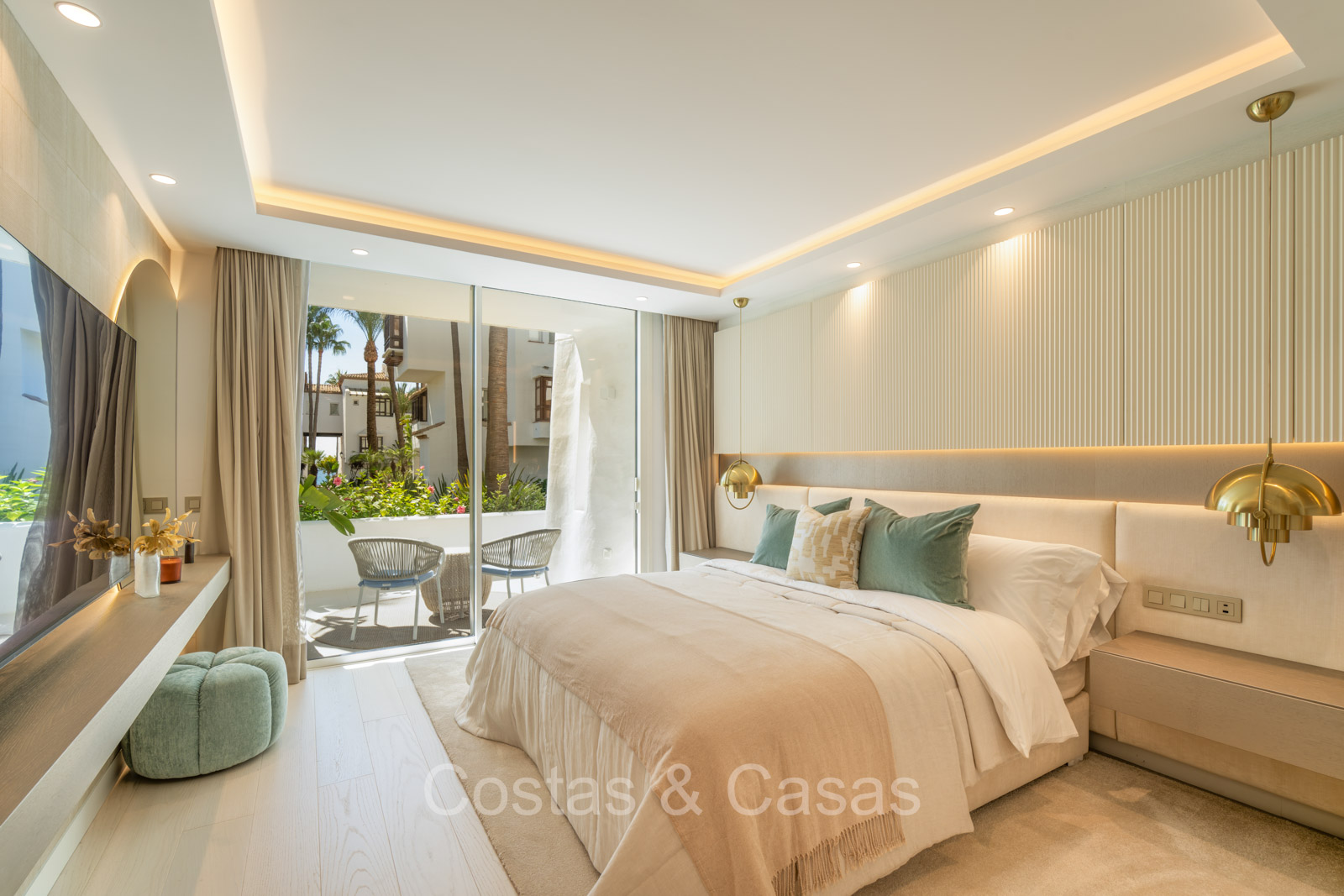 De master suite biedt een directe toegang tot het terras en heeft een luxe en-suite badkamer met een dubbele wastafel, vrijstaand bad en inloopdouche.
