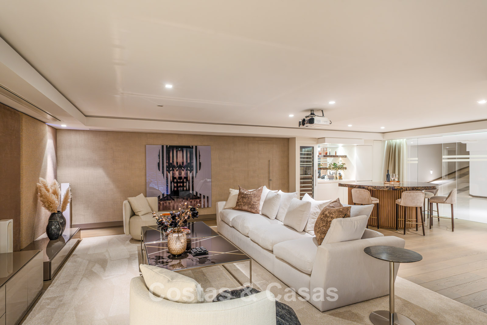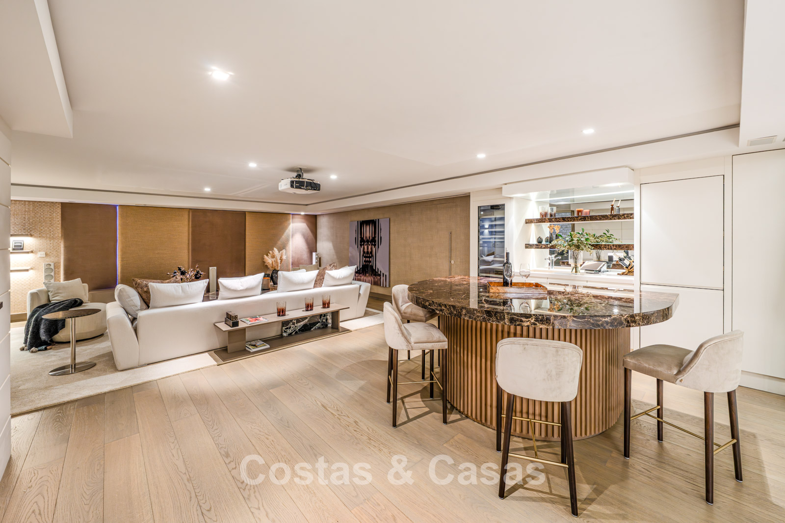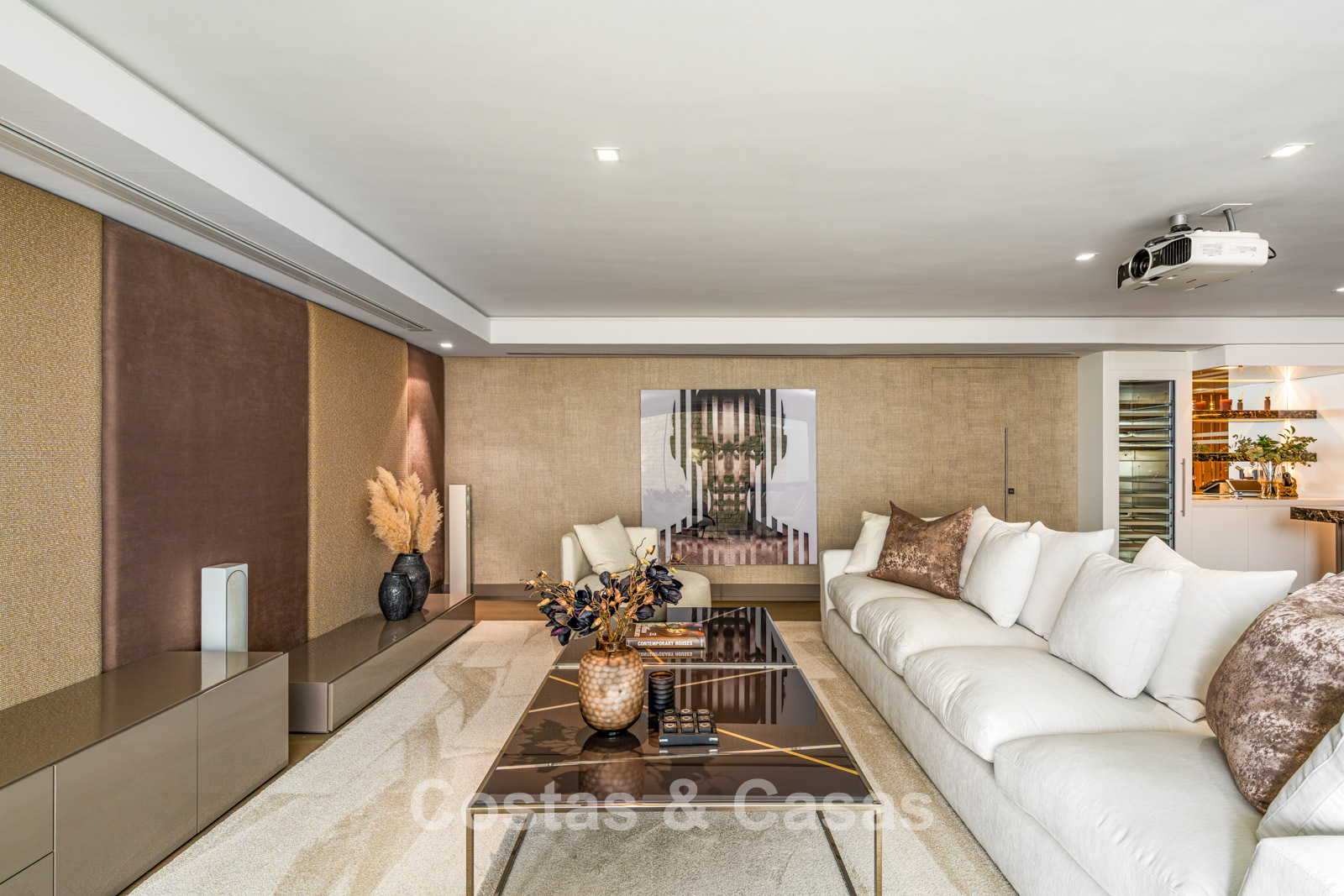 Op de benedenverdieping is er een home cinema met projector en een bar.