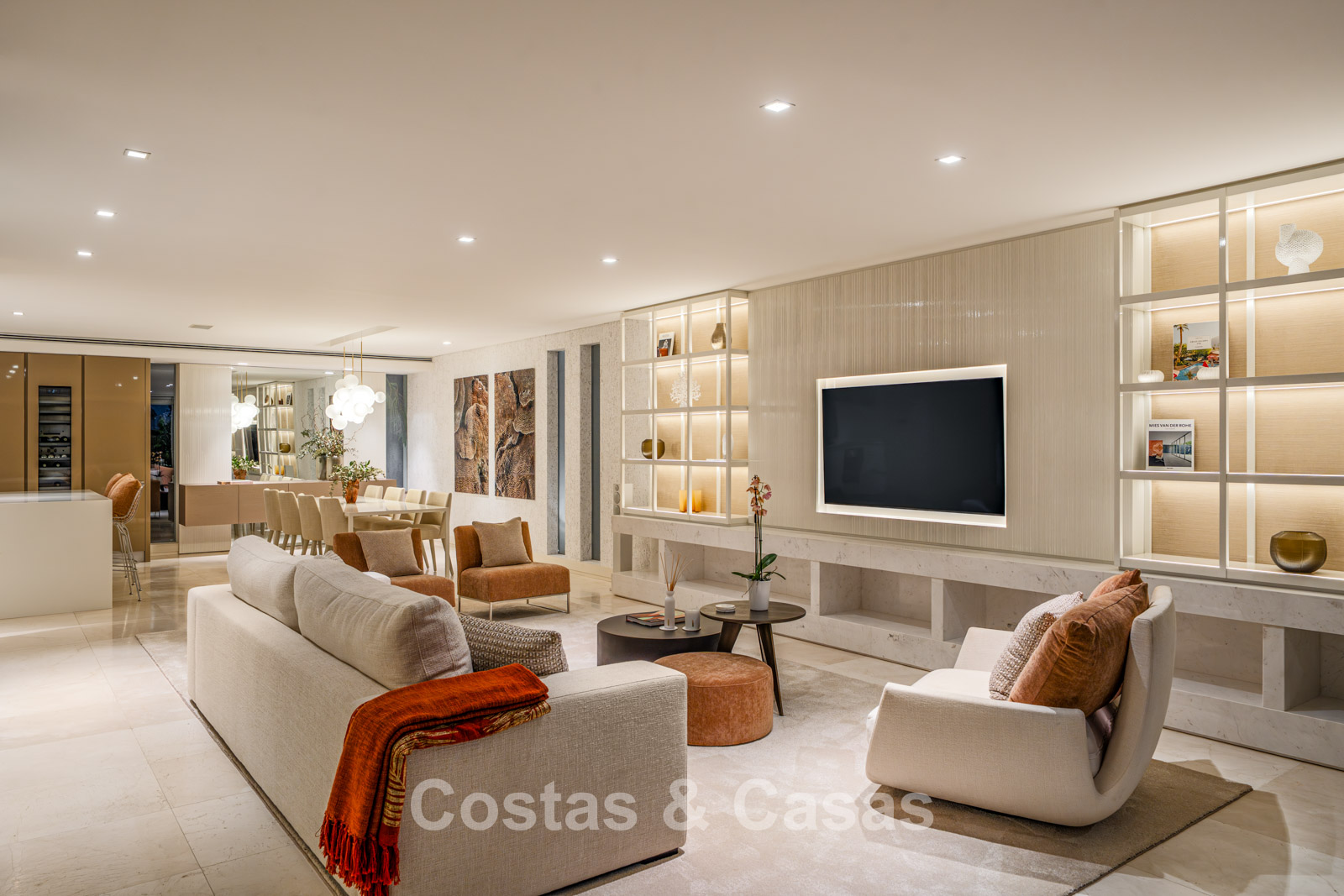 Elegant interieurdesign met crèmekleurige vloeren en trendy meubelstukken.