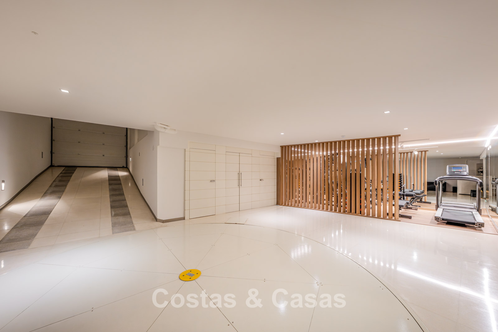 Inpandige garage met draaiplatform, voorzien van ruimte voor 2 auto’s.