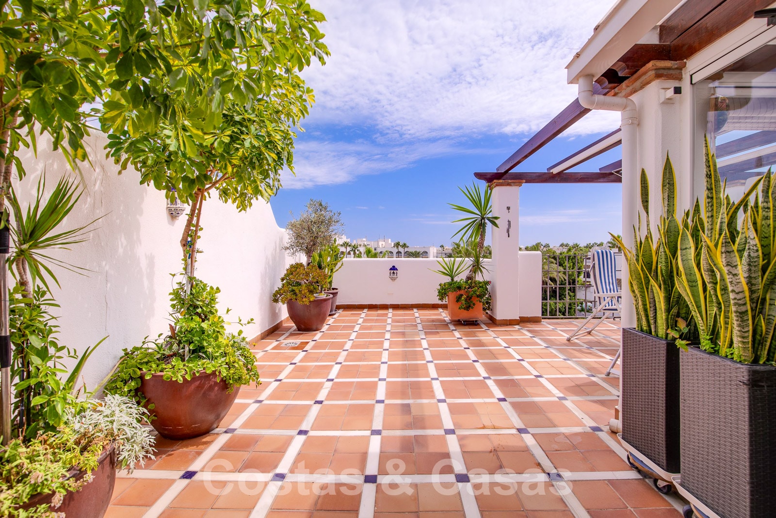 Duplex penthouse met een groot dakterras in een traditioneel wooncomplex.