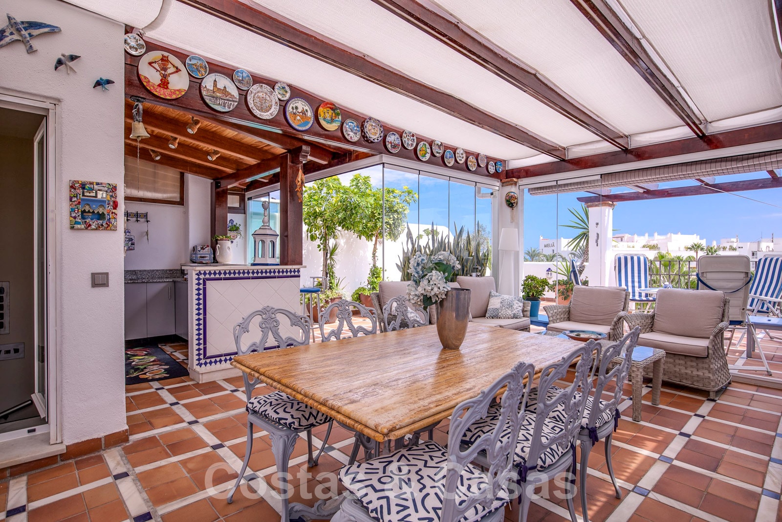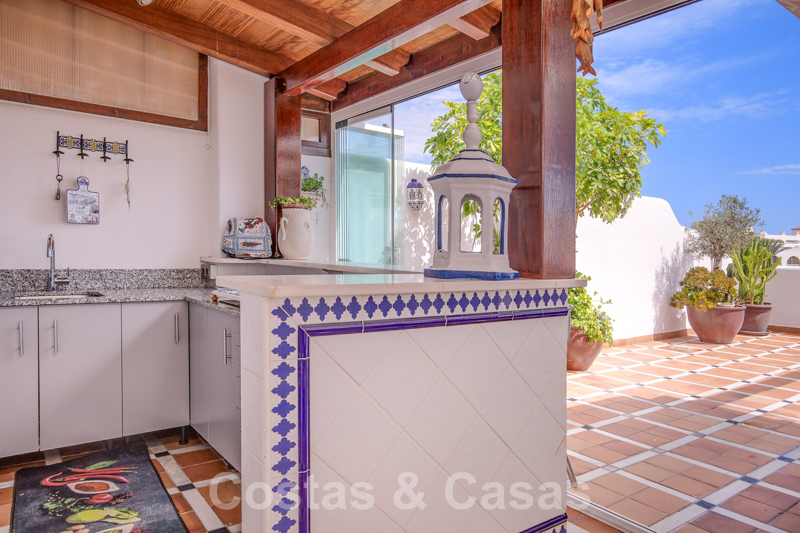 Het uitgestrekt dakterras voorziet open en overdekt zones uitgerust met een buitenkeuken/ bar, barbecue, eettafel, TV lounge en chill-out voorzieningen.