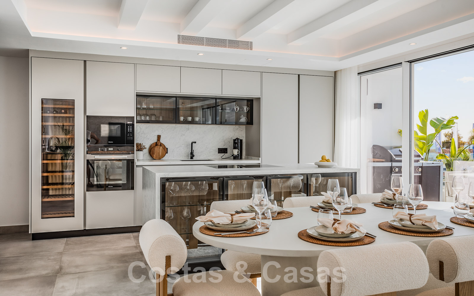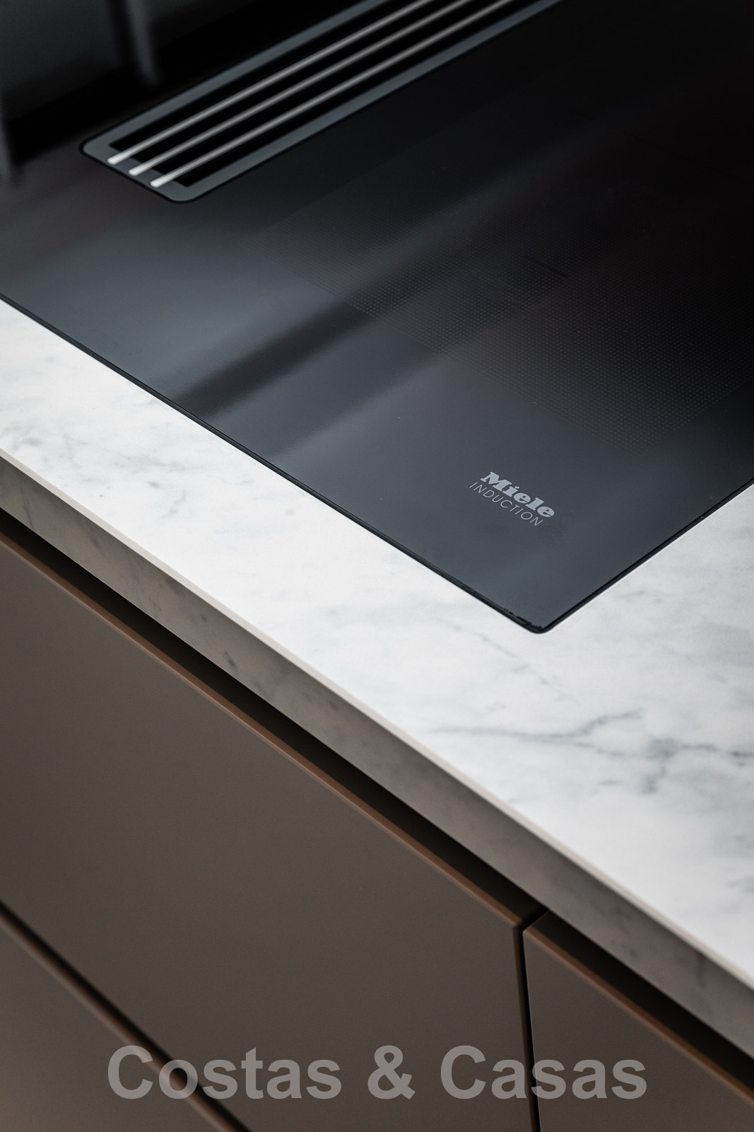 Moderne woonkeuken, volledig geëquipeerd met Miele toestellen en een kookeiland.