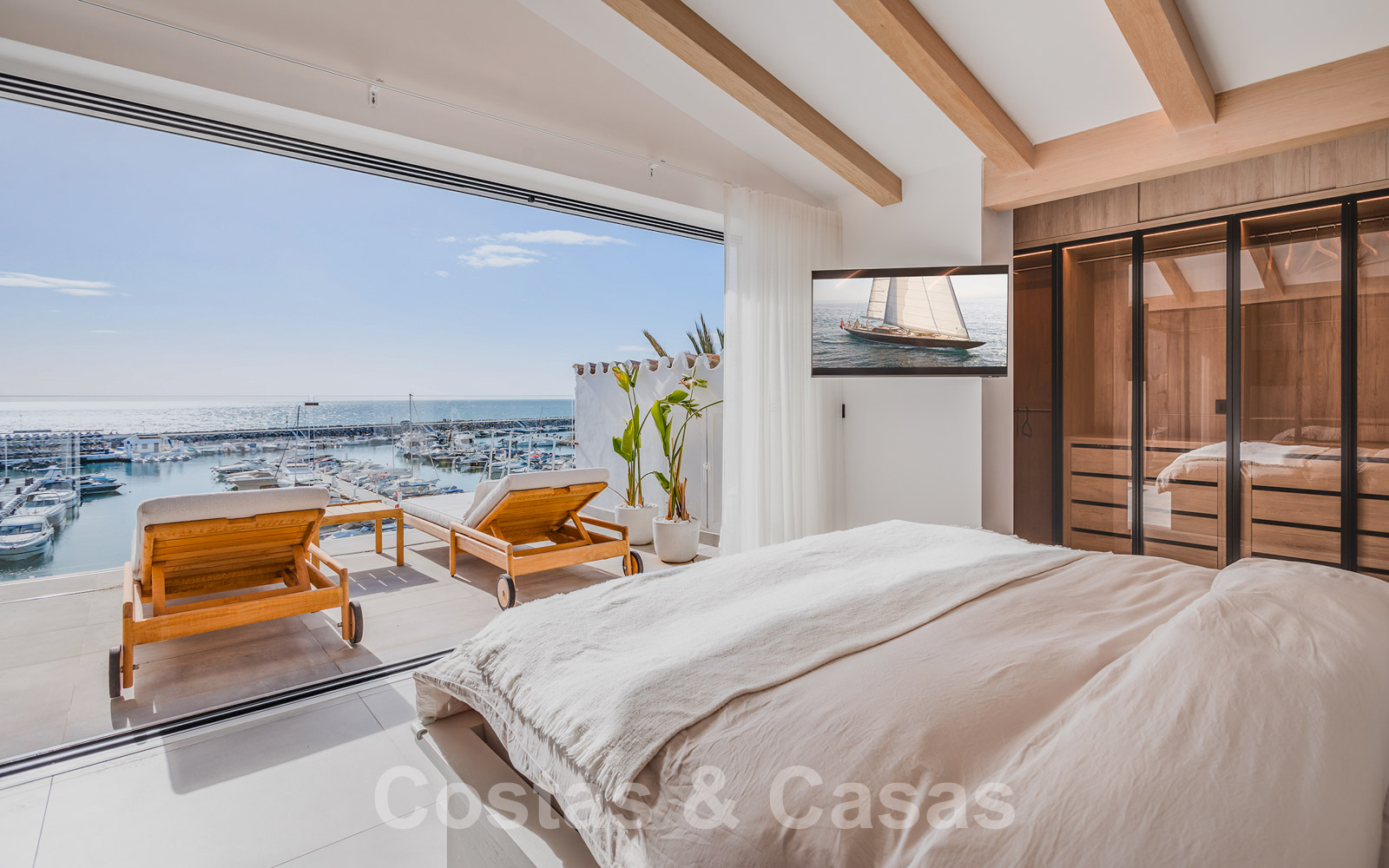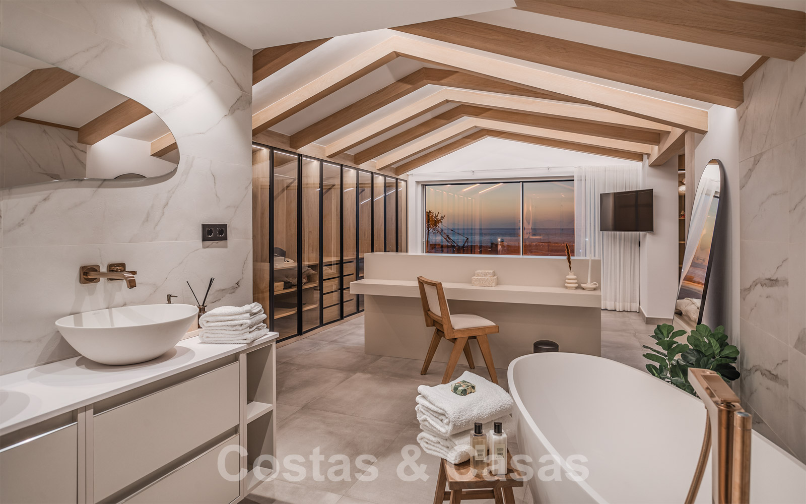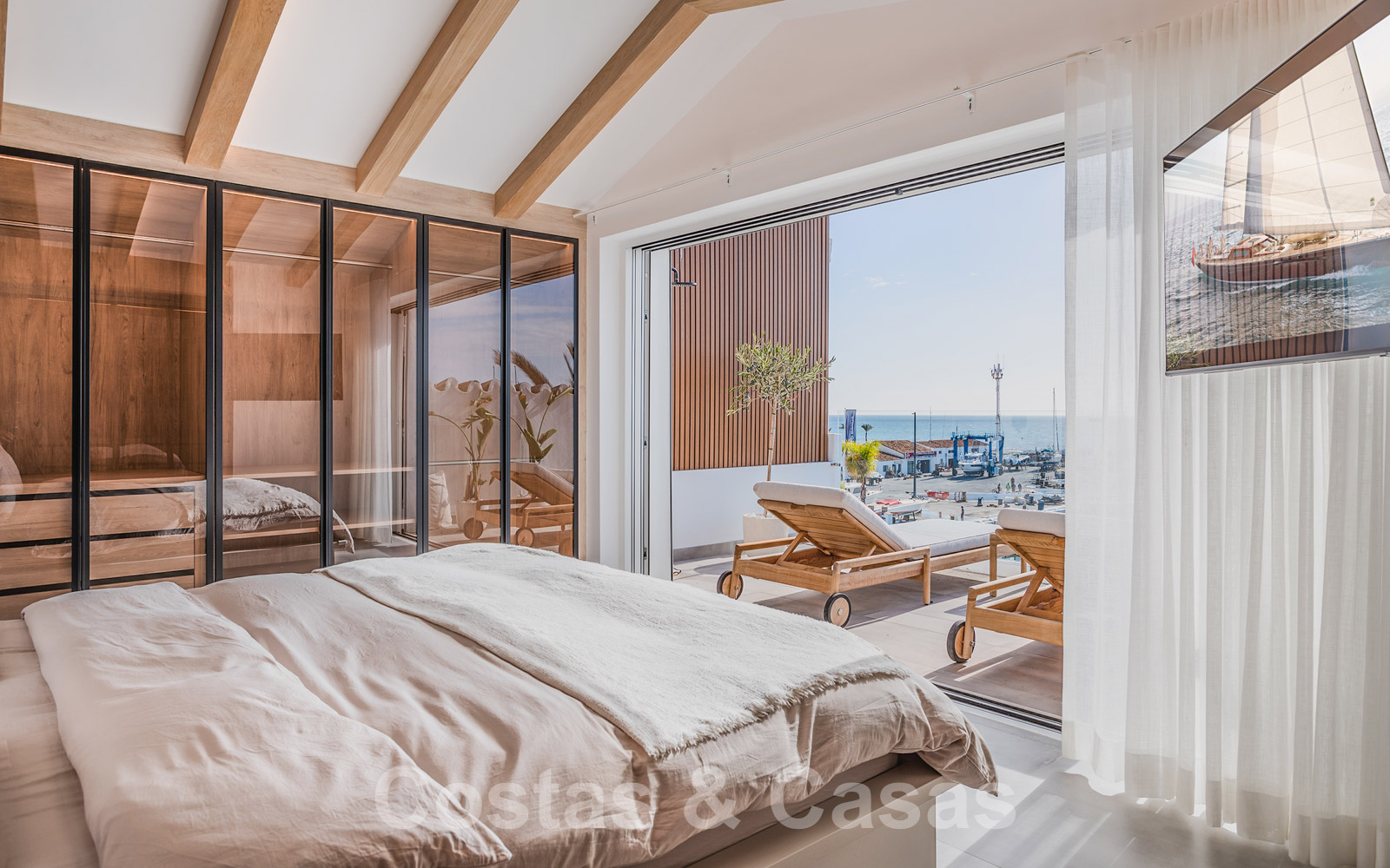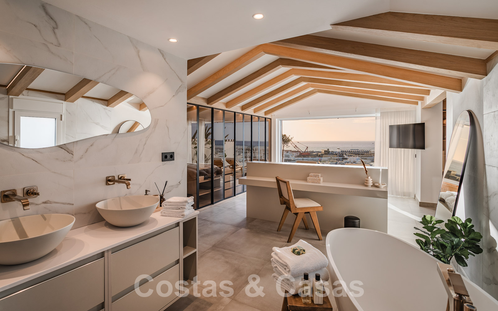 De elegante hoofdslaapkamer op de bovenverdieping geniet van een open badkamer en een naadloze overgang naar het privéterras.
